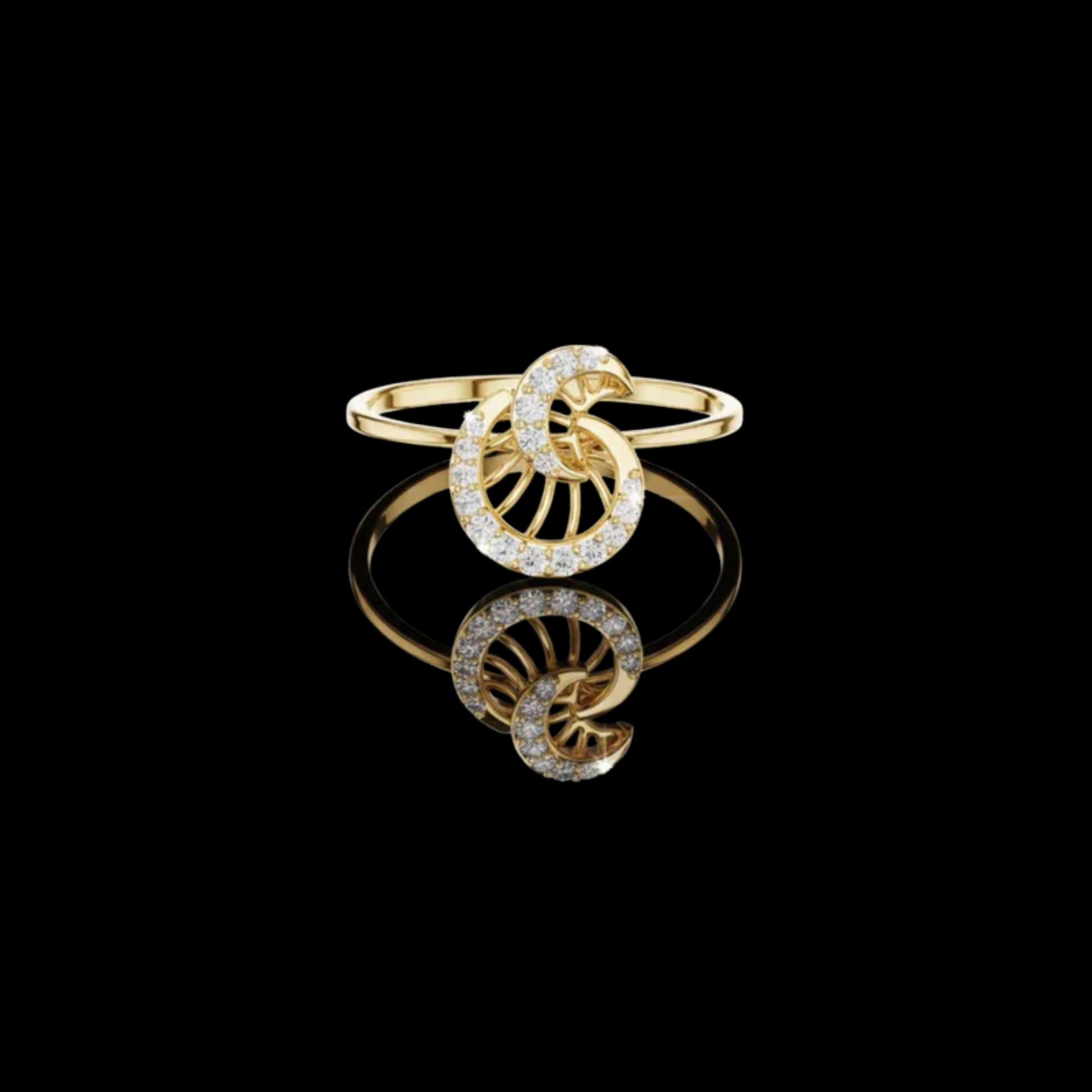 This captivating ring features a striking spiral motif, gracefully crafted in luxurious and adorned with a halo of brilliant-Round cut diamonds. The design evokes the natural elegance of a nautilus shell, symbolizing infinity, growth, and timeless beauty. Its slender band highlights the intricate centerpiece, creating a piece that is both delicate and eye-catching. Perfect for those who appreciate artistic jewelry, this ring seamlessly blends modern sophistication with classic sparkle.
