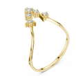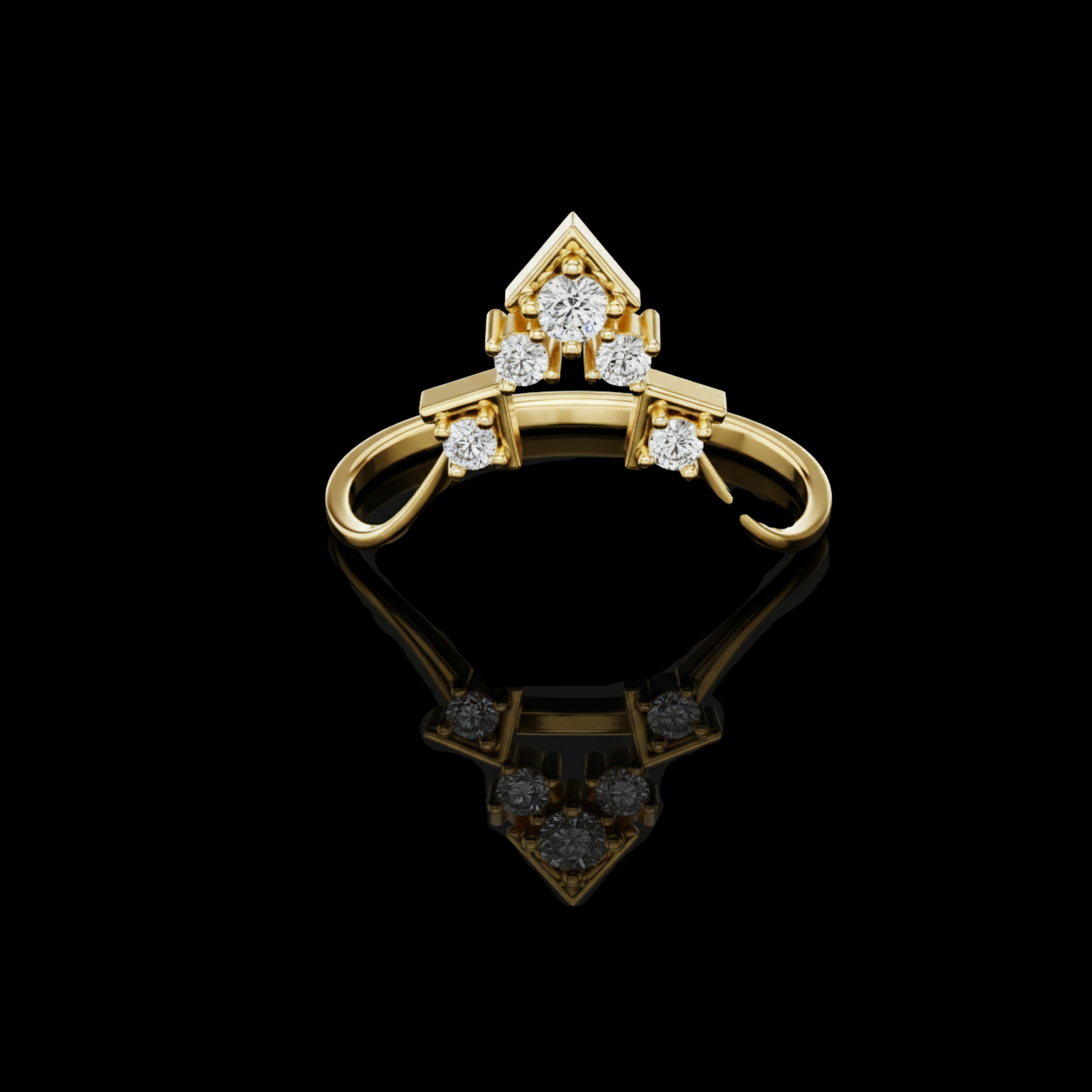 This exquisite piece showcases a graceful crown-inspired design, crafted in luxurious and accented with sparkling brilliant-cut diamonds. The ring features a central cluster of shimmering stones arranged in a regal, triangular formation, complemented by elegantly curved loops that add fluidity and sophistication. Each diamond is securely set in delicate gold prongs, enhancing both brilliance and durability. Perfect for those who appreciate timeless elegance, this ring makes a stunning statement as a standalone adornment or a meaningful gift.