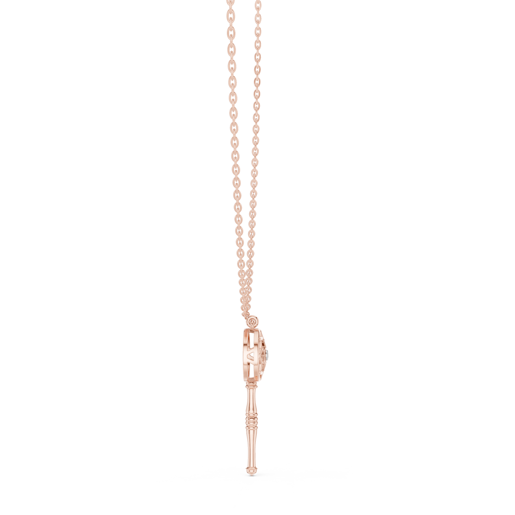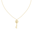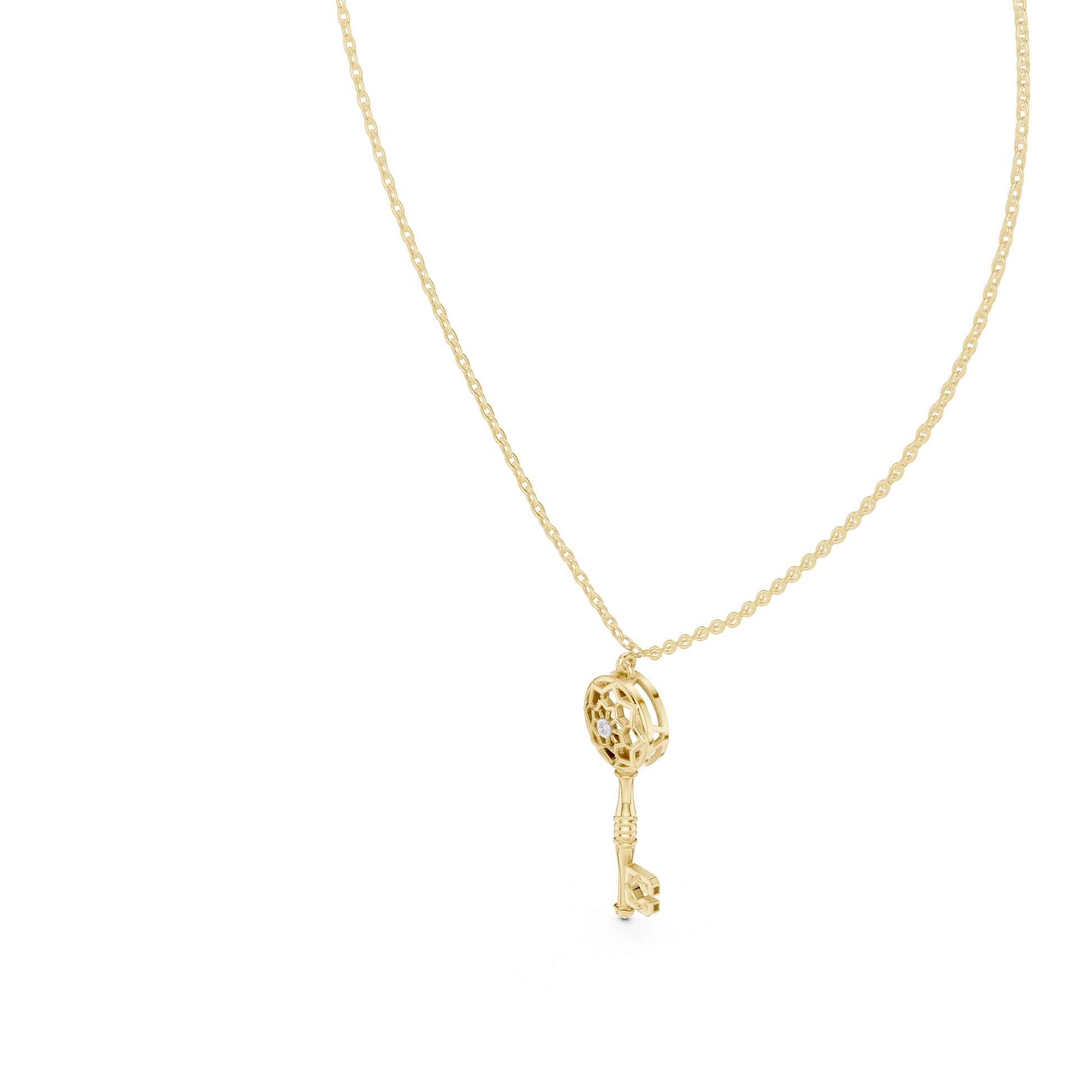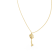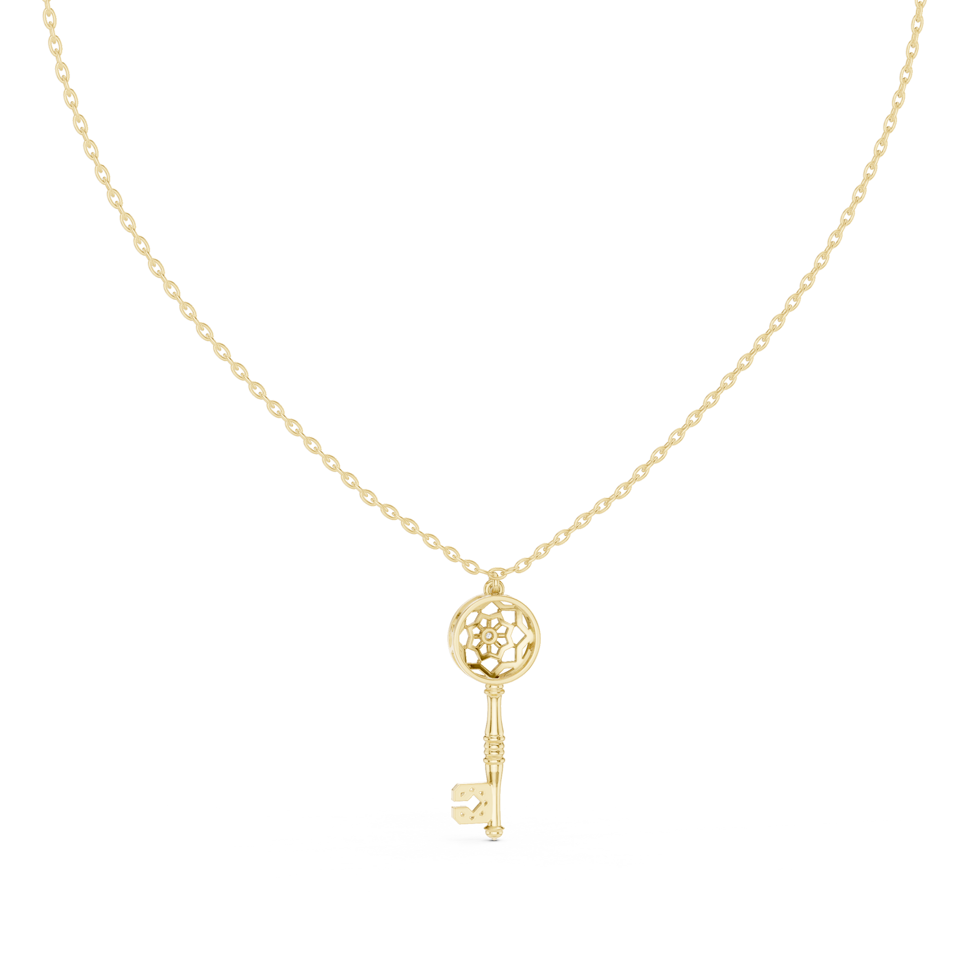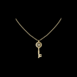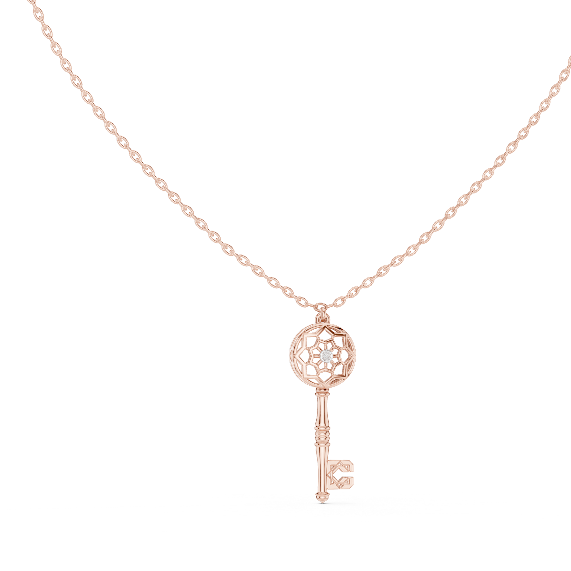 This elegant gold key pendant blends timeless symbolism with modern design, featuring a beautifully crafted circular lattice head accented by a sparkling central diamond for a touch of brilliance. The polished gold key stem flows into a distinctive letter “C” detail at the base, adding a personal and contemporary twist. Suspended from a refined gold chain, this pendant represents access, meaning, and individuality—making it a perfect statement piece for everyday wear or a thoughtful gift that celebrates style, identity, and elegance.