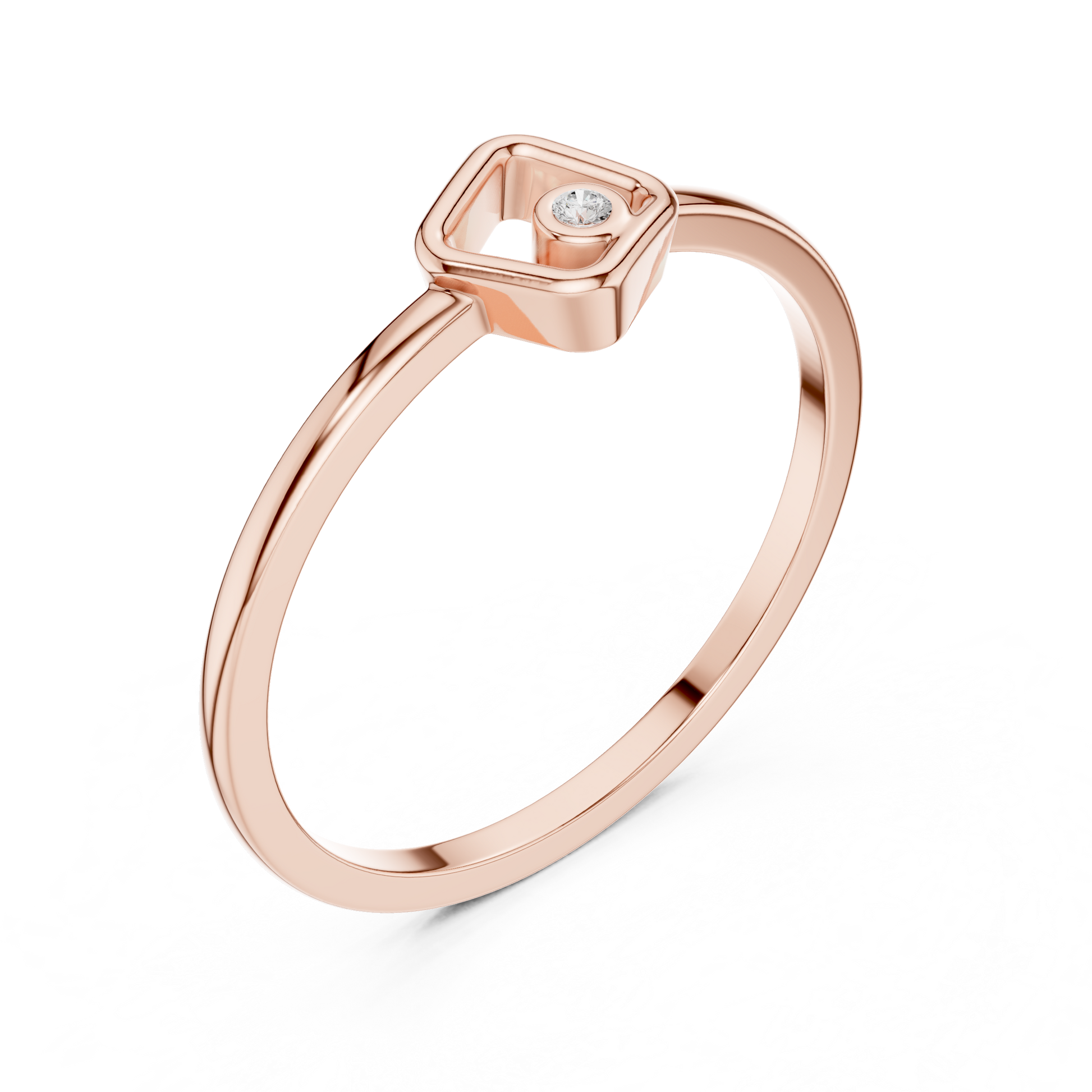 This sleek and modern gold ring features a stylish open-square geometric frame paired with a bezel-set round diamond at the center. Its minimalist design makes it perfect for everyday wear, adding a subtle sparkle with a contemporary twist. Lightweight, elegant, and uniquely artistic, this ring is an ideal choice for women who love refined, modern jewelry with a touch of individuality.