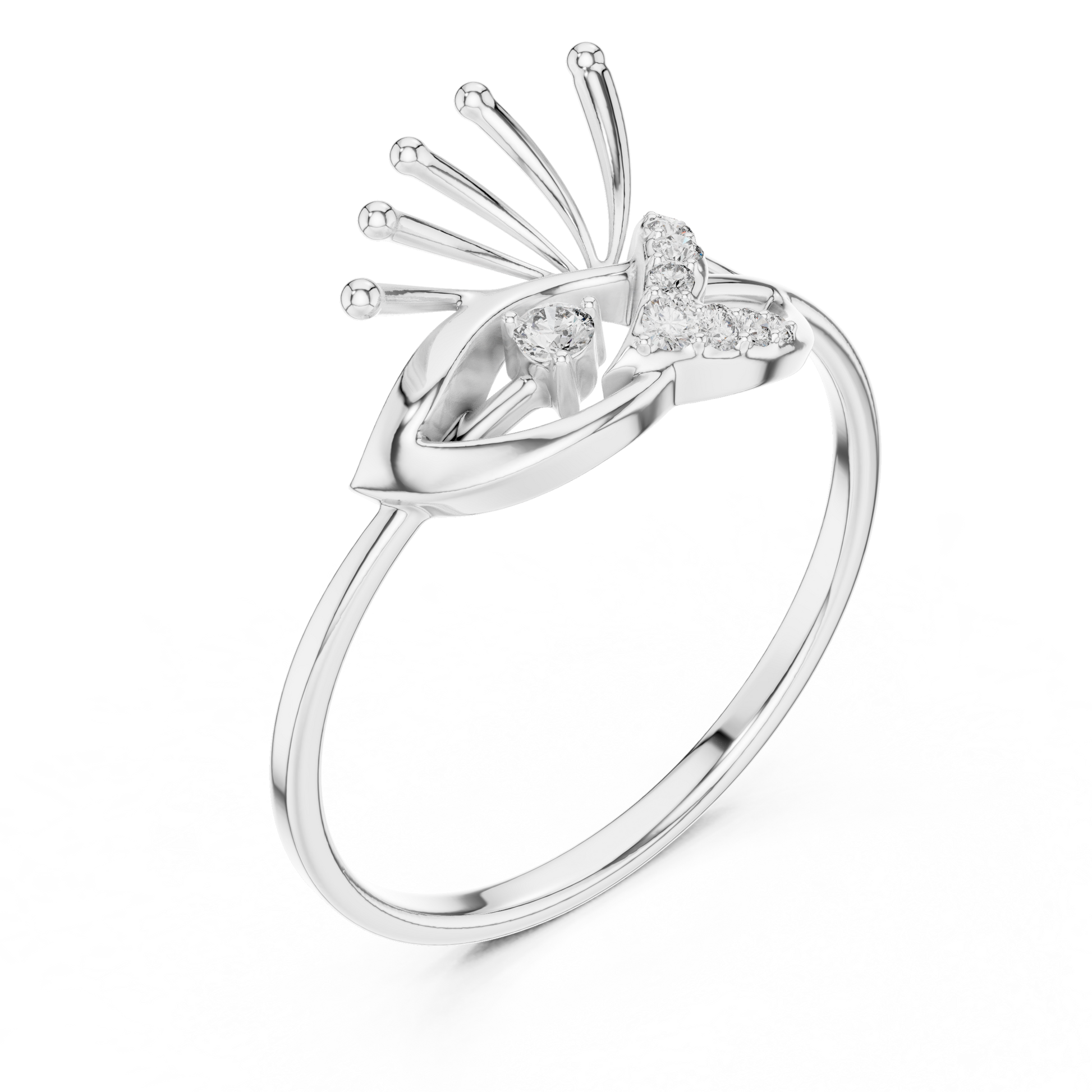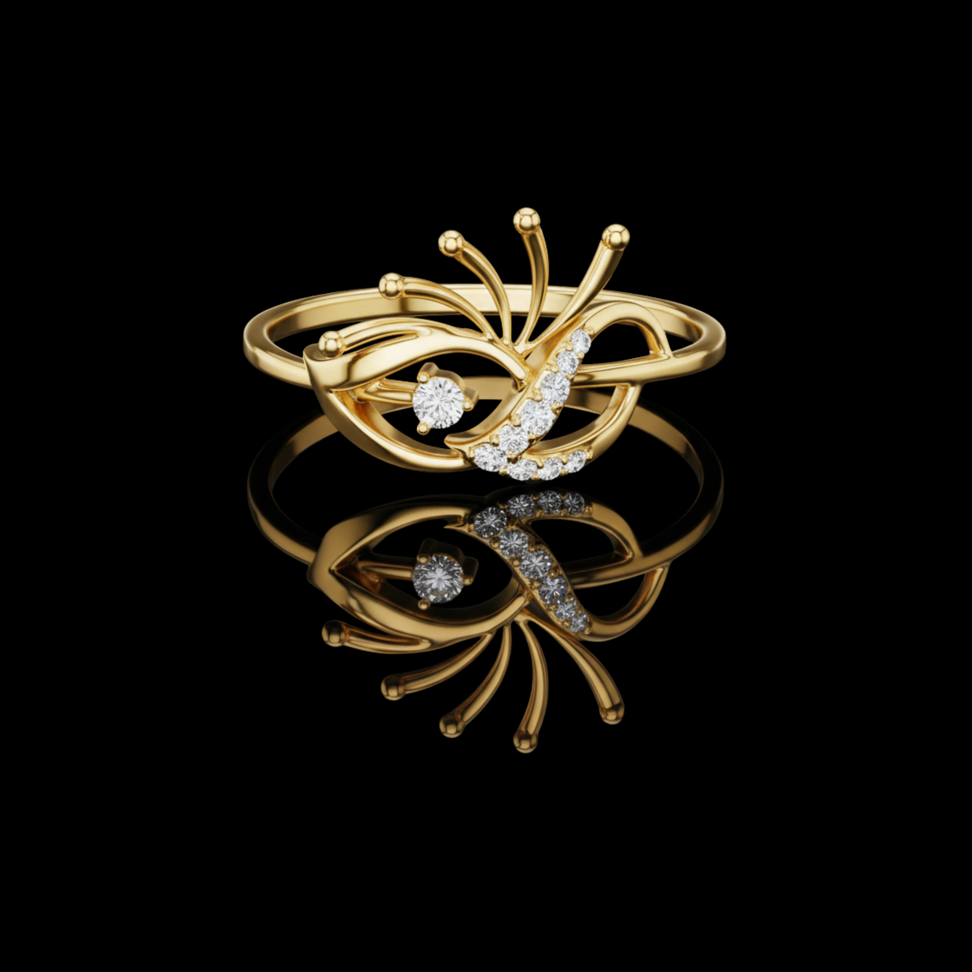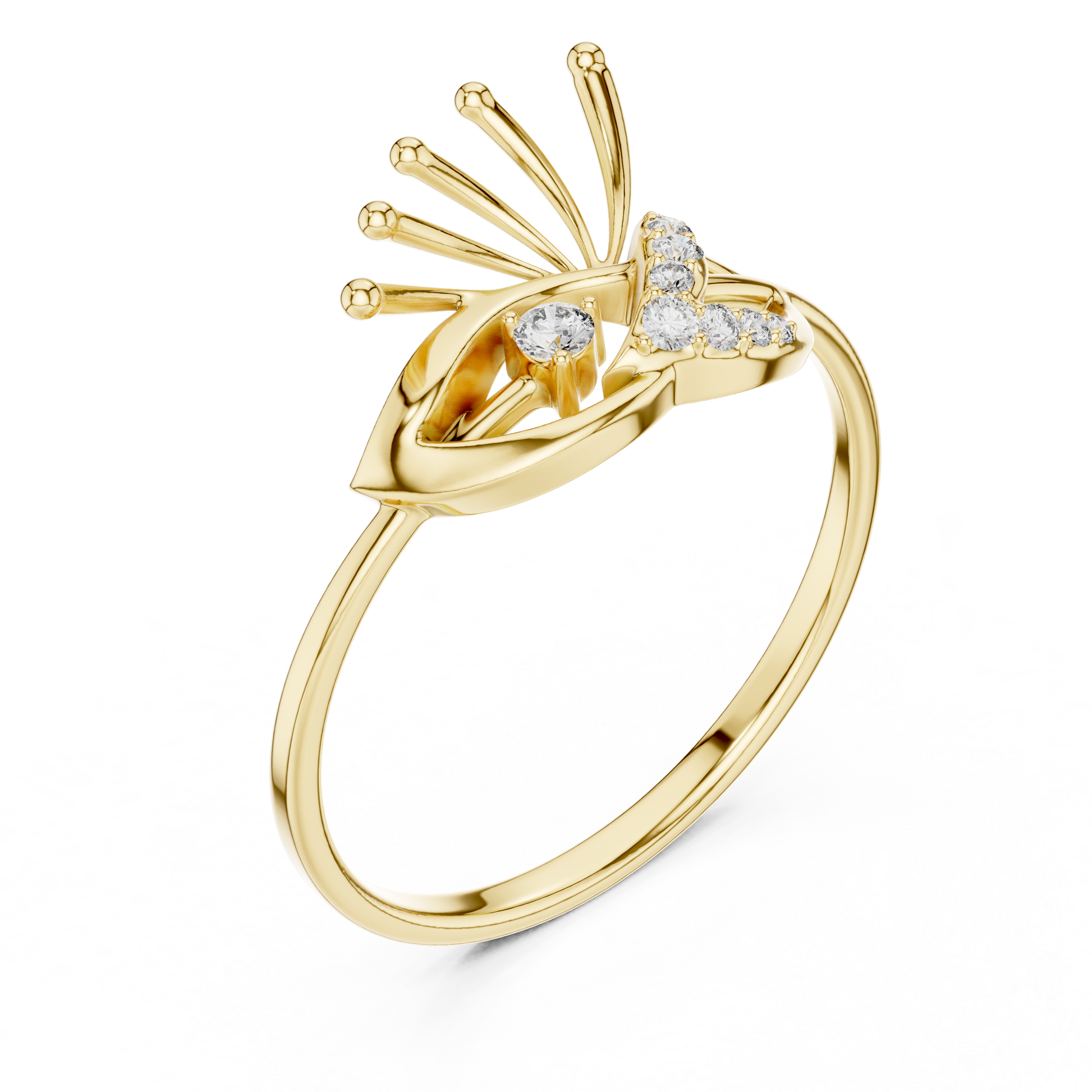 This uniquely crafted ring features an artistic openwork design that resembles a delicate blend of petals, light, and movement. Its flowing gold curves are paired with brilliant Round diamond highlights, creating a piece that feels both modern and ethereal. Perfect for those who appreciate one-of-a-kind elegance and refined craftsmanship.