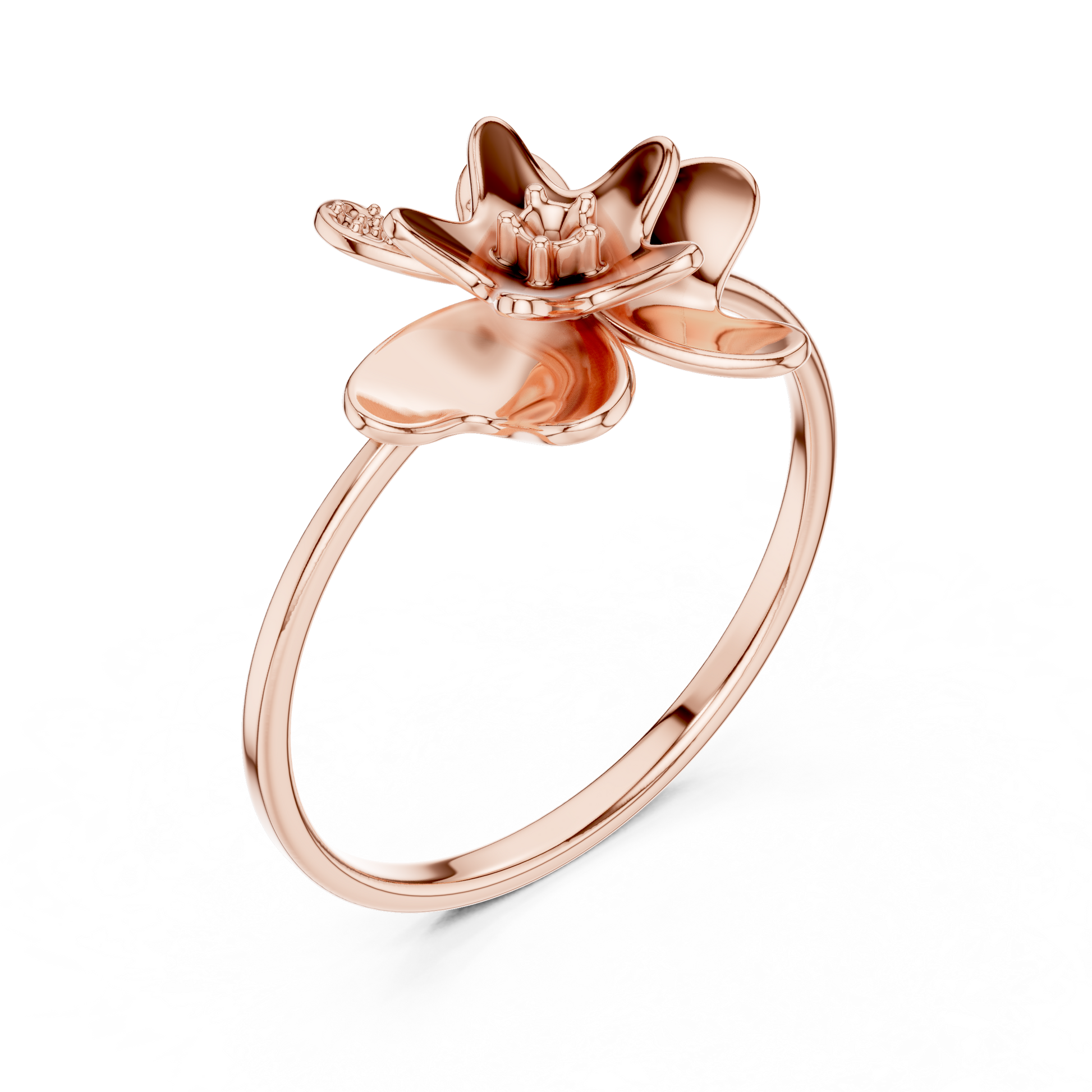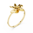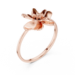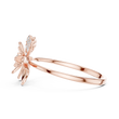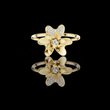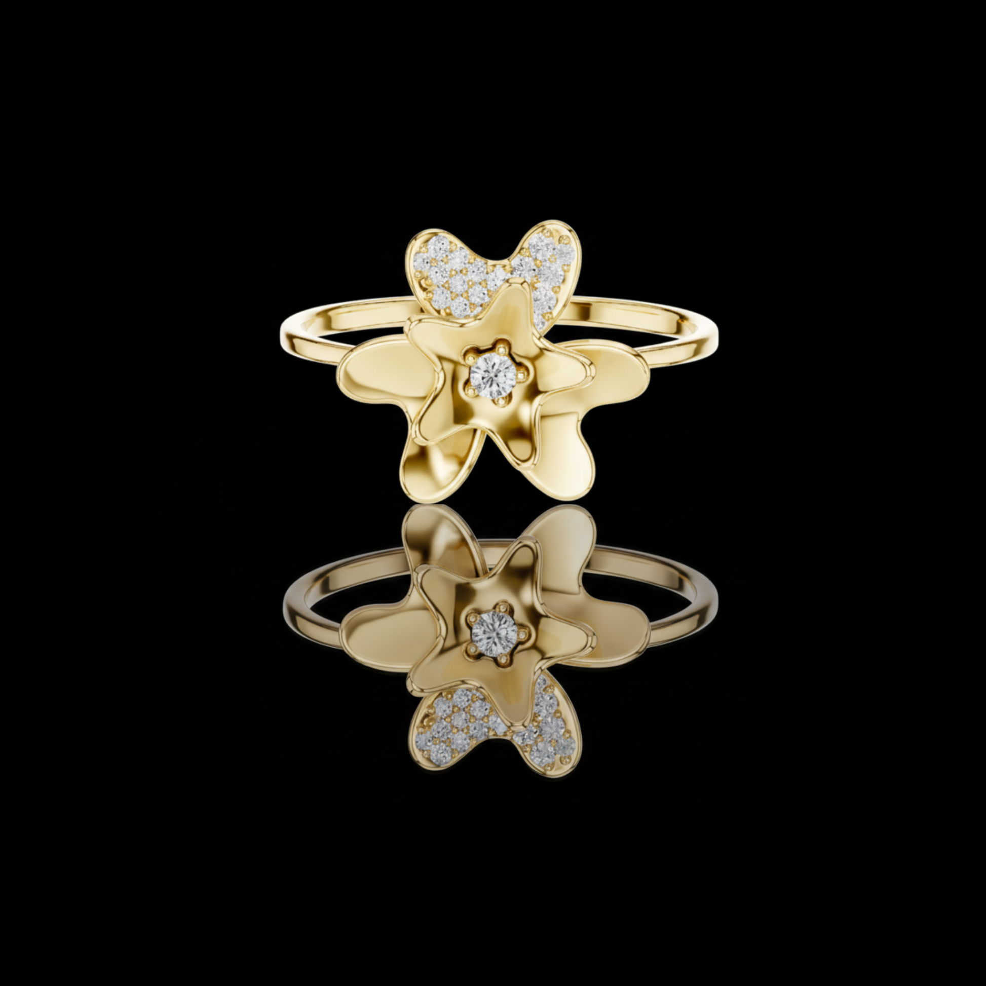 This beautiful ring showcases a playful yet elegant dual-flower design crafted in lustrous. The larger flower features smooth, sculpted petals centered by a brilliant round diamond, while the smaller bloom above sparkles with a cluster of pavé-set diamonds. Together, they create a charming composition that blends whimsical floral artistry with luxurious craftsmanship. Perfect for those who adore feminine, nature-inspired, and sparkling jewelry.