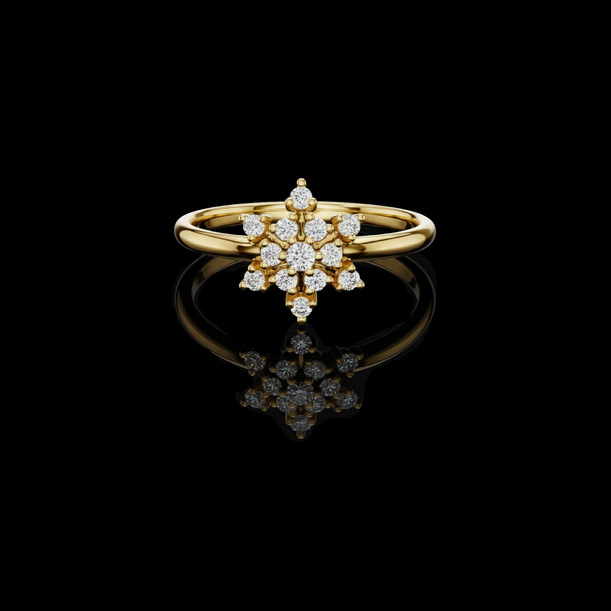 Experience refined beauty with this exquisitely crafted ring, featuring a dazzling cluster of diamonds arranged in a captivating snowflake-inspired pattern. The polished gold band enhances the brilliance of each stone, creating a piece that is both radiant and timeless—perfect for adding elegance to any occasion.