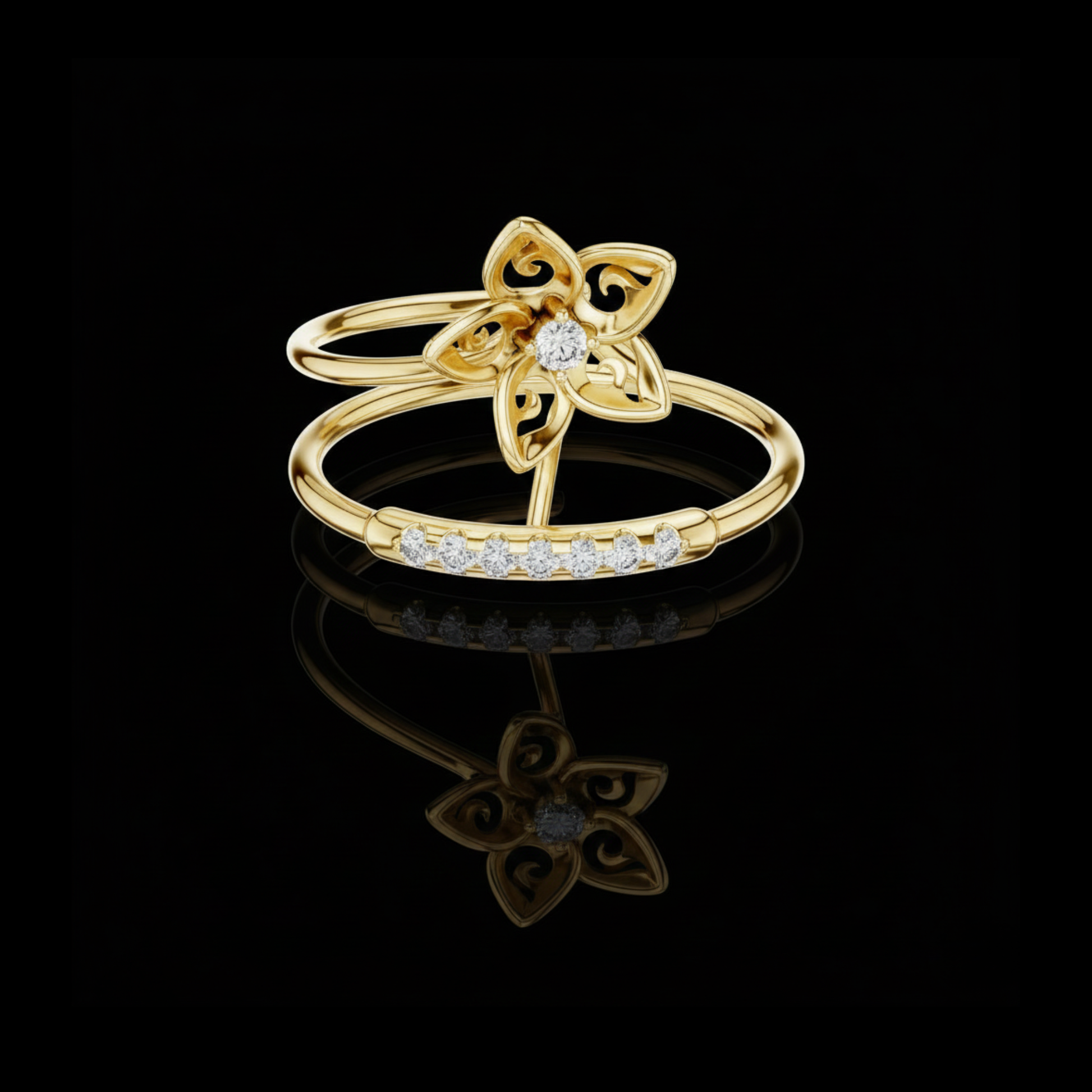 This exquisite creation from Ivevar Luxury blends nature-inspired elegance with modern finesse. Featuring a delicately sculpted floral motif crowned with a shimmering diamond and paired with a sleek dual-band design accented with brilliant pave stones, this ring radiates timeless sophistication. Crafted in polished gold, its double-band silhouette gives the illusion of a graceful stacked set, making it a standout piece for everyday elegance or special celebrations.