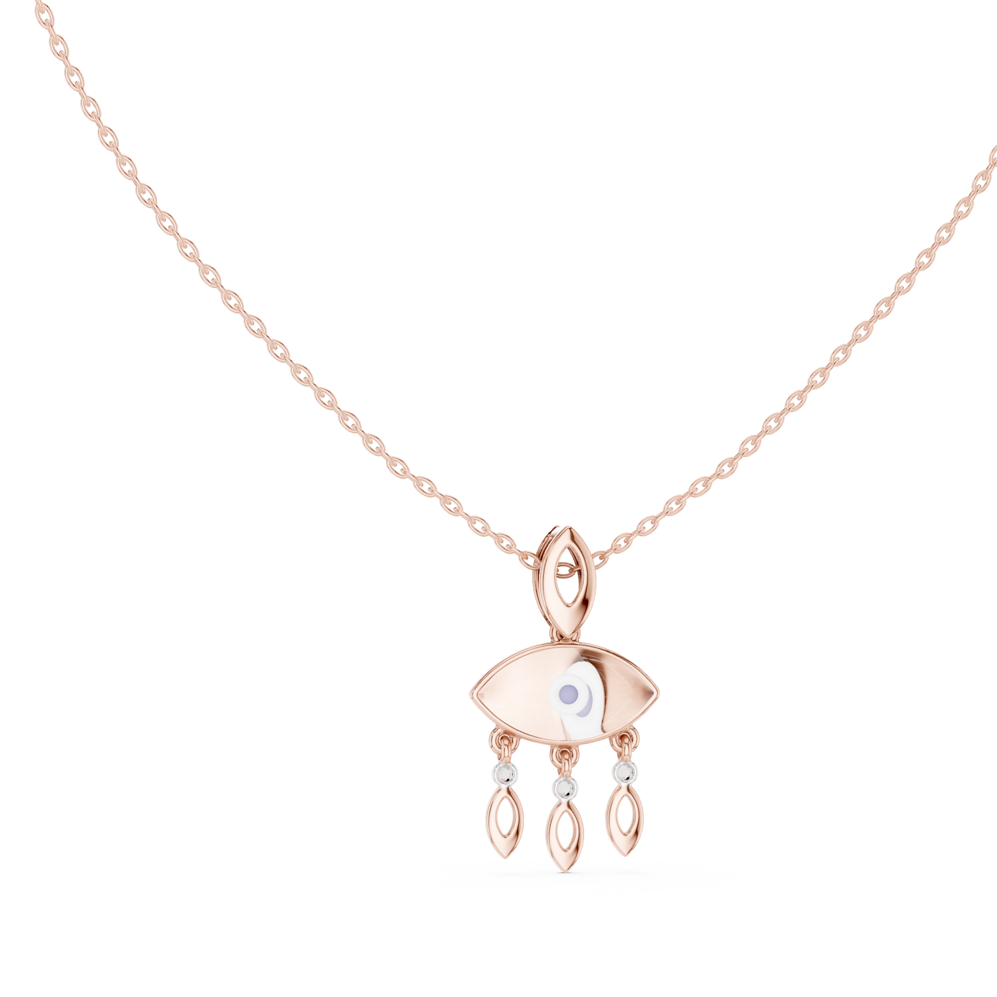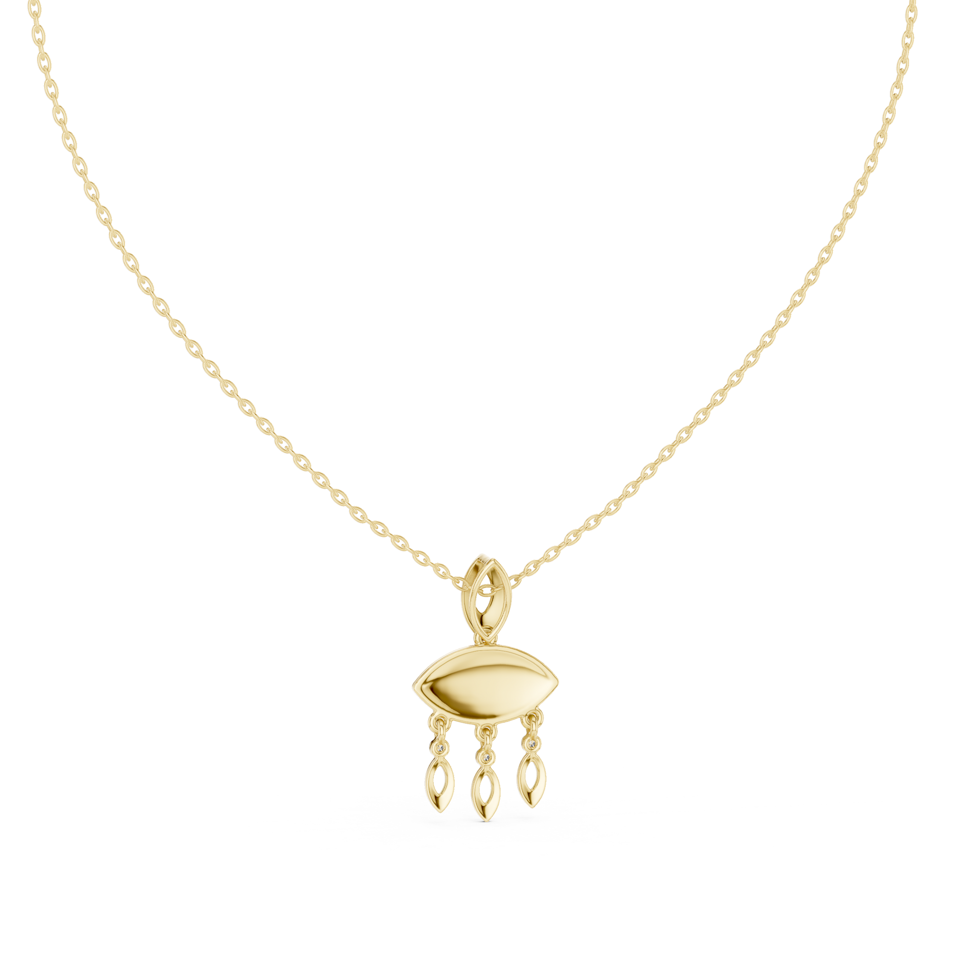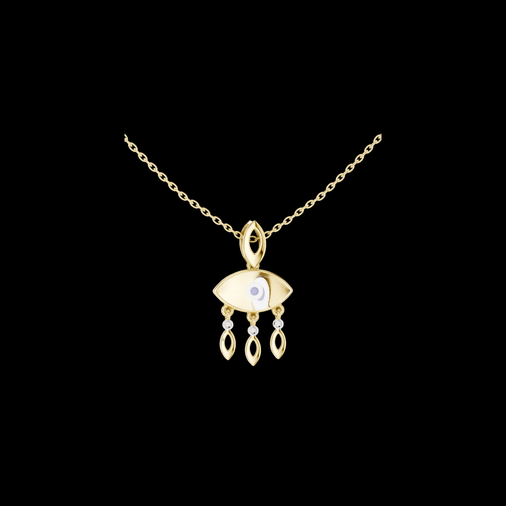 This striking gold evil eye pendant blends ancient symbolism with modern elegance, featuring a sleek eye-shaped form accented by a soft enamel pupil that represents protection and positive energy. Delicately suspended beneath the eye are graceful gold drops, each highlighted with subtle round diamond accents that add movement and refined sparkle. Finished with a polished gold bail and chain, this pendant is both meaningful and stylish—perfect for everyday wear as a symbol of protection and understated luxury.