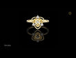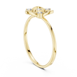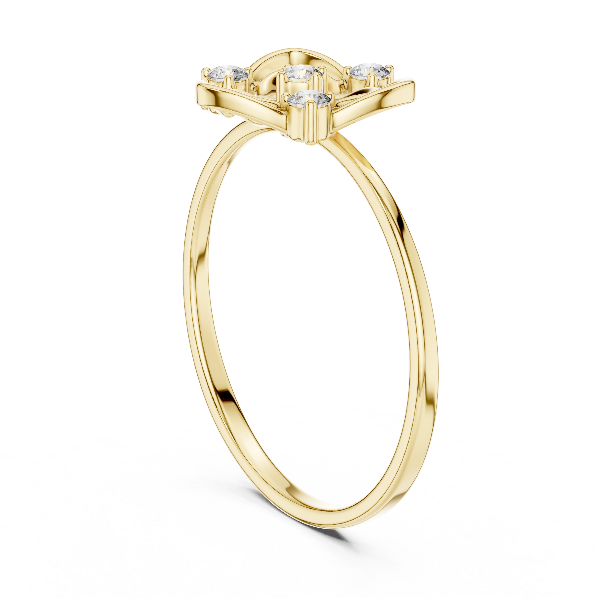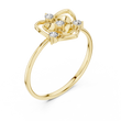 This striking ring showcases a radiant shield motif enriched with soft, organic curves that evoke the elegance of a blossoming flower. At its heart rests a brilliant round diamond, surrounded by three additional sparkling diamond accents that enhance its luminous symmetry. The airy, open-frame structure and dual-band design create a perfect harmony between strength and delicacy, making this piece a symbol of grace, confidence, and refined artistry.