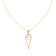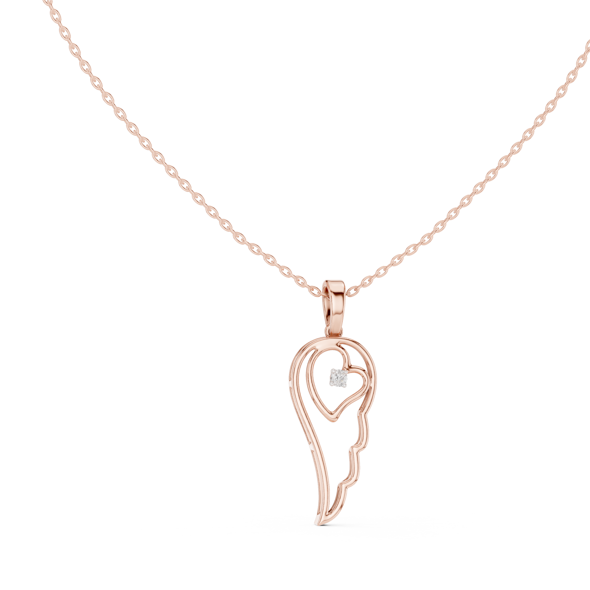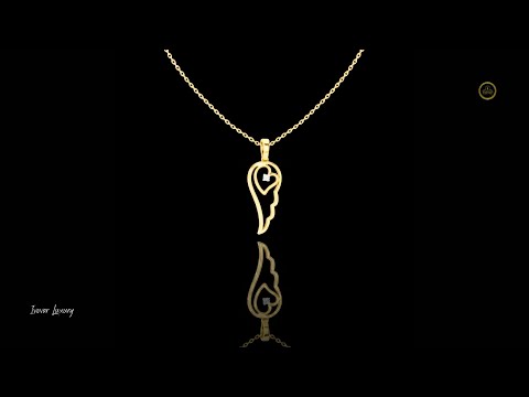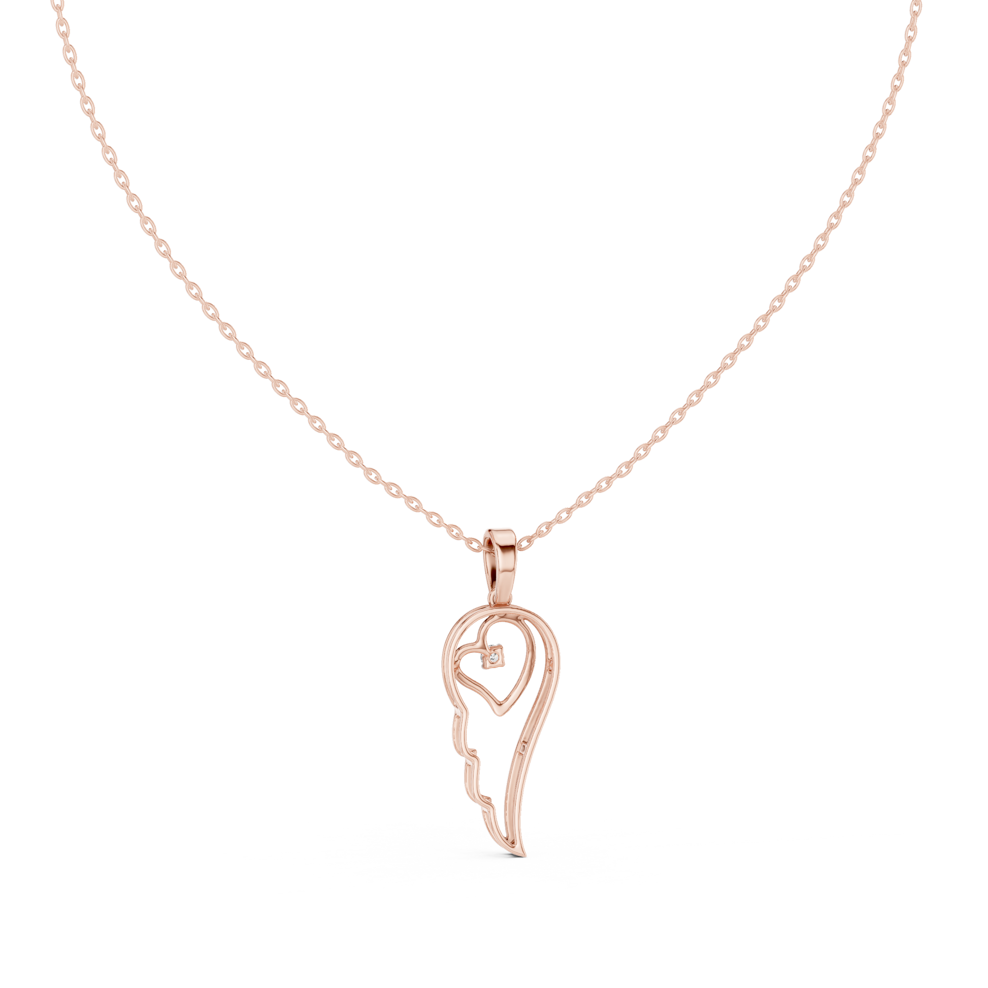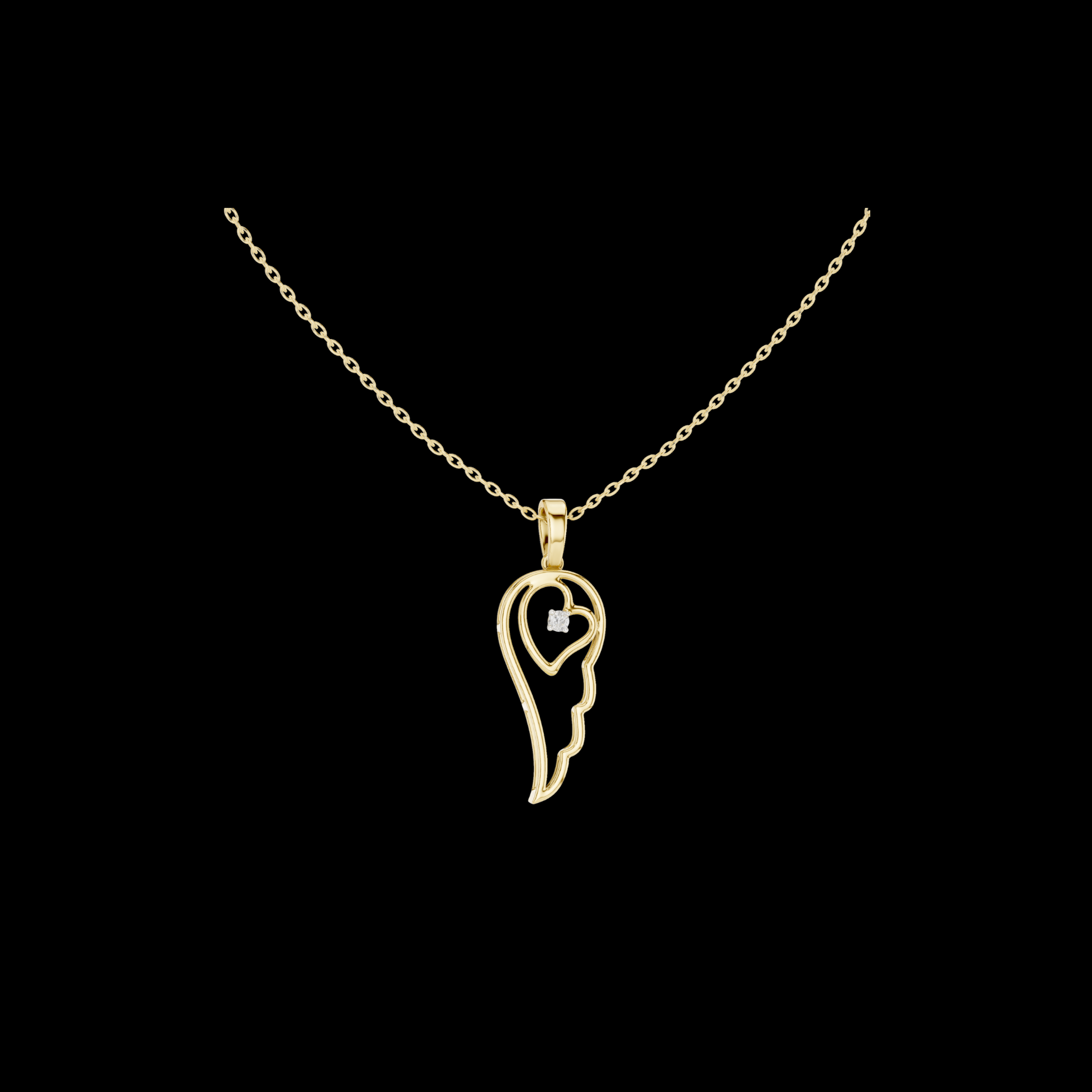 This elegant angel wing pendant is crafted in polished gold, featuring a graceful open wing silhouette that gently curves into a heart shape at its center. A single brilliant diamond accent rests within the heart, symbolizing love, protection, and connection. The openwork design gives the pendant a lightweight and refined appearance, while the smooth high-polish finish enhances its sculptural form. Suspended from a delicate gold chain, this piece is timeless, symbolic, and effortlessly elegant—perfect for everyday wear or meaningful gifting.