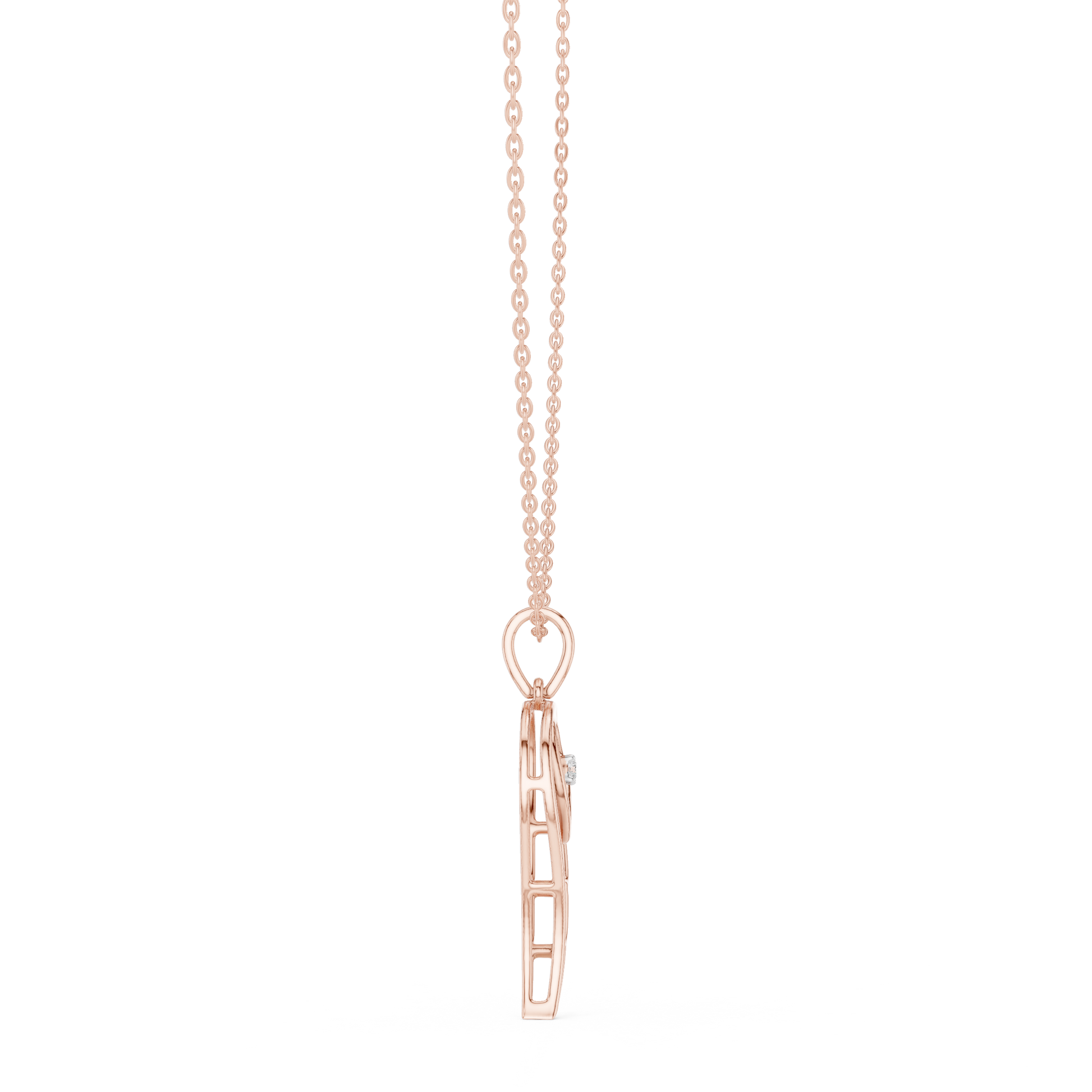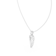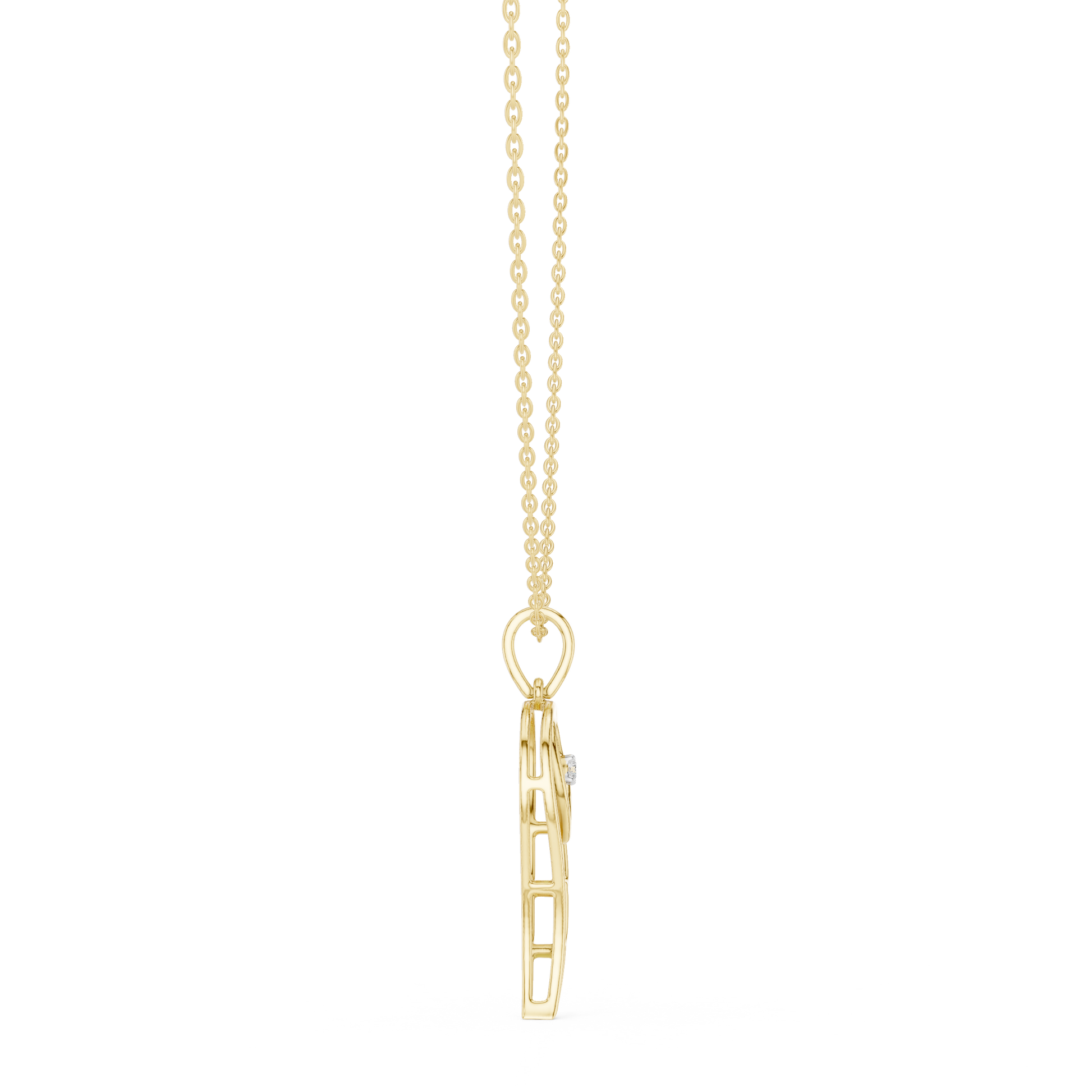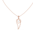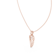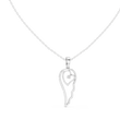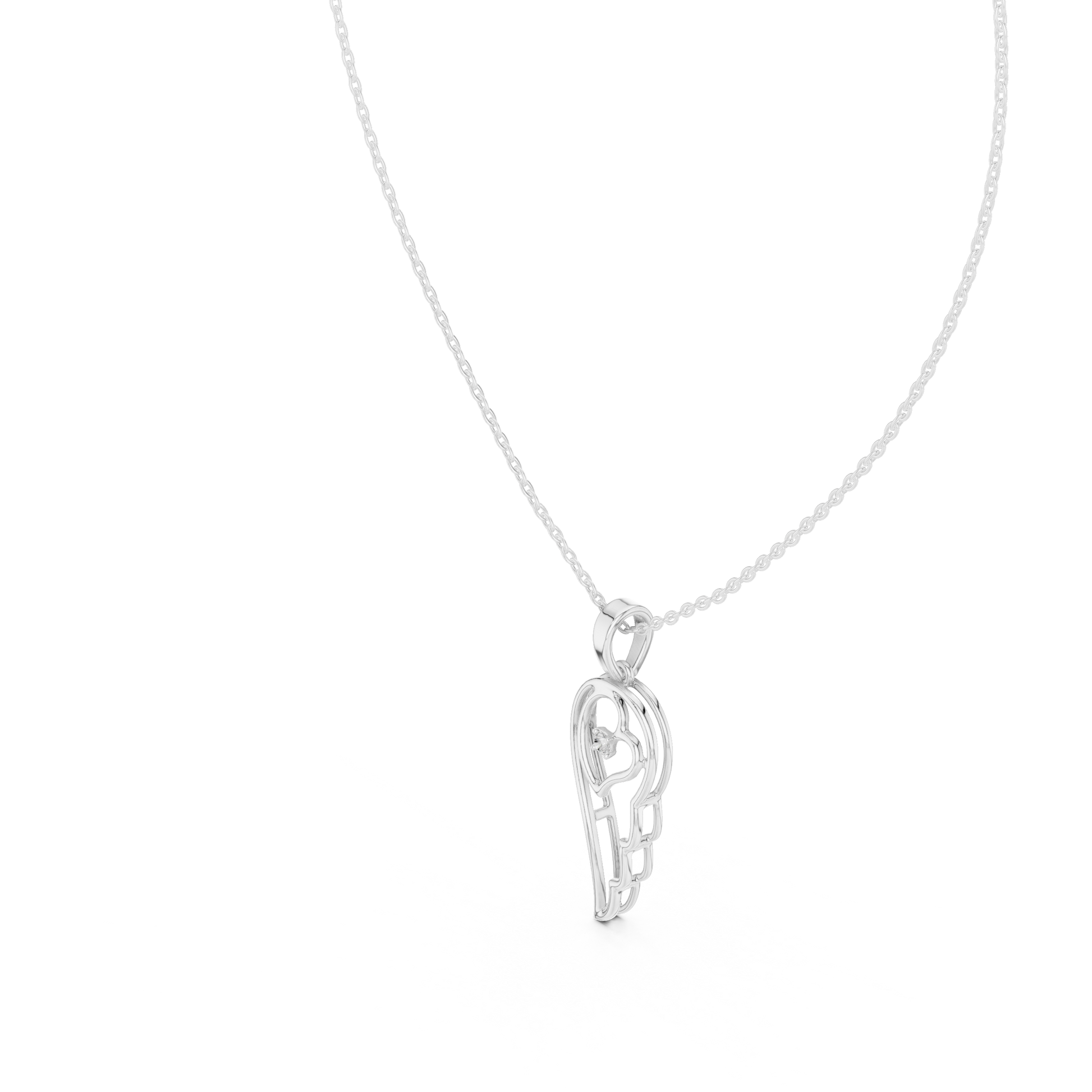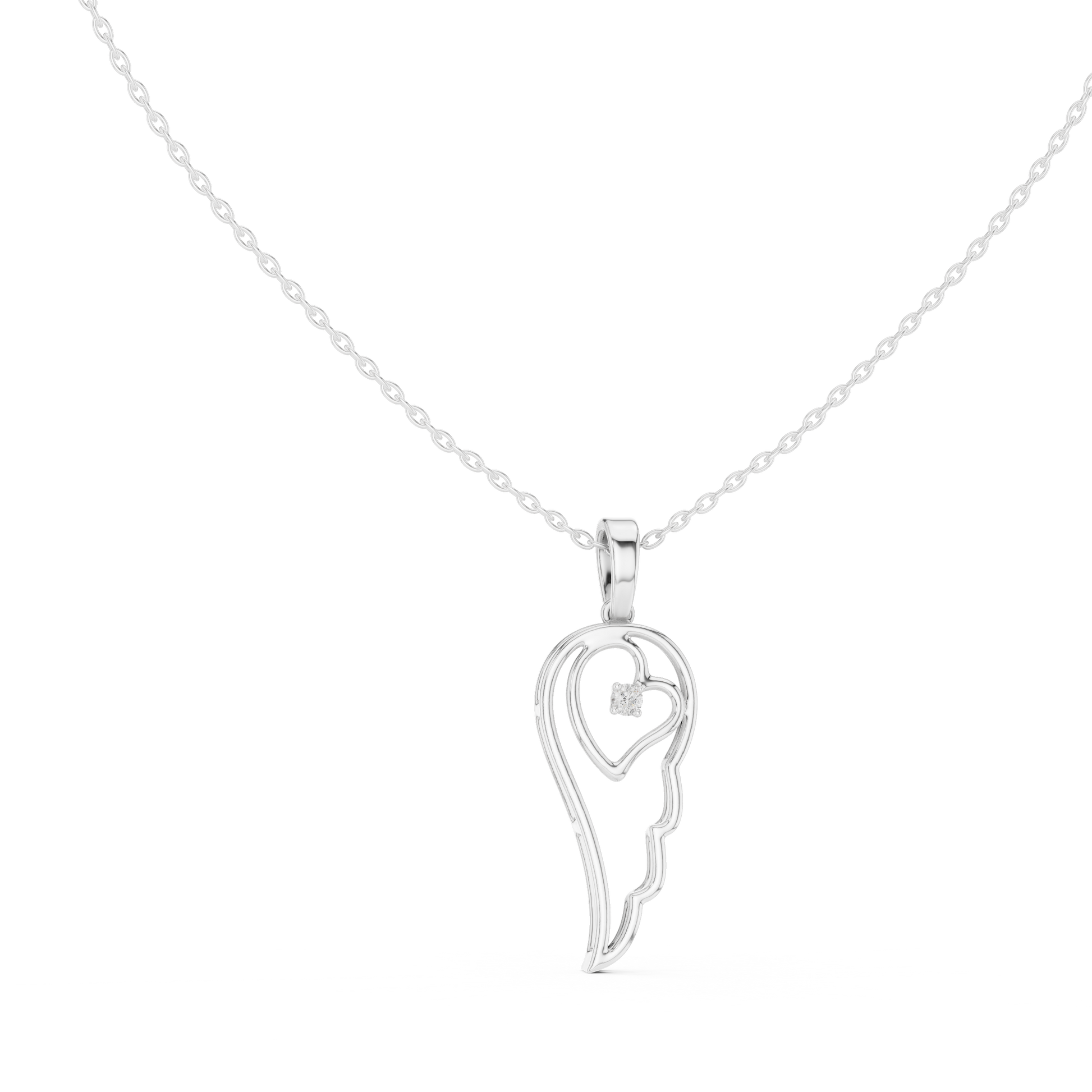 This elegant angel wing pendant is crafted in polished gold, featuring a graceful open wing silhouette that gently curves into a heart shape at its center. A single brilliant diamond accent rests within the heart, symbolizing love, protection, and connection. The openwork design gives the pendant a lightweight and refined appearance, while the smooth high-polish finish enhances its sculptural form. Suspended from a delicate gold chain, this piece is timeless, symbolic, and effortlessly elegant—perfect for everyday wear or meaningful gifting.