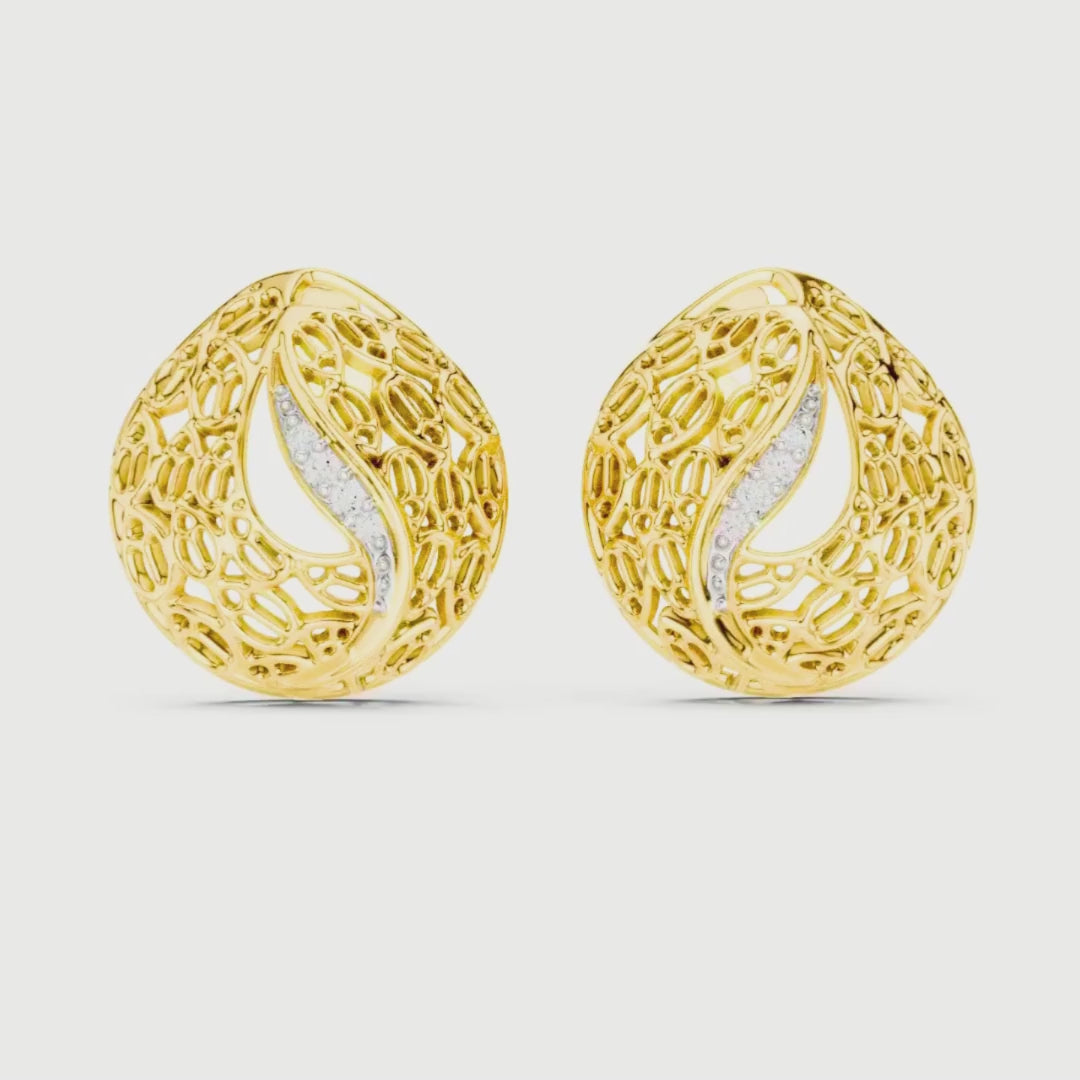 These filigree wave diamond stud earrings are a beautiful expression of artistry and elegance. Crafted in polished gold, the openwork filigree design creates a rich texture inspired by flowing waves and organic forms. A gently curved line of pave-set diamonds sweeps through the center, adding soft brilliance and contrast to the intricate gold framework. Lightweight yet visually striking, these earrings offer timeless sophistication with a modern touch—perfect for everyday luxury or elevated occasions. A distinctive choice for women who appreciate fine craftsmanship and unique design.