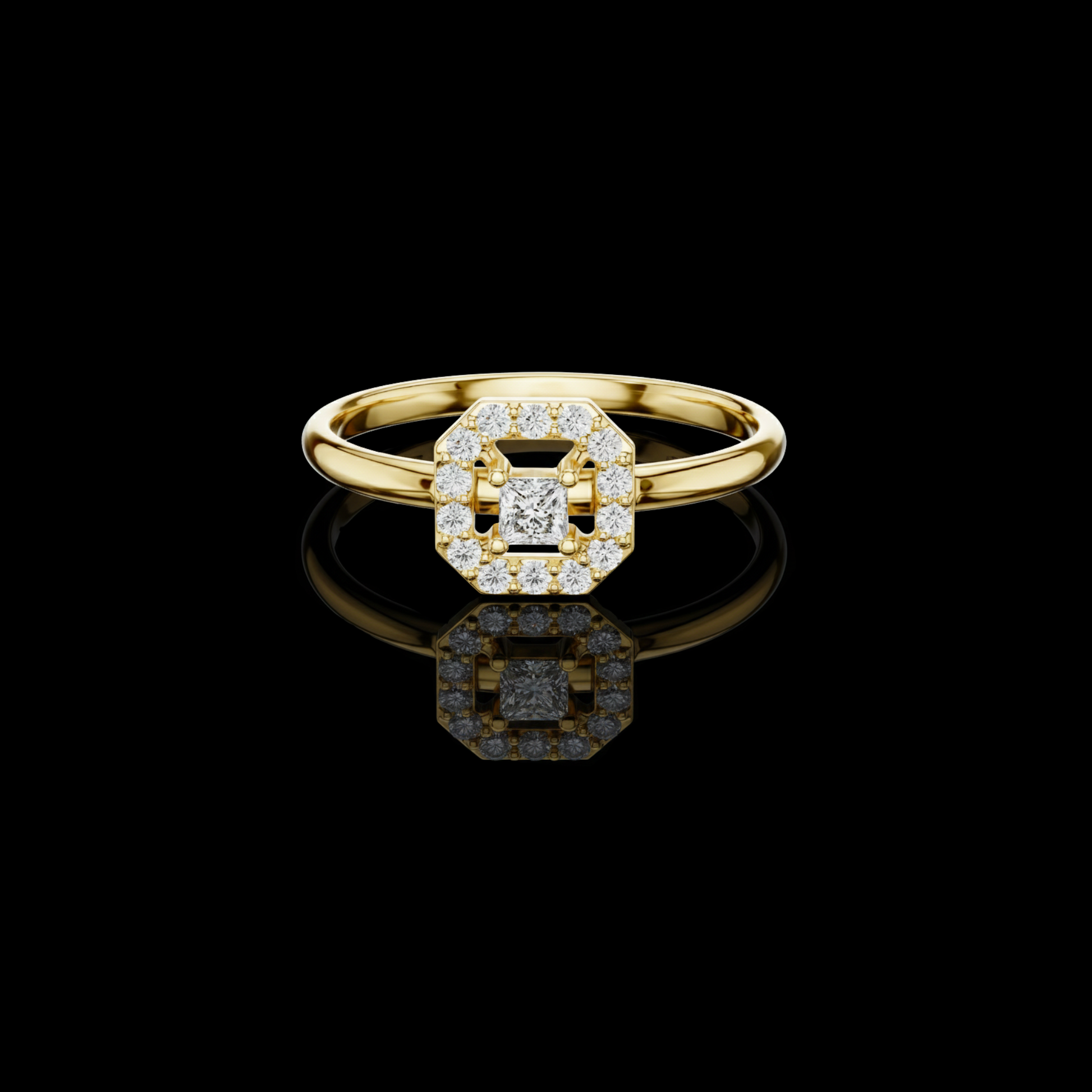 This exquisite diamond ring features a striking princess-cut center diamond framed by a meticulously crafted octagon-shaped halo of round brilliant diamonds. The geometric halo adds a contemporary flair, while the polished gold band enhances the ring’s radiant charm. Designed for lovers of both classic sophistication and modern style, this piece embodies luxury, precision craftsmanship, and lasting brilliance—perfect for everyday elegance or special occasions.