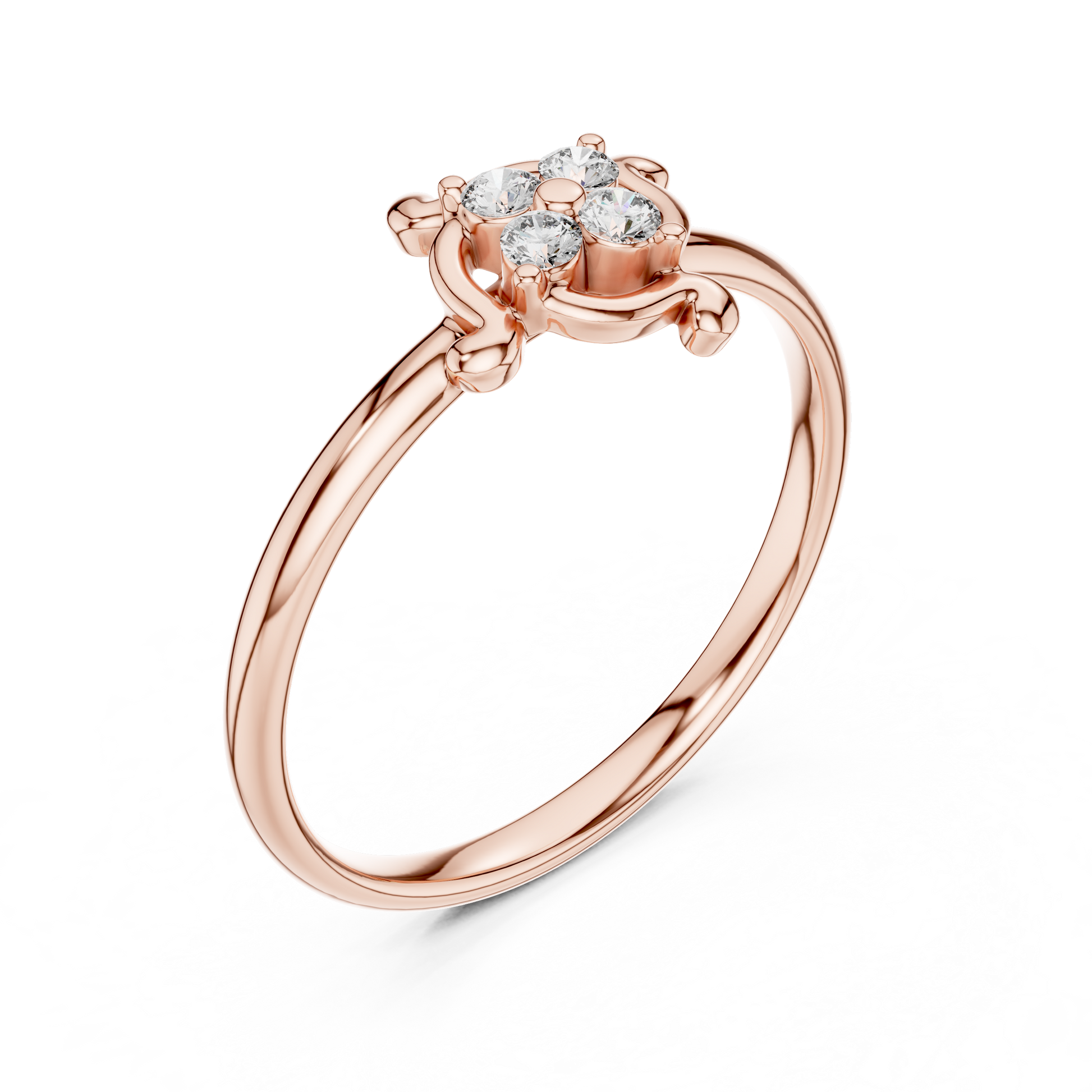This exquisite ring showcases a beautifully Band shaped into an artistic Swirl Motif that frames a stunning Diamond Round Cluster. Four brilliant diamonds come together at the center, creating a captivating focal point that enhances the ring’s Elegance and Luxury. The flowing curves add a touch of Artistic Charm, blending classic craftsmanship with modern sophistication. Perfect for daily wear or special occasions, this piece symbolizes Refinement, Feminine Beauty, and Everlasting Shine.
