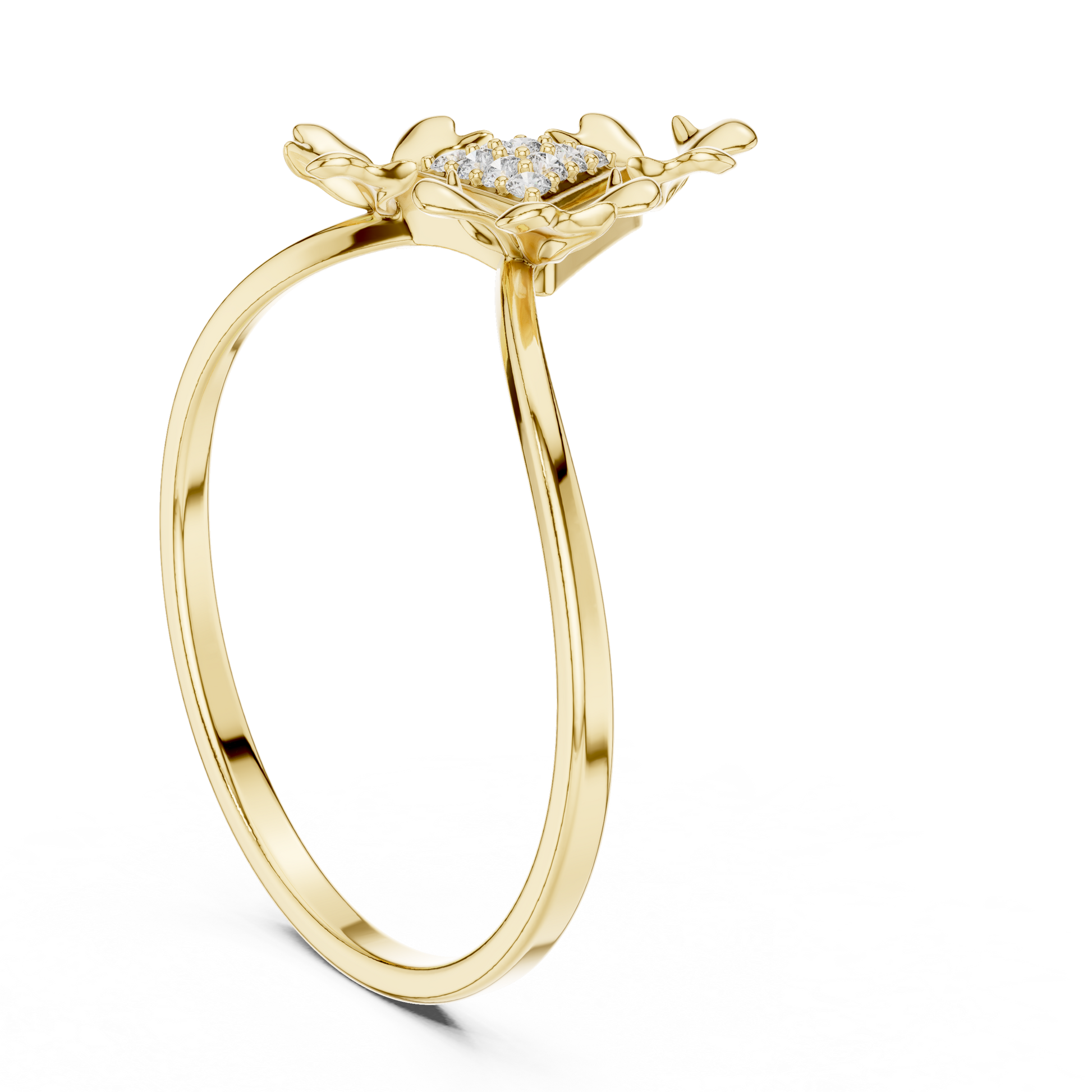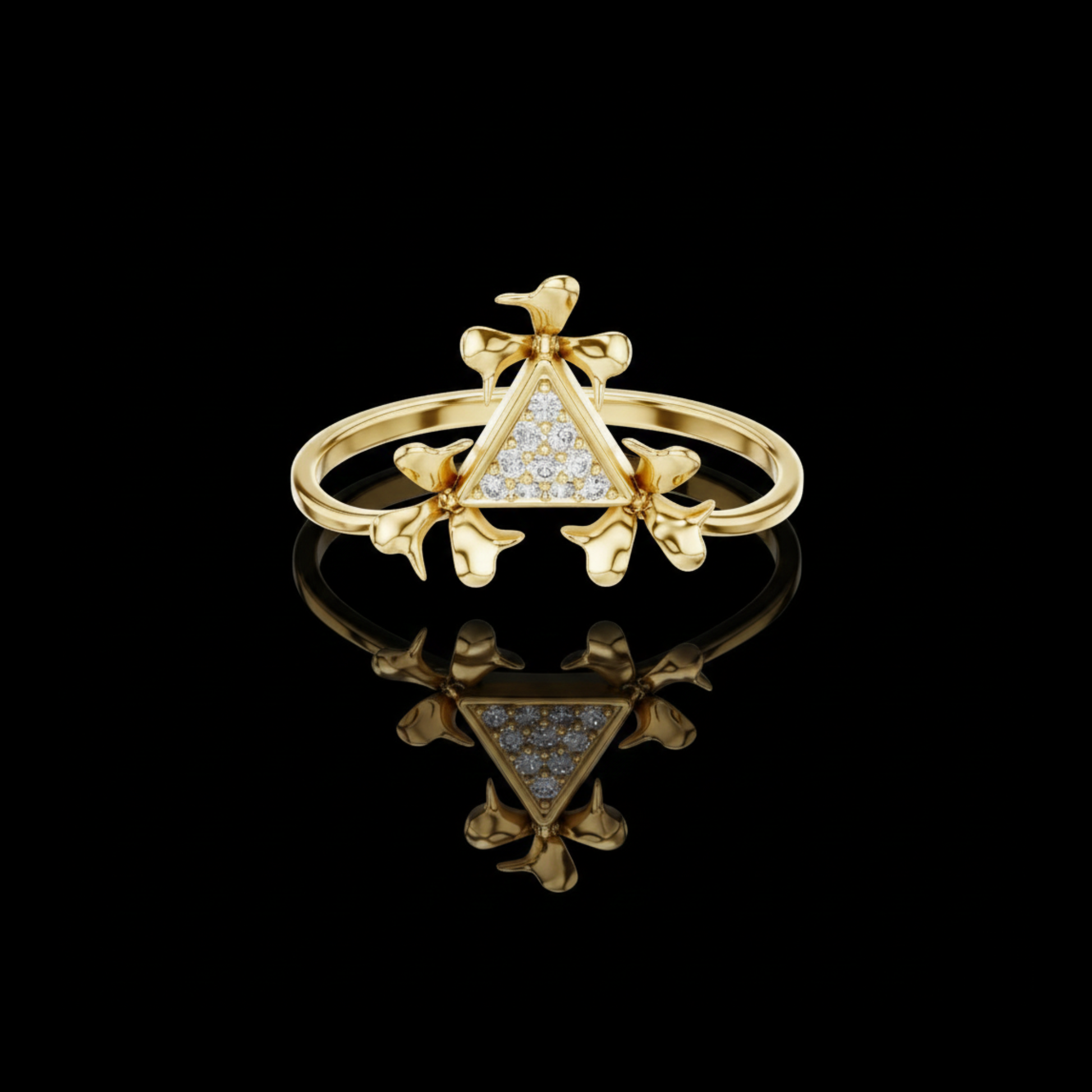 This exquisite ring showcases a striking triangular pave centerpiece embraced by sculpted gold petal motifs, creating a perfect harmony of geometry and organic elegance. Crafted with meticulous artistry, this piece reflects the refined craftsmanship of Ivevar Luxury, offering a wearable treasure that stands out through its brilliant shimmer, unique floral-inspired structure, and elevated modern design. Ideal for gifting or adorning your own collection, this ring adds a touch of bold sophistication to any look.
