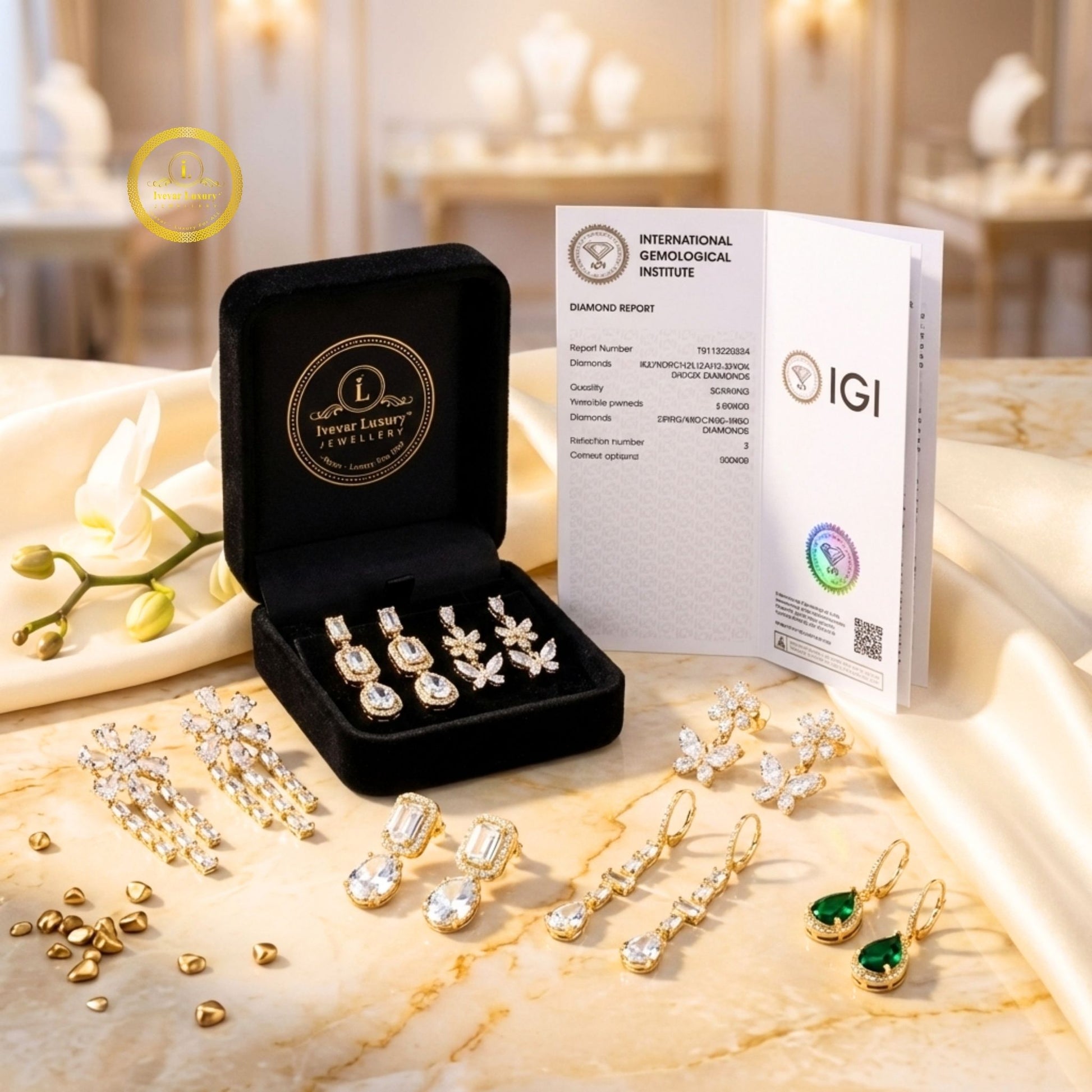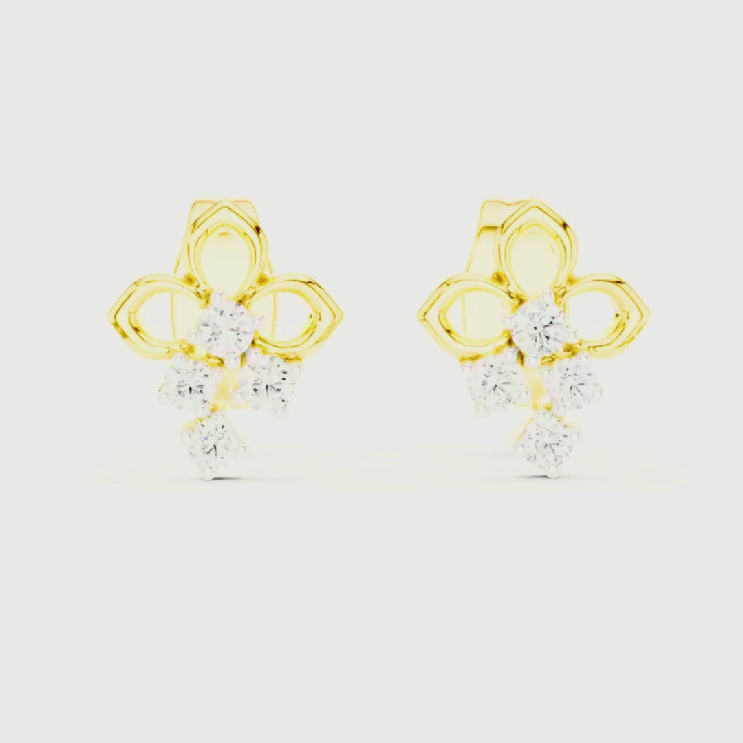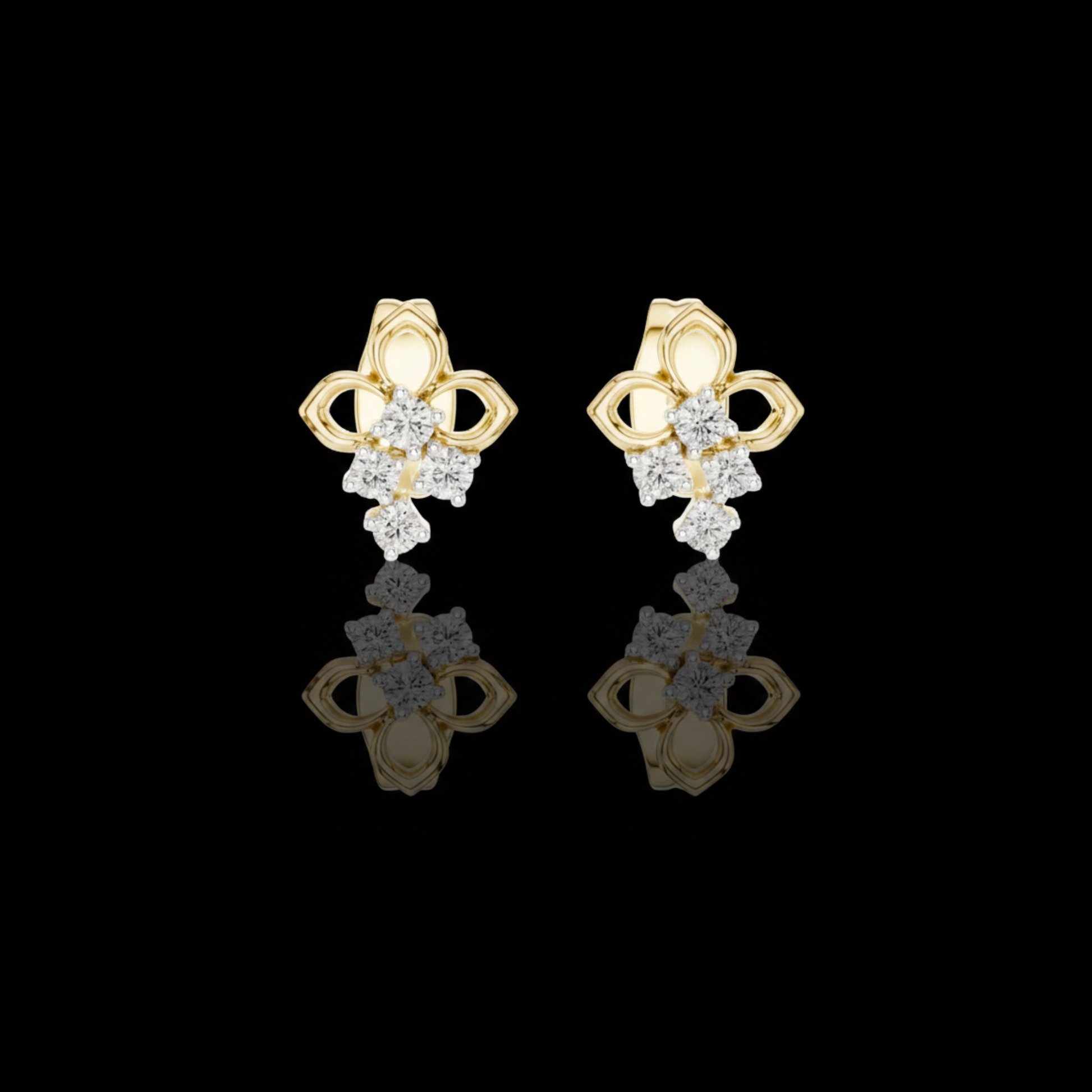 The Elowen Clover Gold Stud Earrings capture delicate charm through a refined floral silhouette. Inspired by a soft clover motif, the open gold petals frame a graceful cluster of sparkling round diamonds that cascade gently below, adding movement and brilliance. The balanced combination of airy goldwork and subtle drop detailing creates an elegant yet playful look. Perfect for everyday wear or meaningful gifting, these studs bring a touch of nature-inspired luxury to any style.