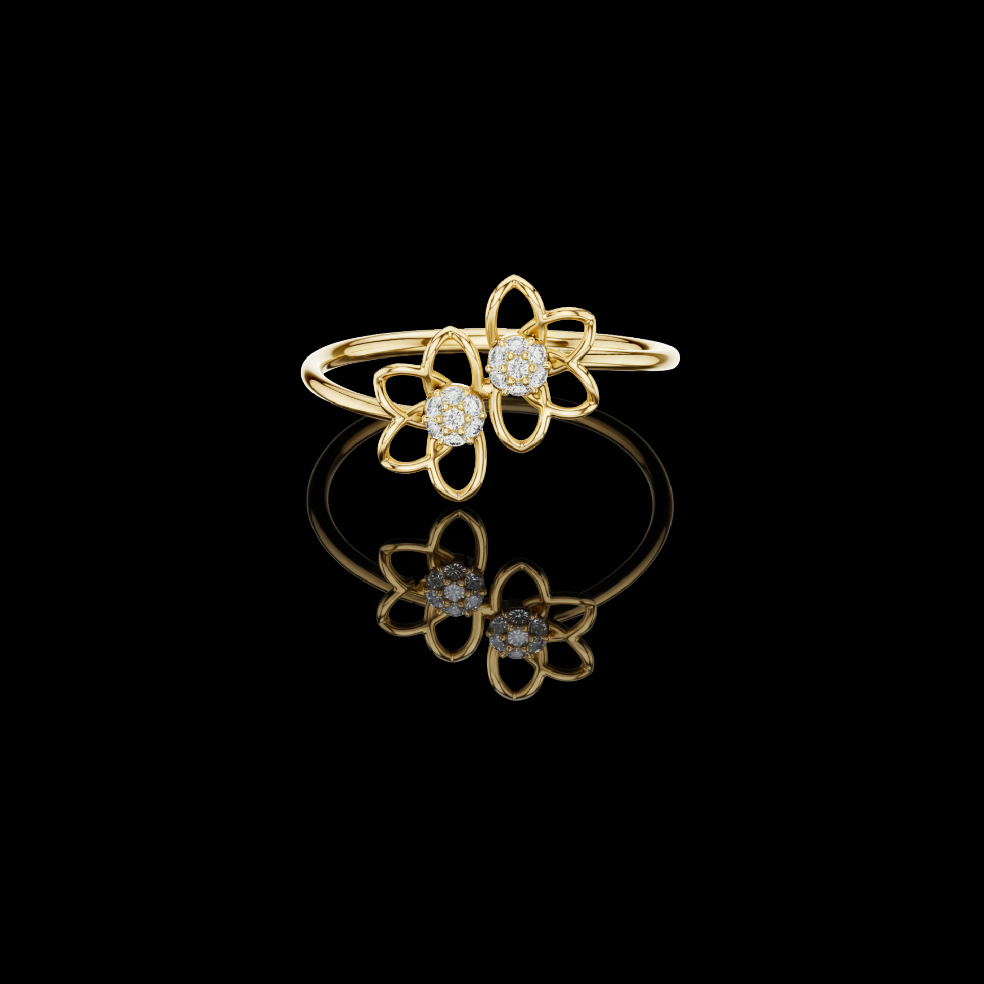 Celebrate refined elegance with this exquisitely designed twin-blossom ring, where graceful floral outlines meet the soft brilliance of clustered diamonds. Crafted in, the open floral design creates a light, airy silhouette that feels both modern and romantic. Each bloom cradles a constellation of shimmering diamonds, reflecting light with every movement. Perfect for everyday luxury or meaningful gifting, this ring is a symbol of harmony, femininity, and everlasting sparkle—a piece that effortlessly elevates any jewelry collection.