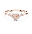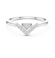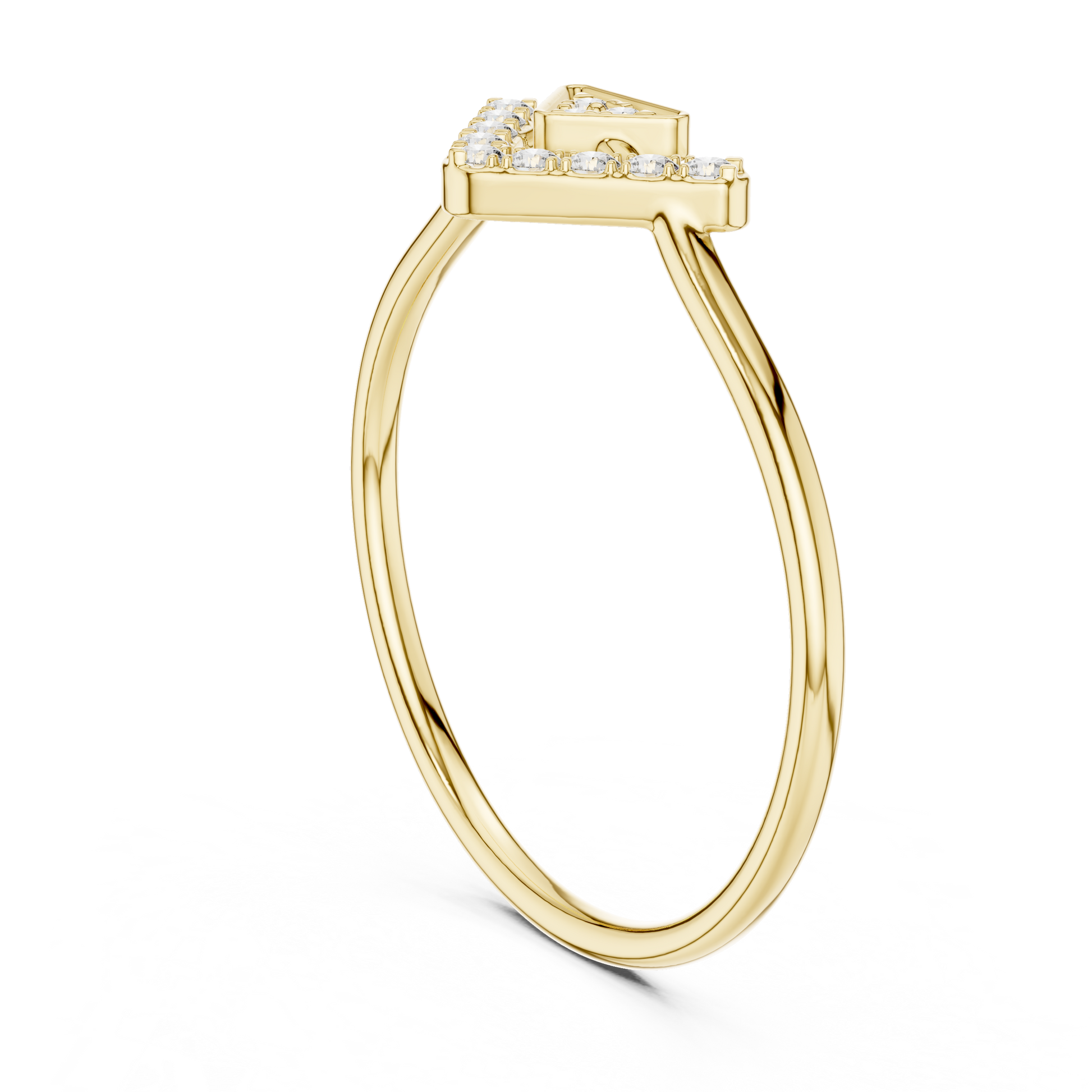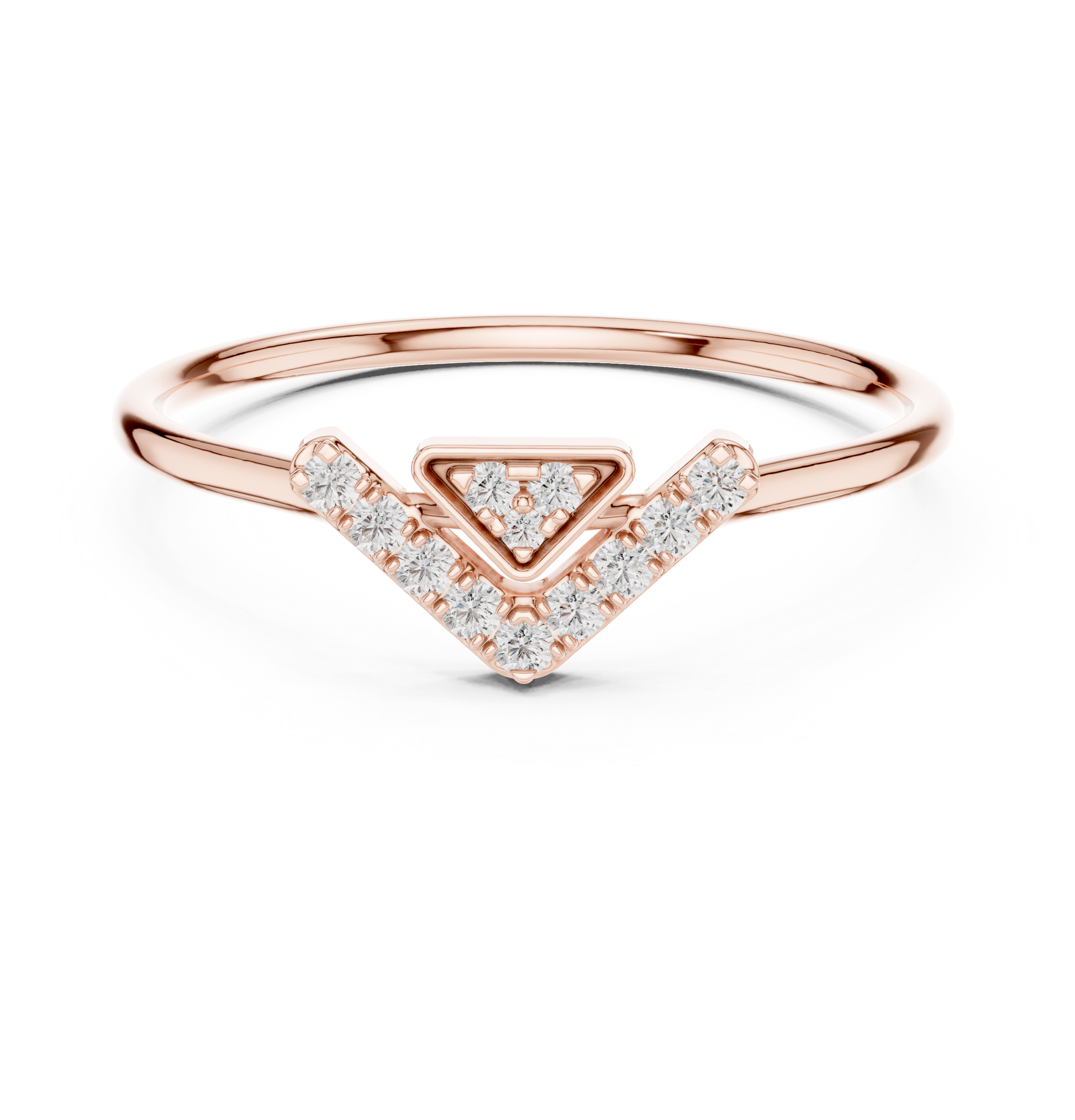 This modern gold ring features a striking double-chevron silhouette adorned with brilliant pave set diamonds, forming a refined V-shaped contour with a distinctive triangular accent at the center. The layered geometry creates depth and symmetry, allowing light to reflect beautifully from every angle while maintaining a sleek, minimalist profile. Finished with a smooth high-polish band, this ring is designed to elevate both standalone wear and stacked bridal styling. A sophisticated blend of architectural design and contemporary elegance, perfect for those who appreciate modern luxury with a bold yet delicate edge.