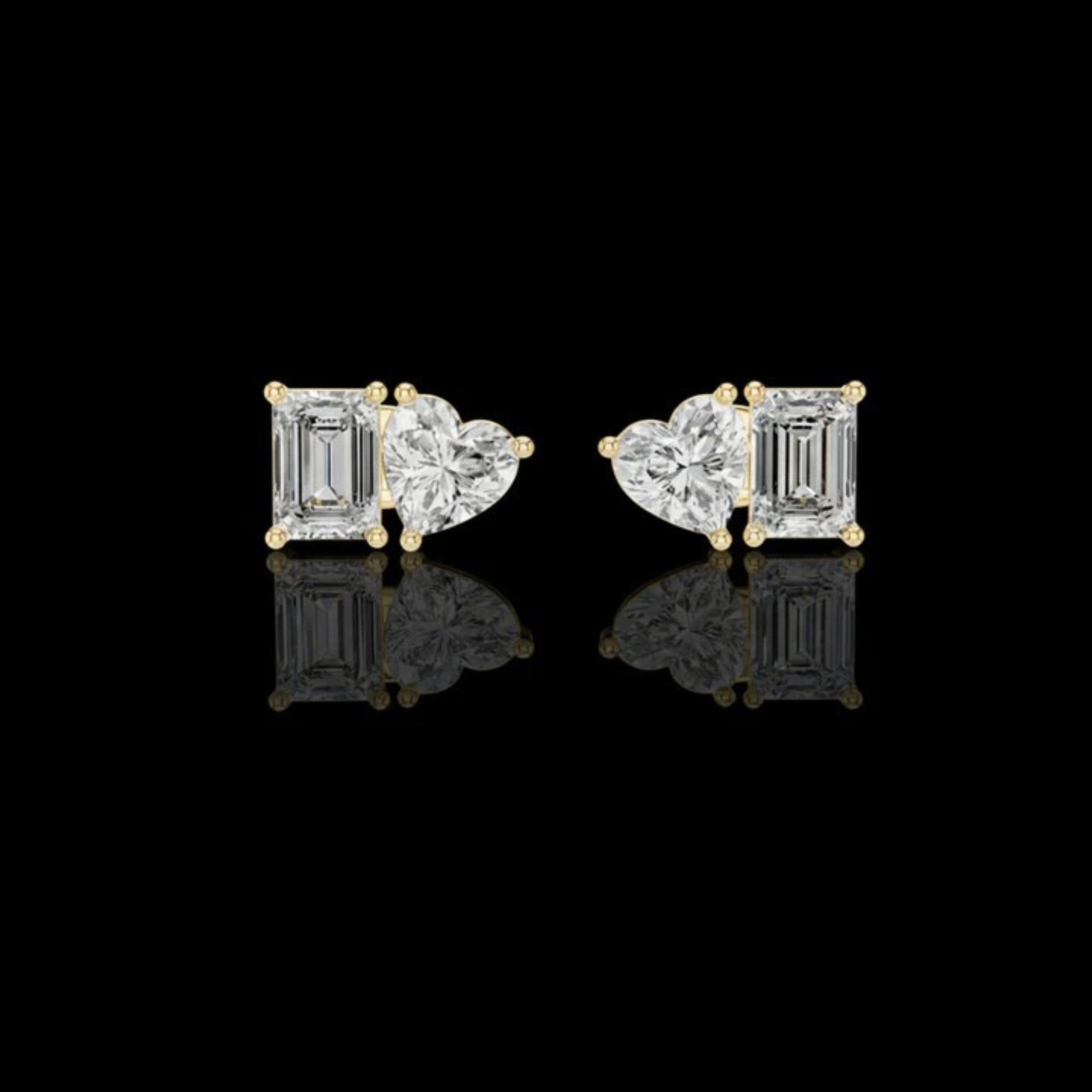 Designed for those who appreciate distinctive luxury, these dual spark diamond stud earrings combine the brilliance of two iconic cuts. The striking contrast of an emerald-cut diamond alongside a heart-shaped diamond creates a modern yet romantic silhouette that captures light from every angle.Crafted with diamonds, each stone delivers exceptional fire and precision. The finish setting enhances the clean geometry of the emerald cut while softly framing the heart shape—symbolizing strength and emotion in perfect balance.