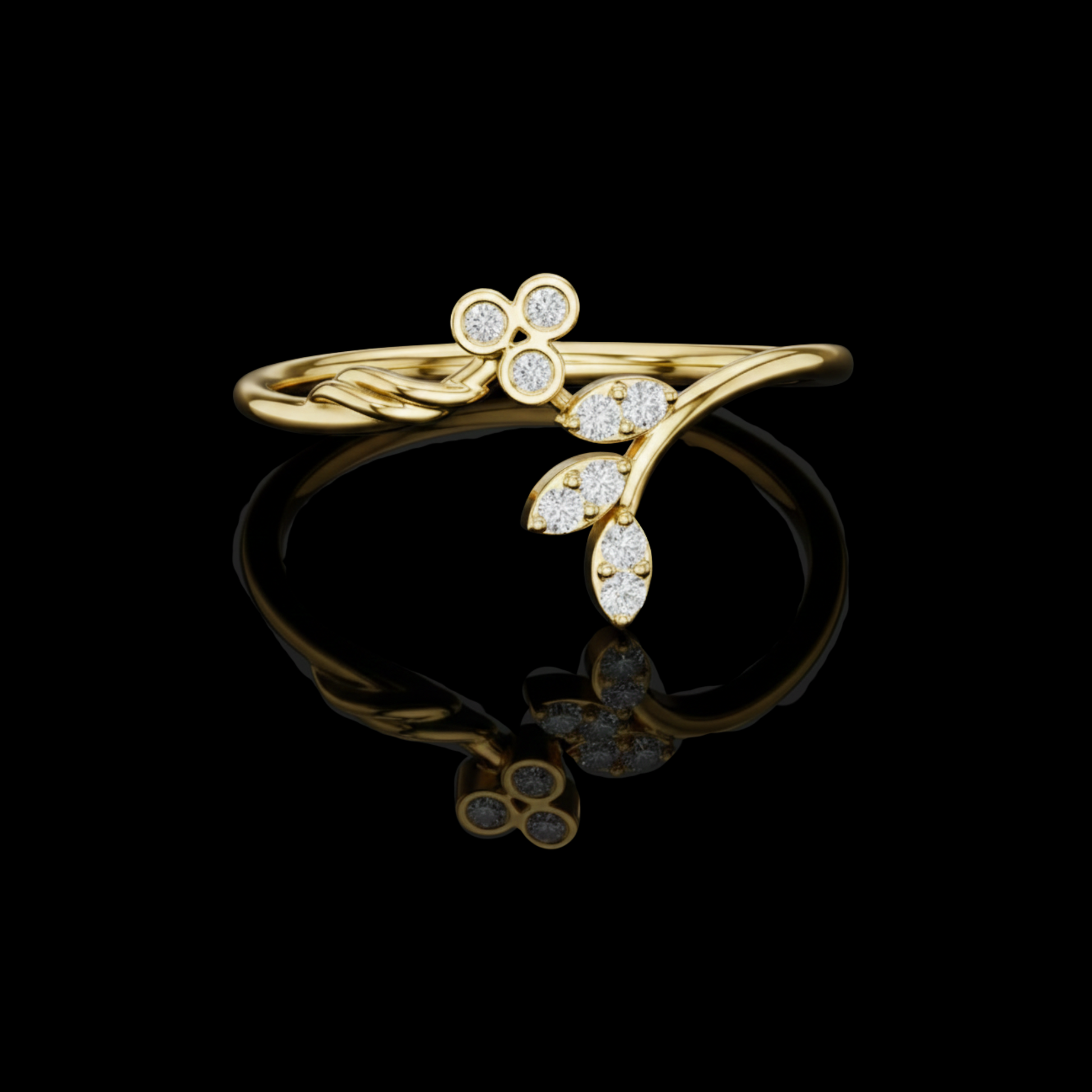 Celebrate elegance with this exquisitely crafted floral gold ring, inspired by the gentle beauty of nature. Made in radiant, the design showcases a flowing leaf motif accented with sparkling pavé diamonds, while a cluster of three round diamonds forms a charming mini blossom at the top.