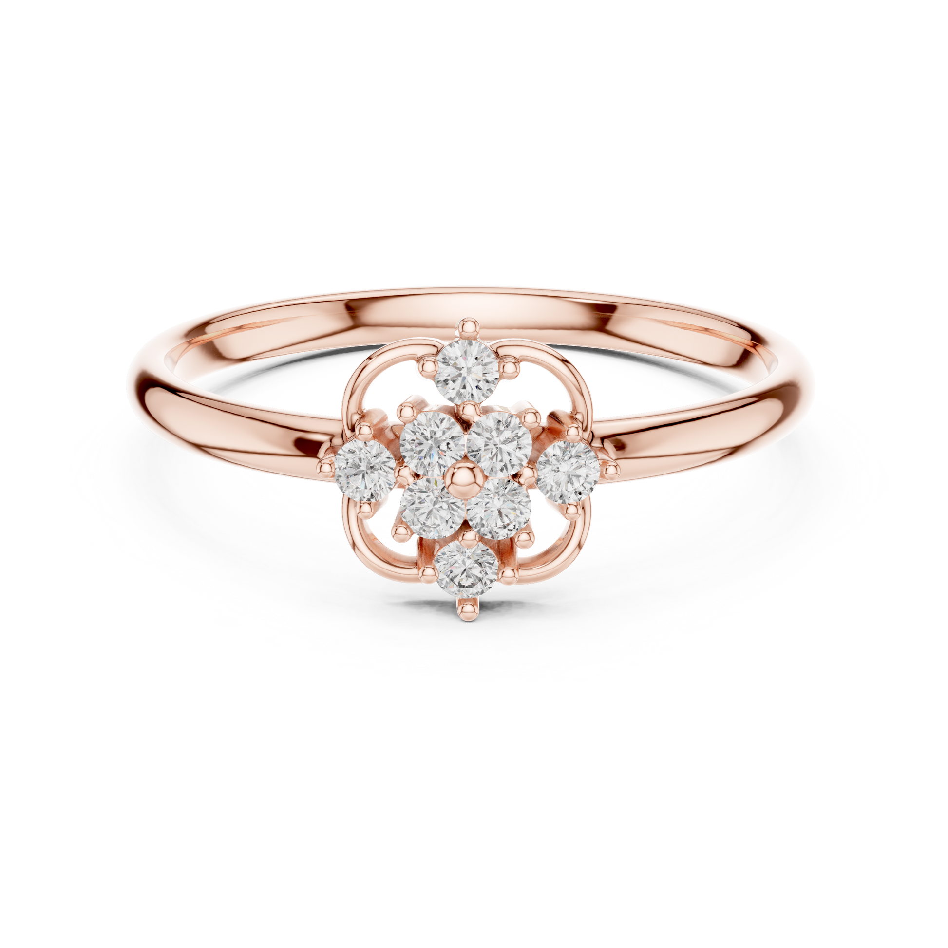 This delicate floral cluster diamond ring showcases a graceful arrangement of sparkling round diamonds set in polished yellow gold. The soft petal-like curves create a charming floral silhouette, making it a perfect piece for everyday elegance. Lightweight, timeless, and beautifully detailed, this ring adds a touch of sparkle to any look and makes a thoughtful gift for someone special.