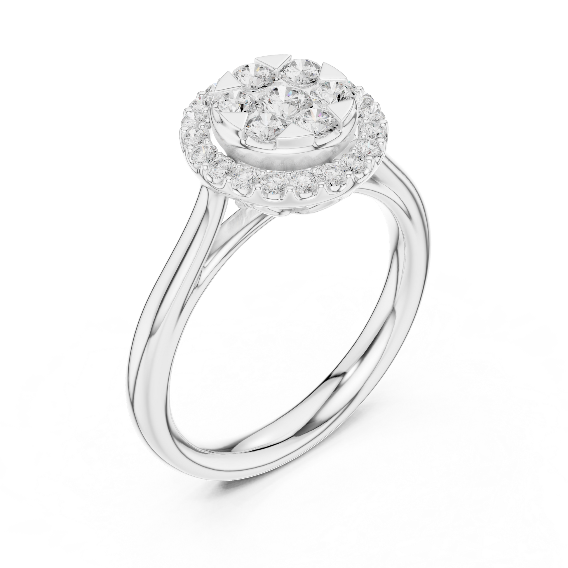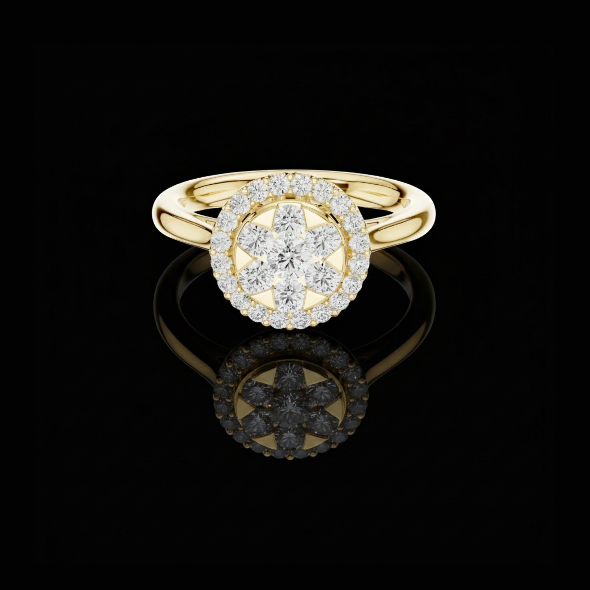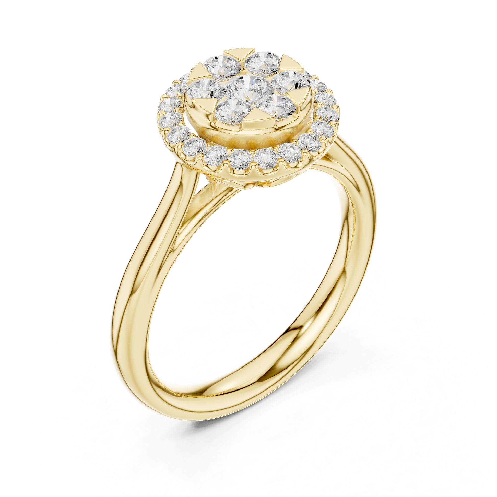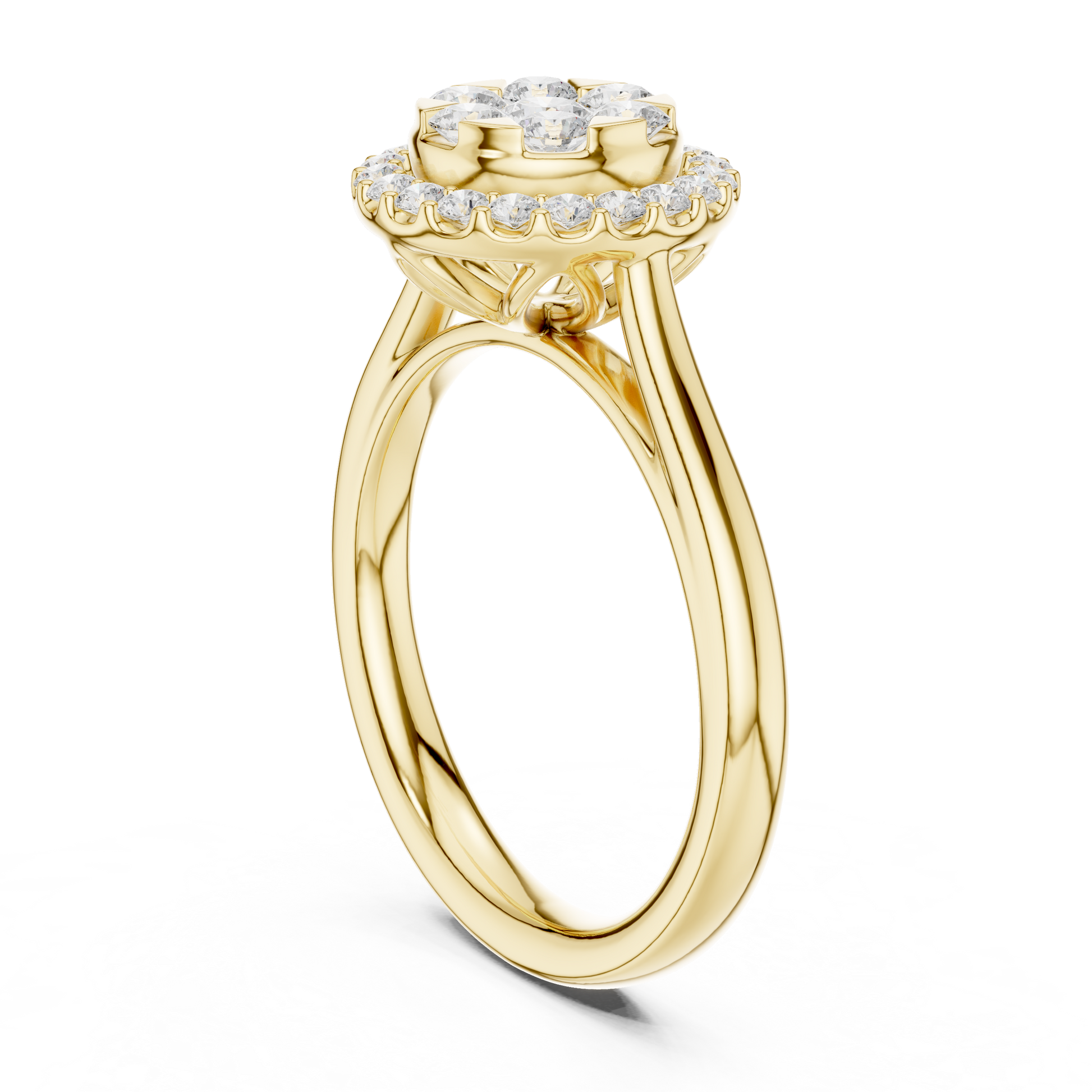 Introducing a radiant masterpiece from Ivevar Luxury, this floral-inspired halo ring captures the essence of timeless elegance and artistic craftsmanship. The centerpiece features a brilliant round shaped diamond cluster encircled by a halo of shimmering round stones, creating a breathtaking sparkle from every angle. Its polished gold band enhances the design’s warmth and sophistication, embodying luxury, craftsmanship, and refined beauty.