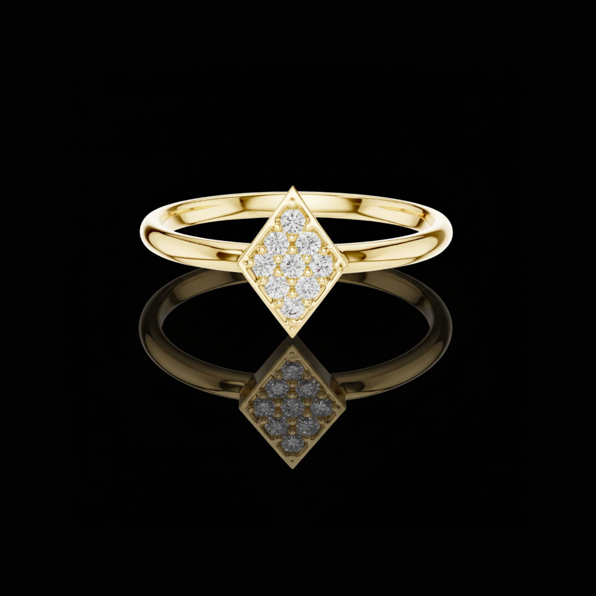 This stunning rhombus-shaped diamond ring captures a perfect balance of modern geometry, timeless sparkle, and refined elegance. Crafted by Ivevar Luxury, it features a delicately polished gold band that frames a brilliant cluster of round-cut diamonds arranged inside a sleek diamond-shaped motif. The design highlights exceptional craftsmanship, ensuring the piece shines effortlessly from every angle. Lightweight and versatile, this ring delivers luxury for everyday wear while remaining sophisticated enough for special occasions. A true symbol of subtle glamour and contemporary style.