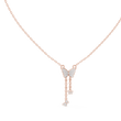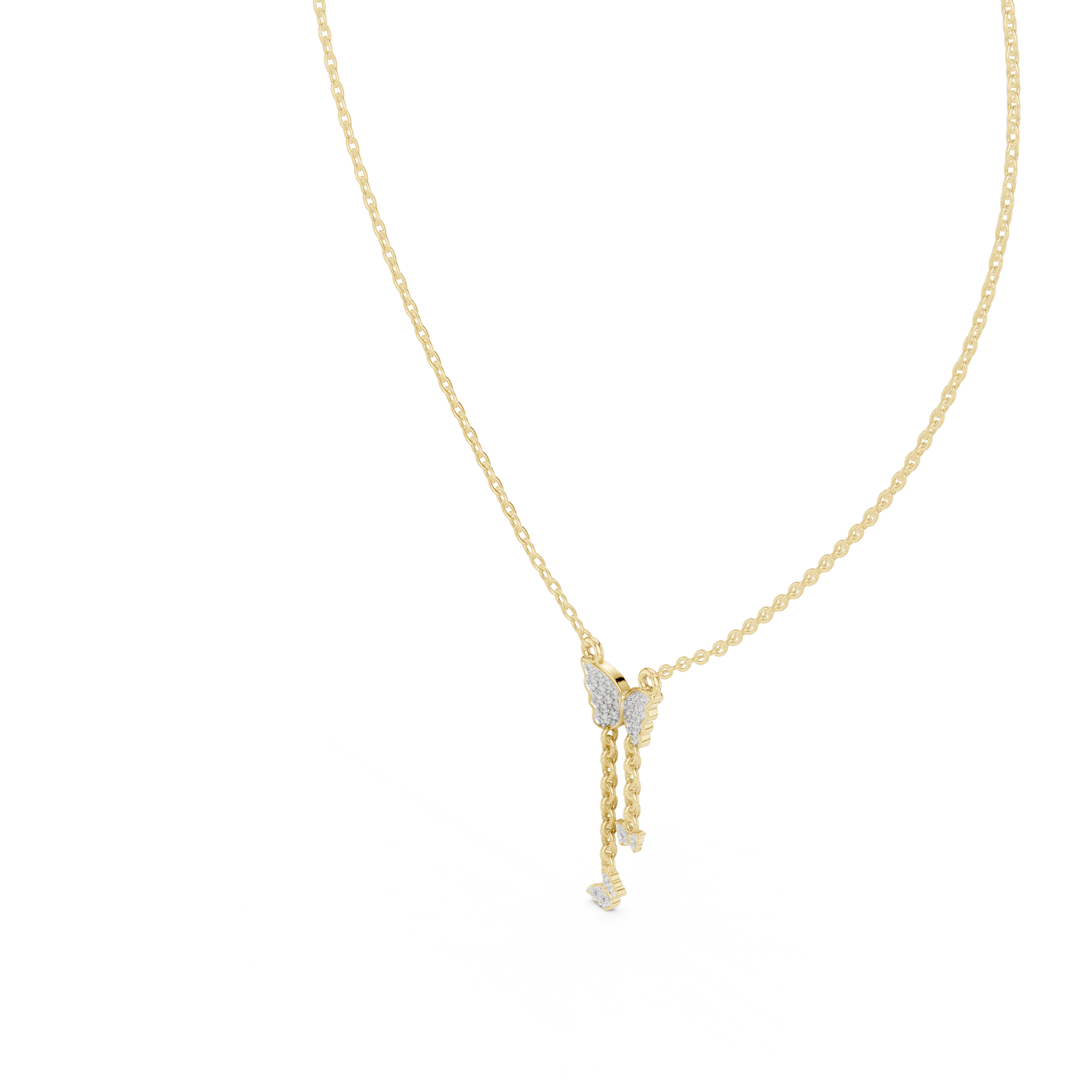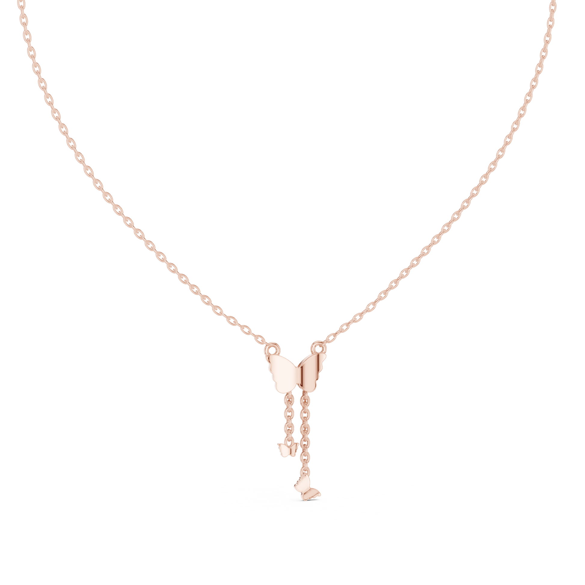 This elegant butterfly drop pendant features a delicate gold-tone chain centered with a sparkling butterfly charm, adorned with shimmering pavé-style stones that catch the light beautifully. Two fine dangling chains extend below, each finished with smaller butterfly accents for graceful movement and a layered look. Feminine and refined, this pendant blends playful charm with timeless elegance, making it perfect for everyday wear or as a meaningful gift symbolizing transformation, beauty, and freedom.