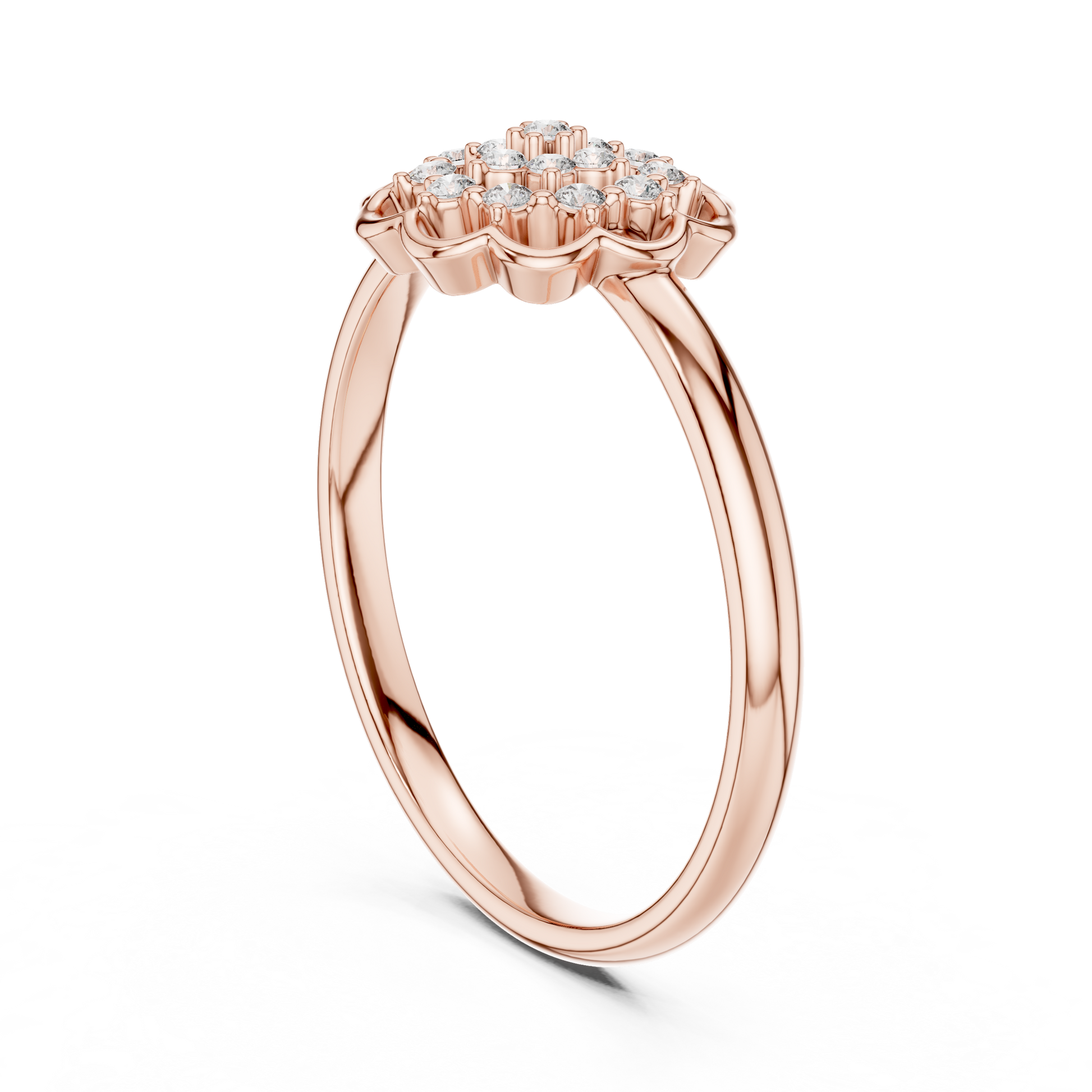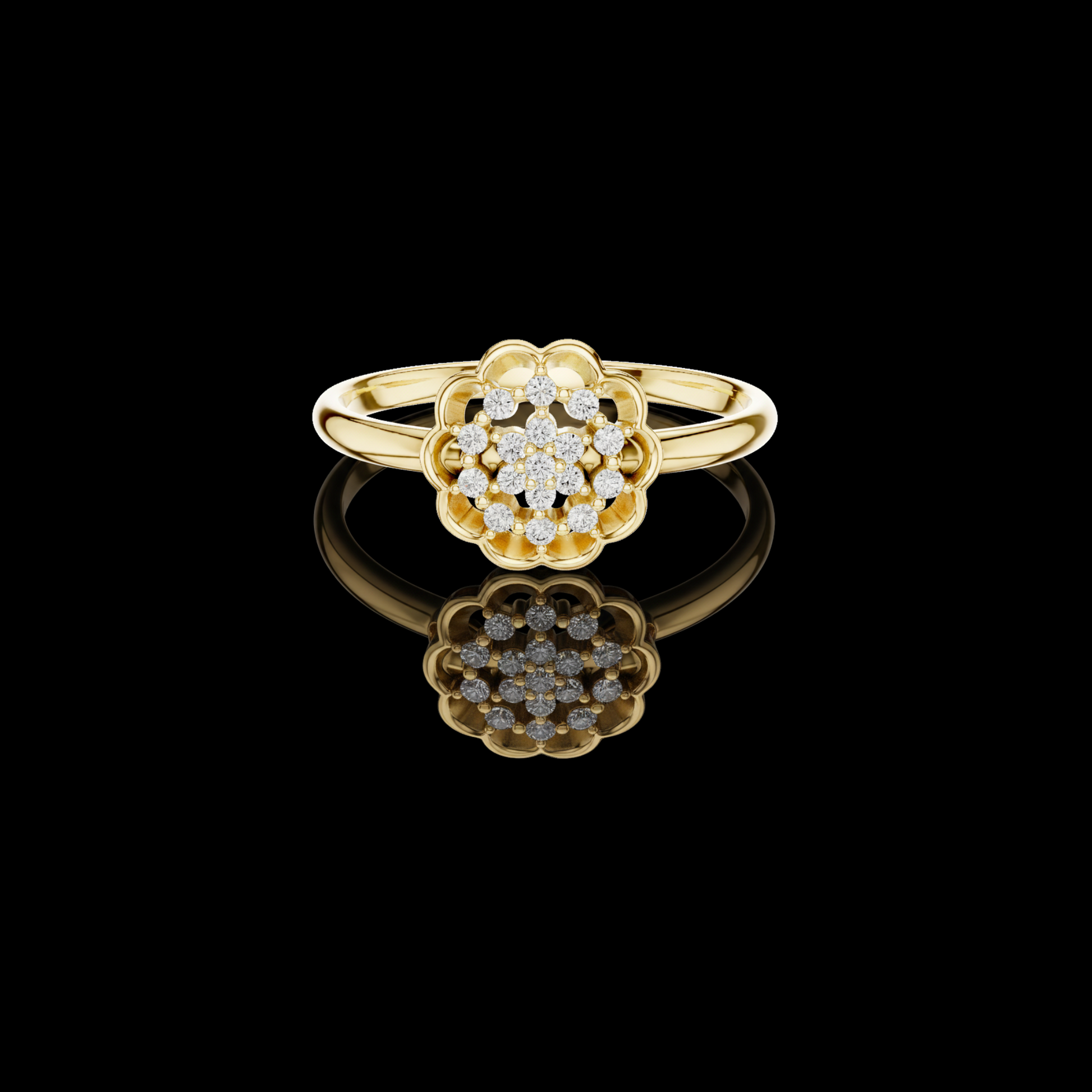 The Radiant Petal Diamond Ring captures the poetry of light through an intricate flower-inspired diamond cluster. Each carefully placed diamond forms a radiant center, framed by softly sculpted petal-shaped contours that enhance depth and dimension.Crafted in warm, the sleek band balances the ornate centerpiece with effortless elegance. Perfect for those drawn to romantic sophistication, this ring shines as a statement of femininity, a celebration gift, or a treasured piece of everyday luxury.
