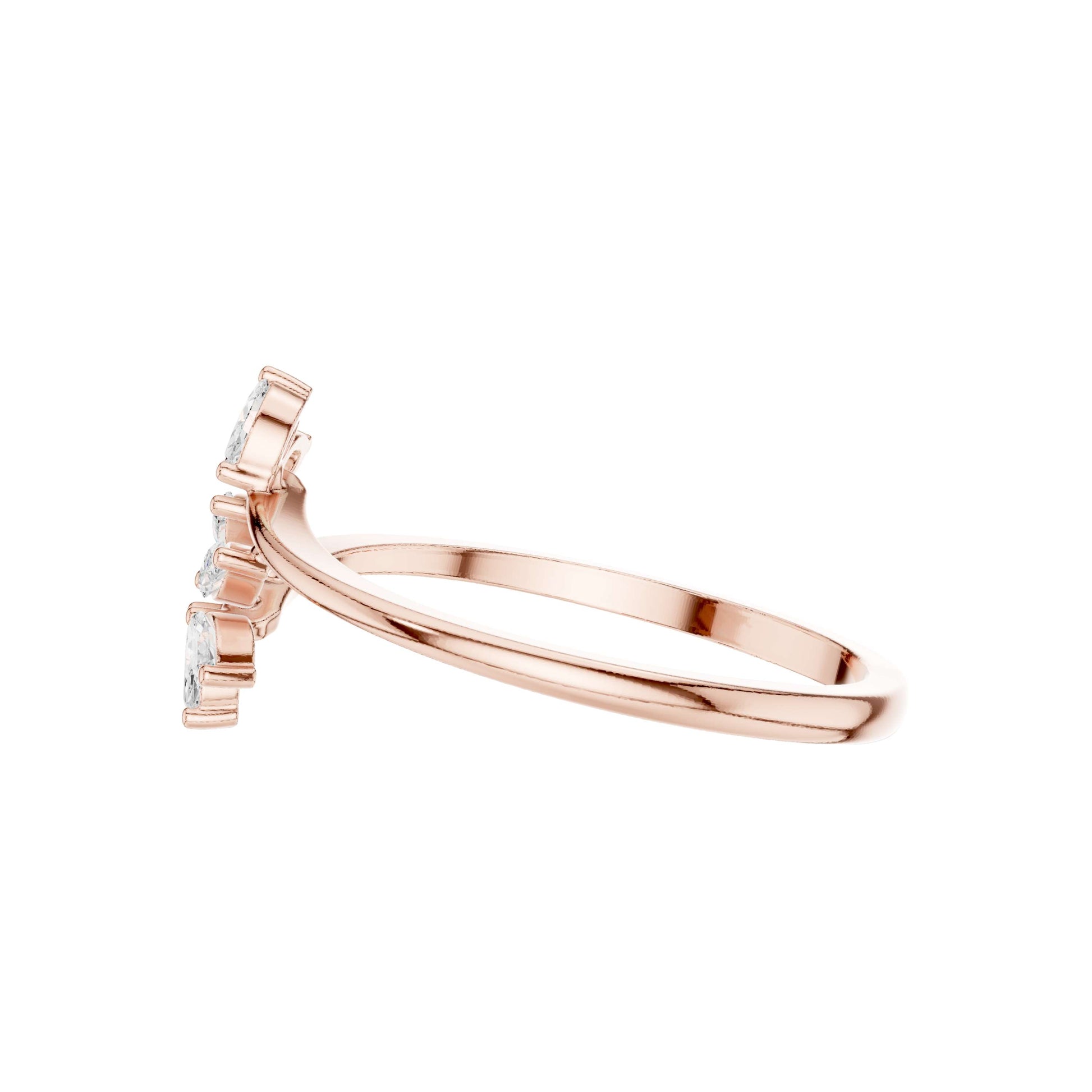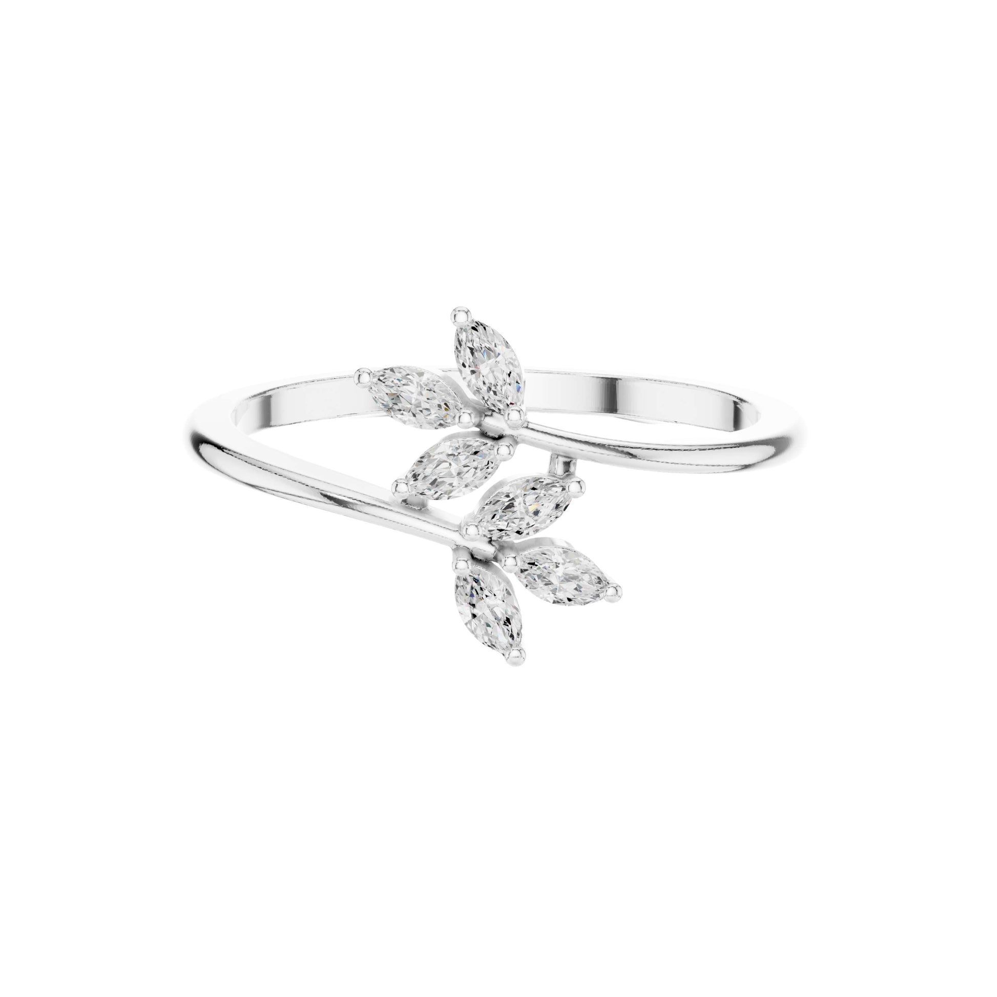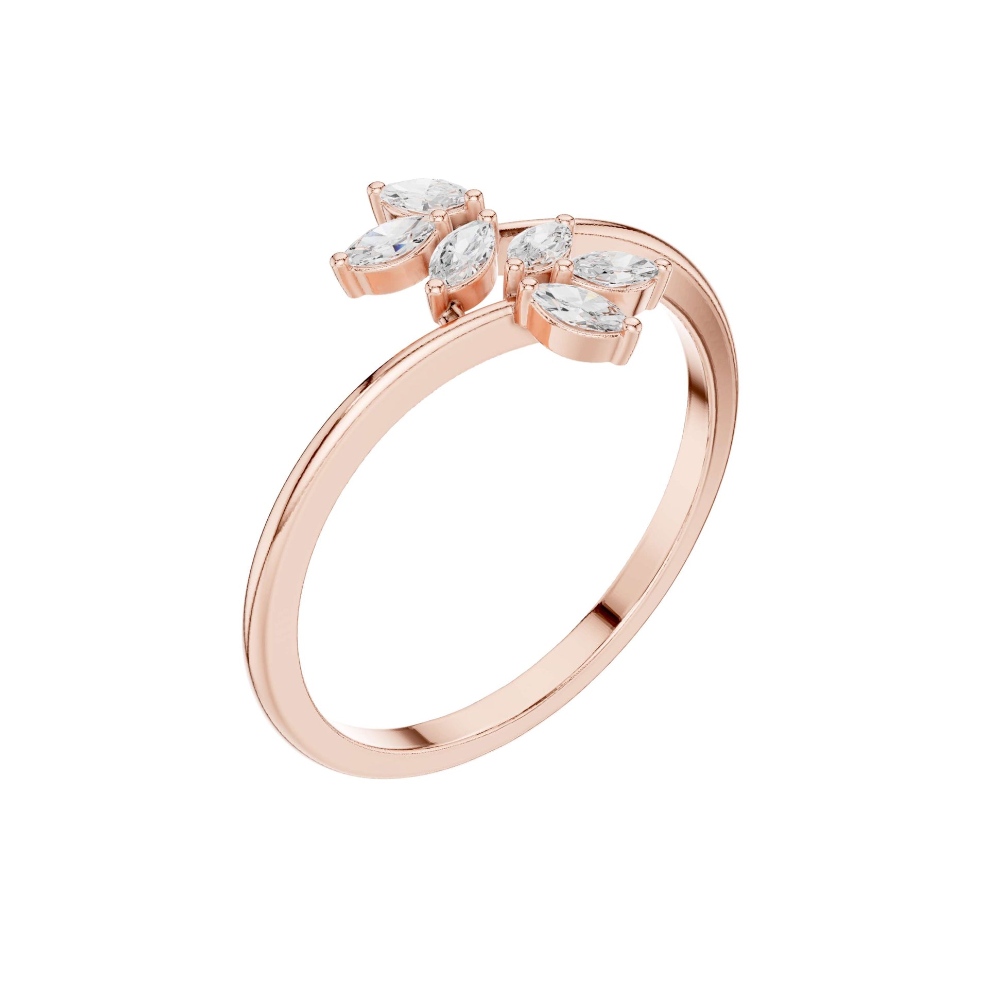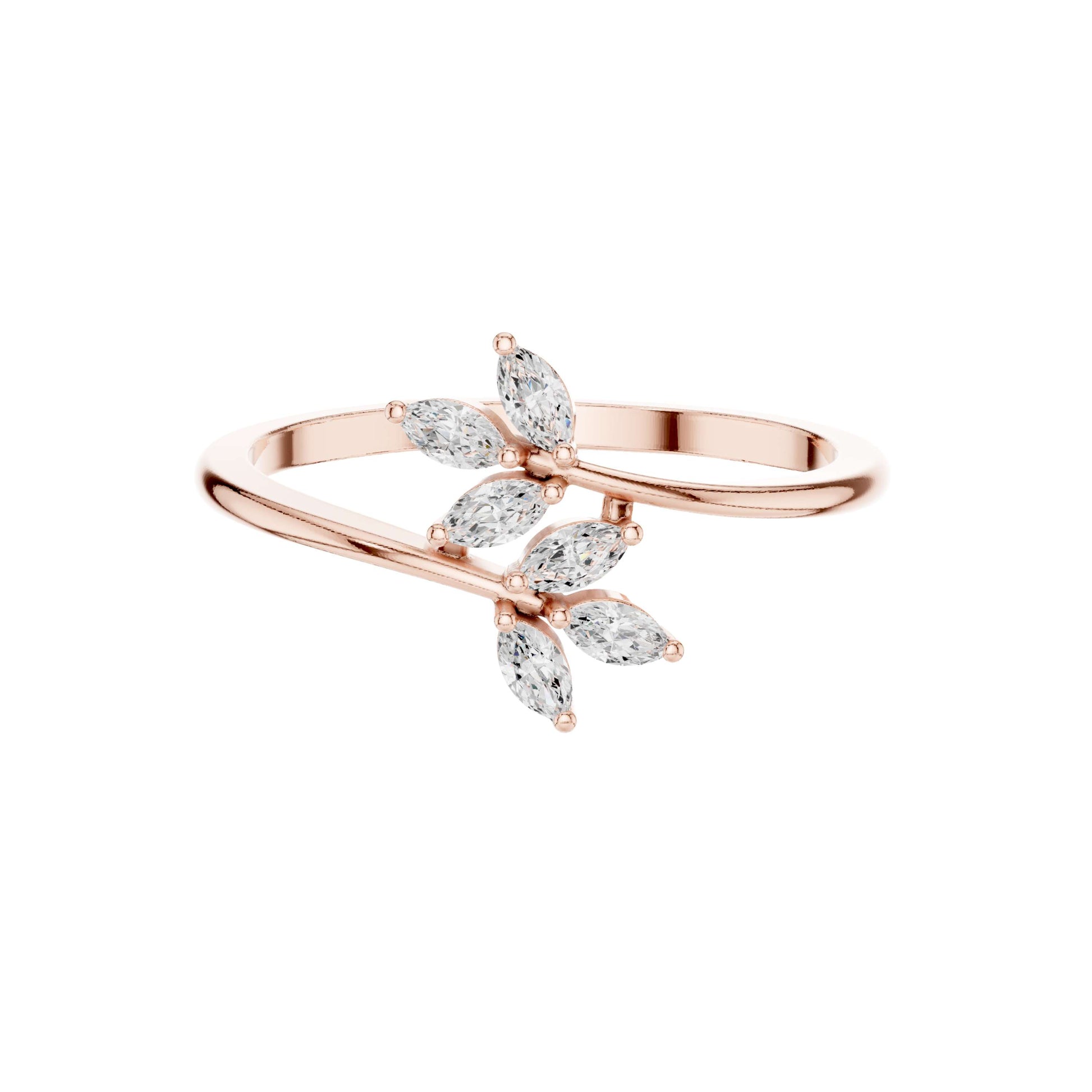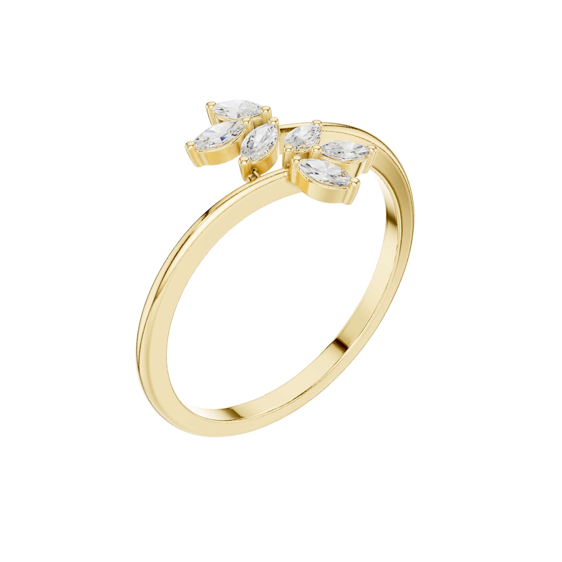This elegant gold ring showcases a graceful branch-inspired design adorned with shimmering marquise-cut diamonds arranged like delicate leaves. The open-band silhouette adds a modern, airy feel, while the elongated marquise stones catch the light beautifully, creating a refined sparkle from every angle. Feminine yet contemporary, this nature-inspired diamond ring is perfect for stacking or wearing solo as a subtle statement of effortless luxury and organic beauty by Ivevar.