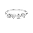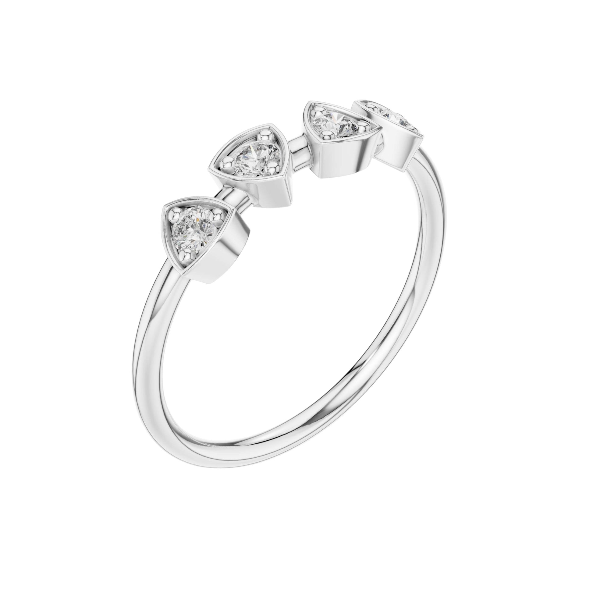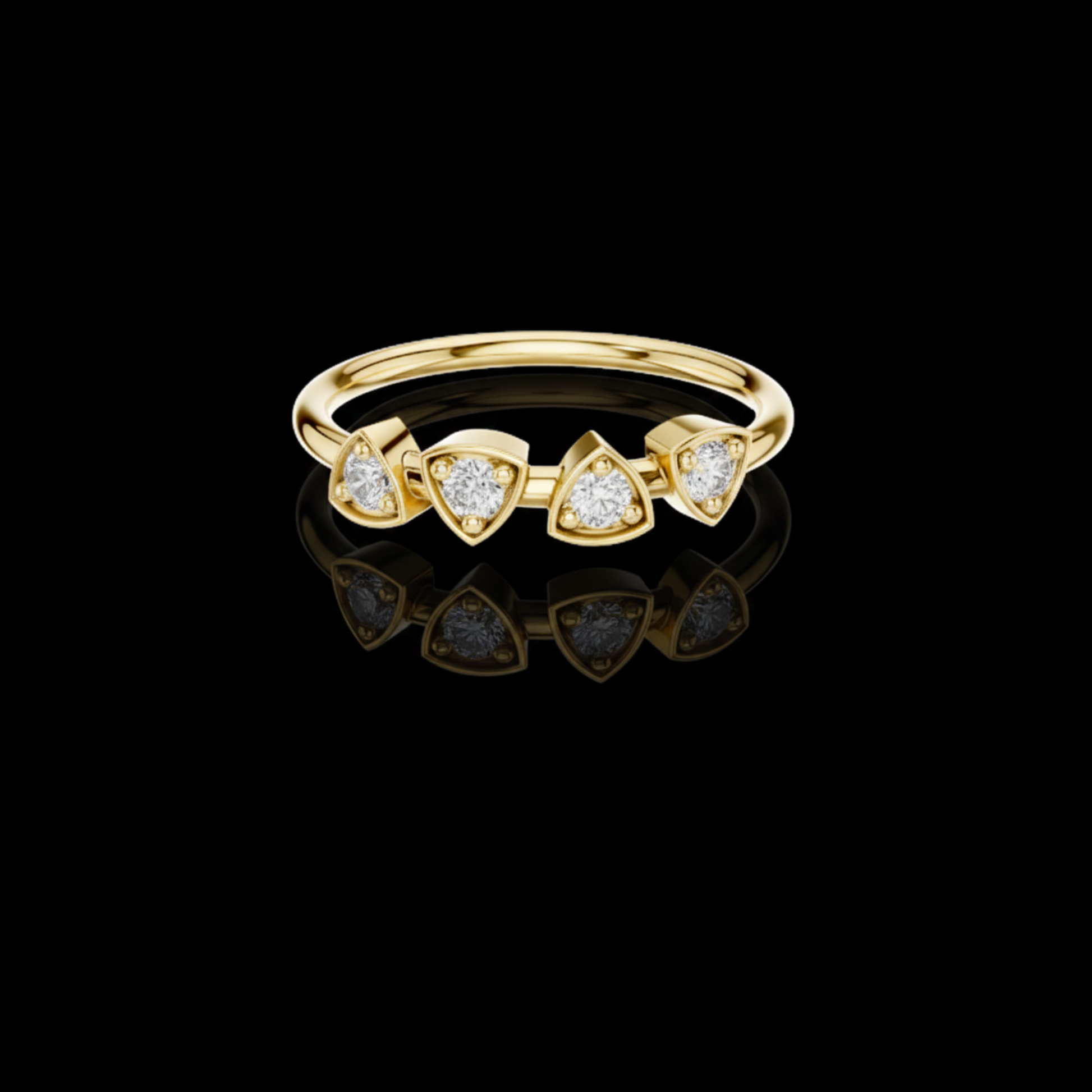 This elegant gold ring features a refined row of four sparkling round-cut diamonds, each securely set in a modern trillion shape bezel-style setting that highlights their unique triangular shape. The warm glow of the polished gold band beautifully contrasts with the brilliance of the diamonds, creating a balanced design that feels both contemporary and timeless. Perfect worn alone or stacked, this ring offers a sophisticated statement of understated luxury and everyday elegance.