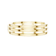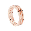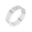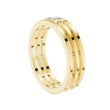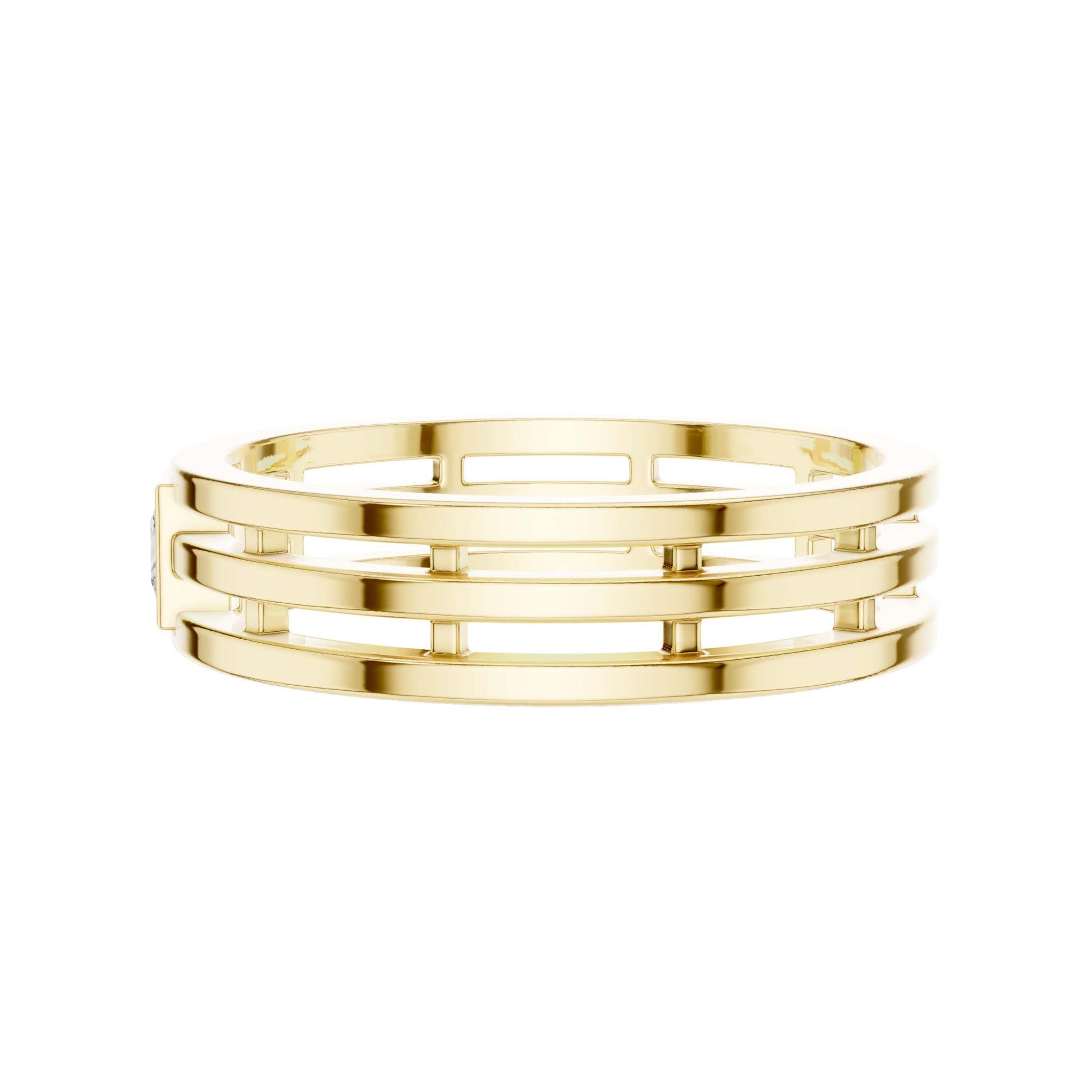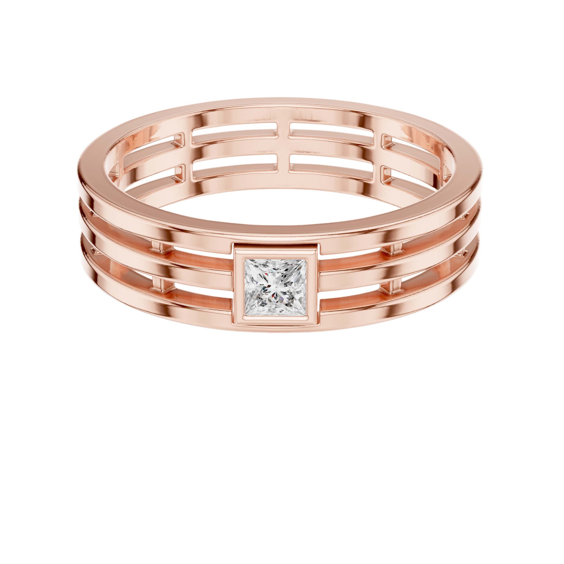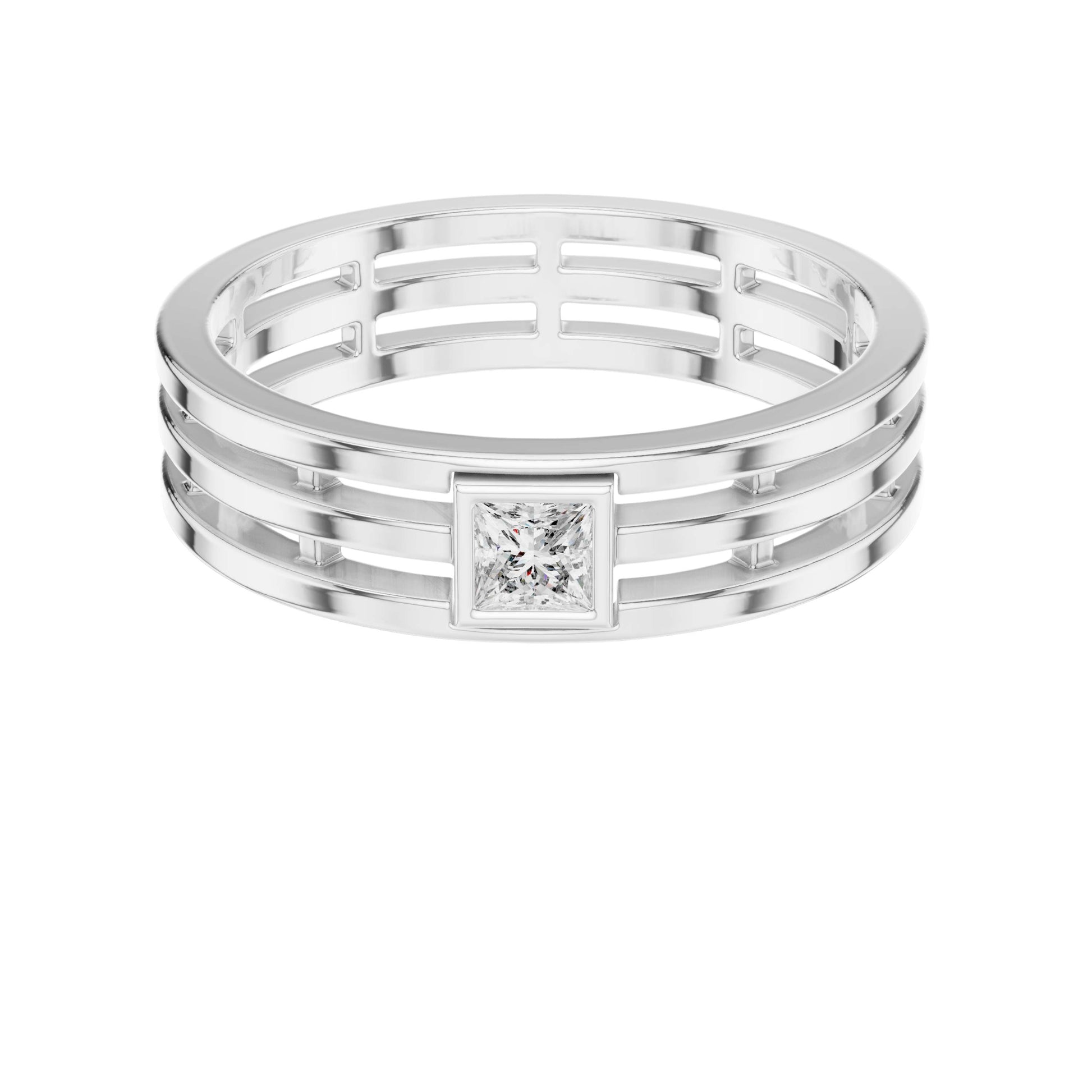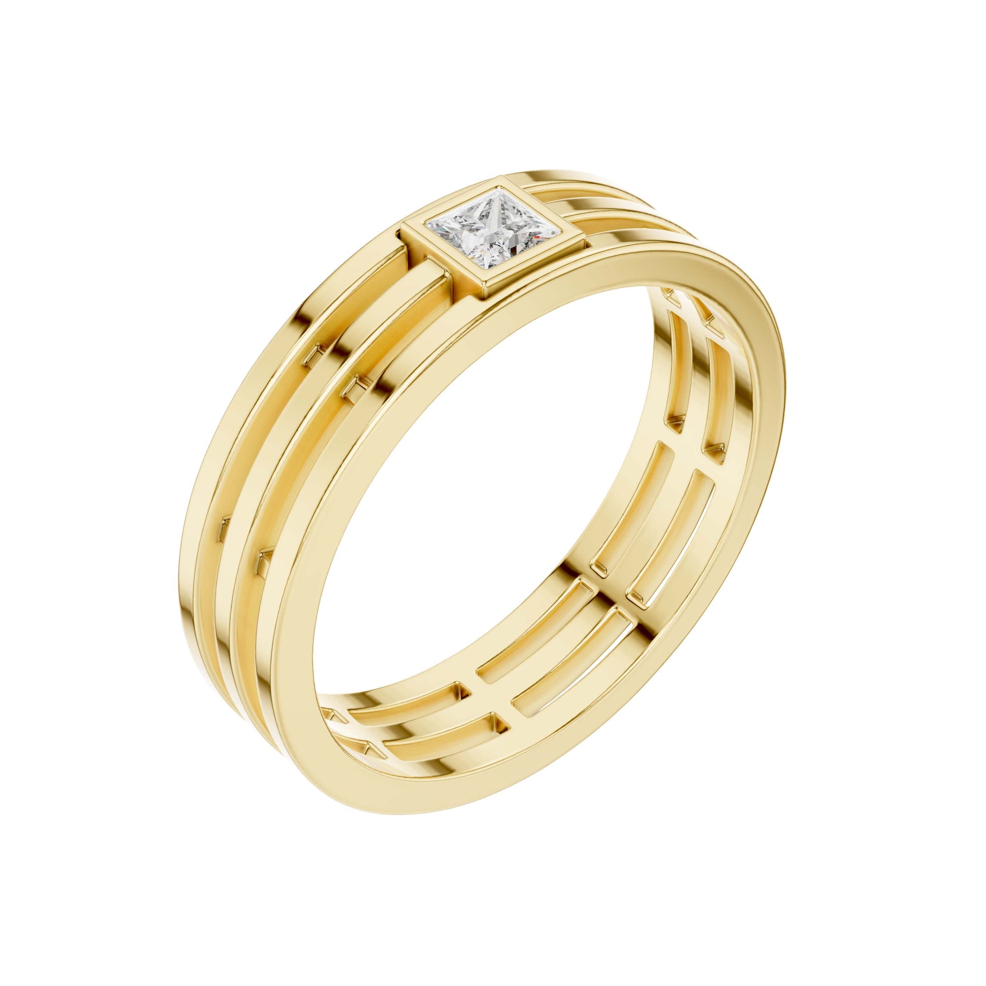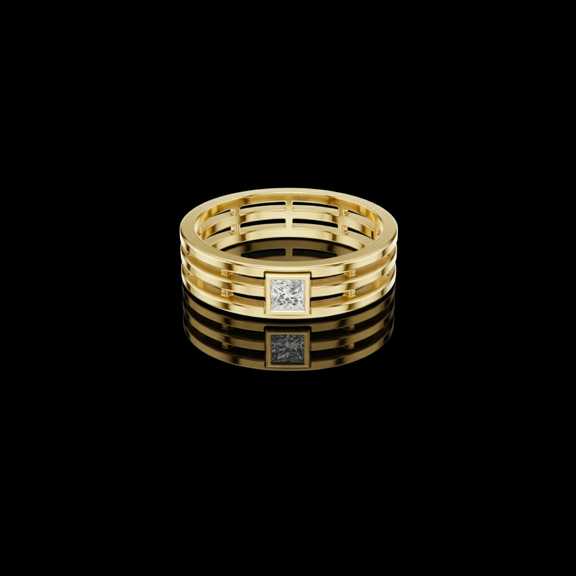 This striking gold band blends modern geometry with timeless elegance, featuring a brilliant princess-cut diamond securely bezel-set at the center. The multi-row openwork design creates depth and dimension, allowing light to flow through the band while maintaining a bold, architectural presence. Polished to a radiant finish, the ring offers a refined balance of strength and sophistication, making it an exceptional choice for those who appreciate contemporary design with a luxurious edge—perfect as a statement band, wedding ring, or meaningful everyday piece.