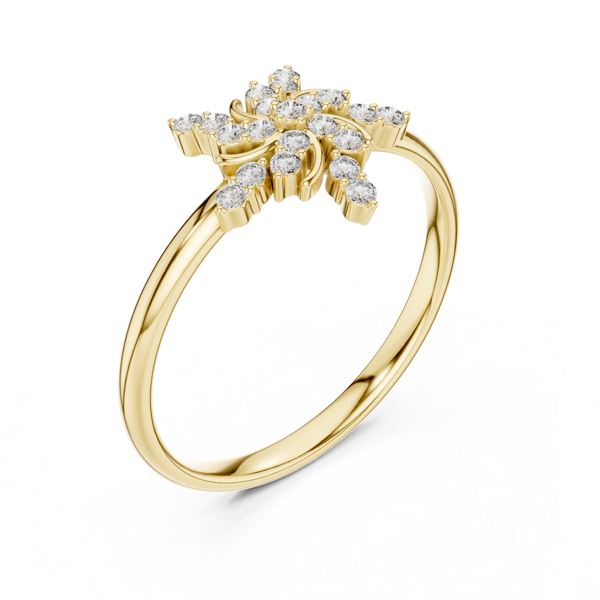This ring showcases a sun-inspired floral burst, crafted in rich gold and accented with clusters of radiant diamonds that form a shimmering petal constellation. Each diamond is set to create a sense of movement and luminous energy, giving the piece a naturally flowing, celestial-bloom aesthetic. The split-shank band enhances its elegance, while the intricate arrangement of petals adds a touch of artistic sophistication. A perfect blend of luxury, delicacy, and modern charm, this ring captures the essence of a golden flower illuminated by starlight.