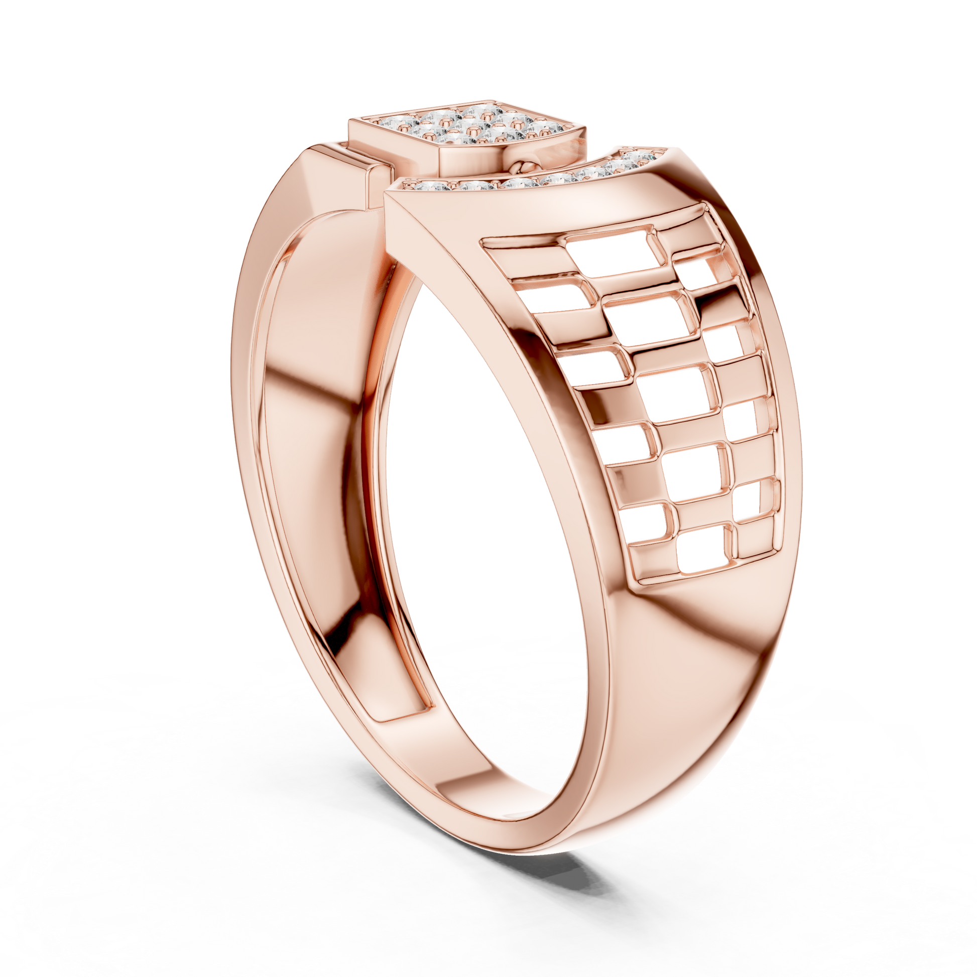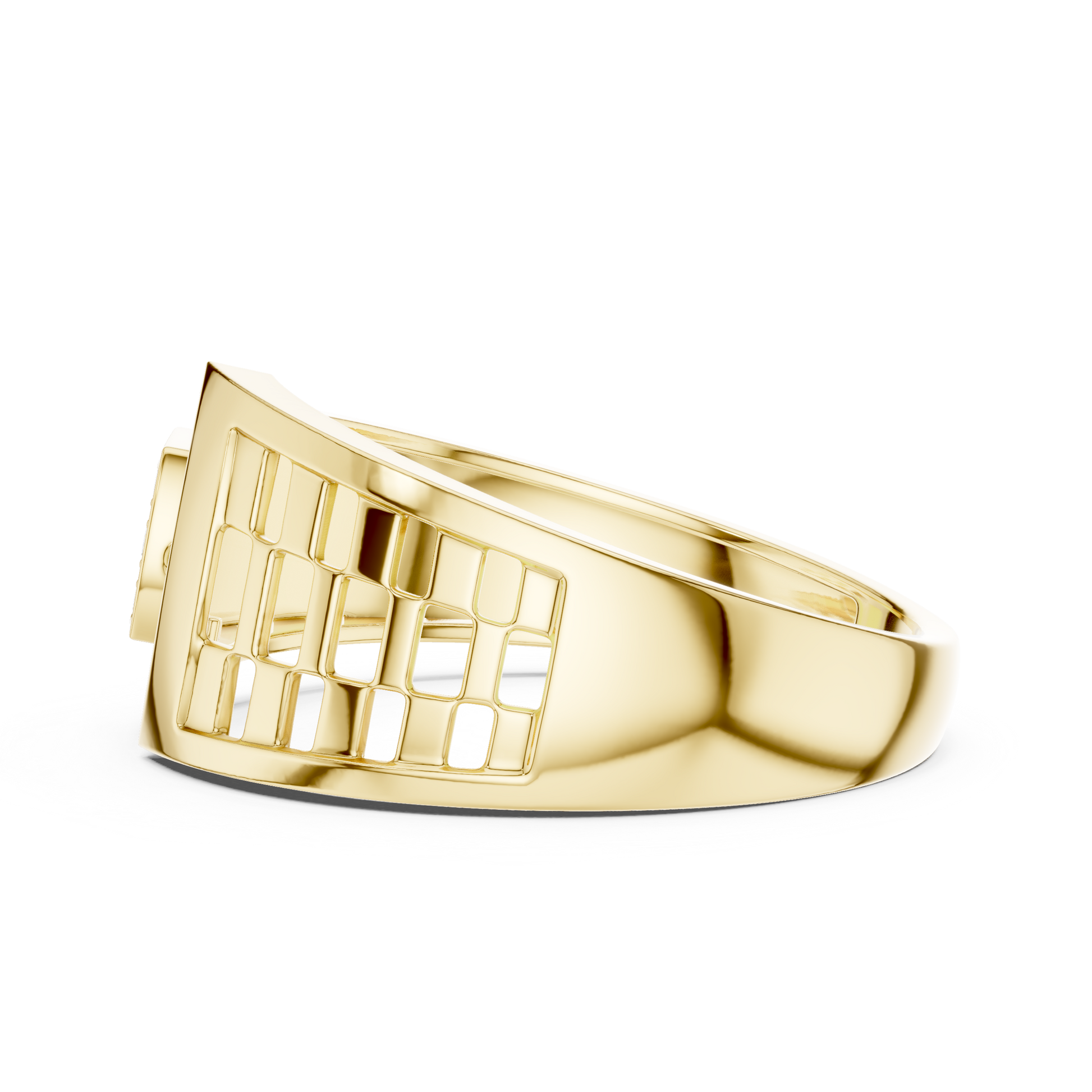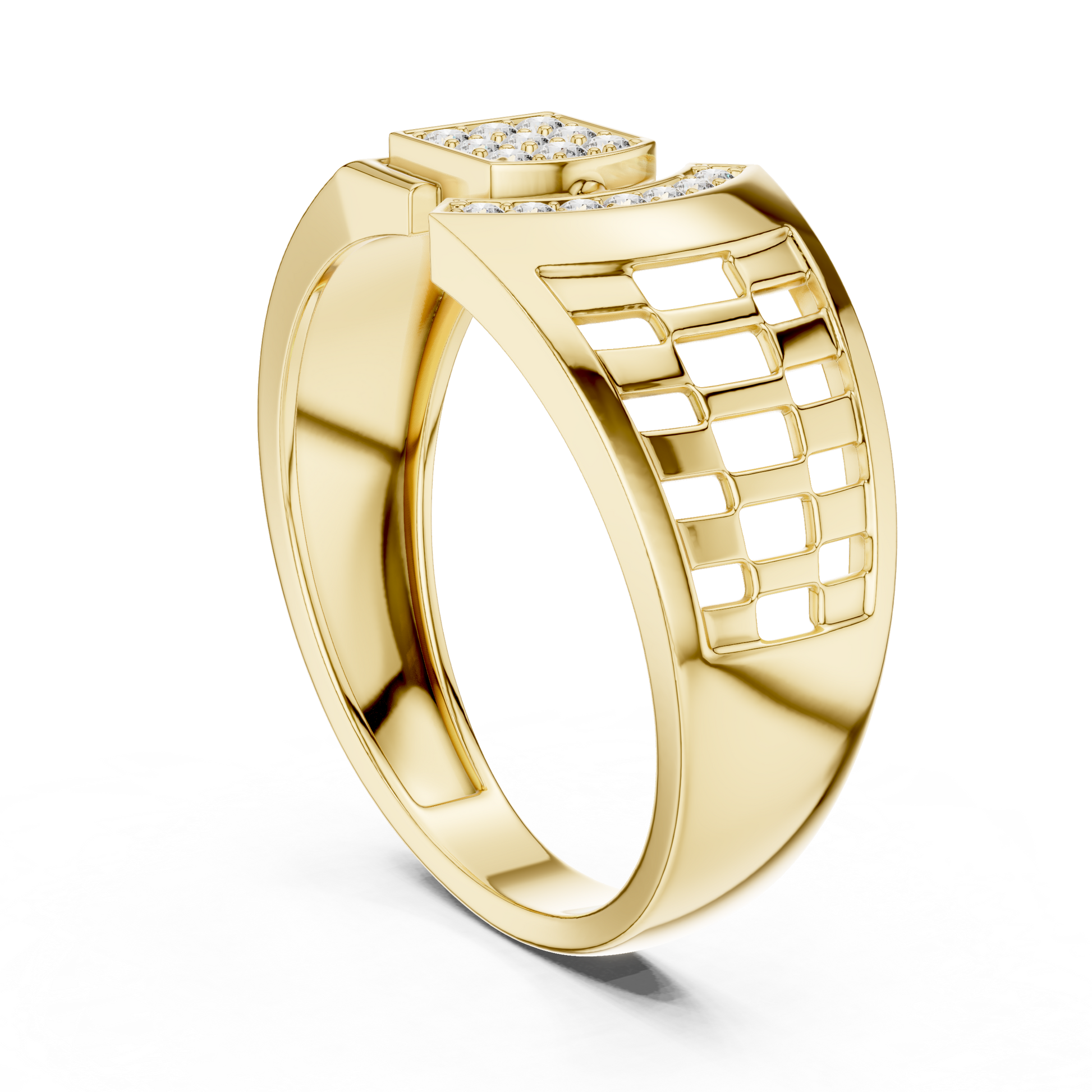 Crafted with precision, this statement ring from Ivevar Luxury showcases a bold architectural design that blends modern geometry with timeless elegance. The polished gold band features an intricate open-grid side pattern, creating depth, airflow, and a powerful visual presence. At the top, a square pave of round diamond setting paired with a curved diamond studded bar delivers exceptional brilliance and symmetry.