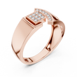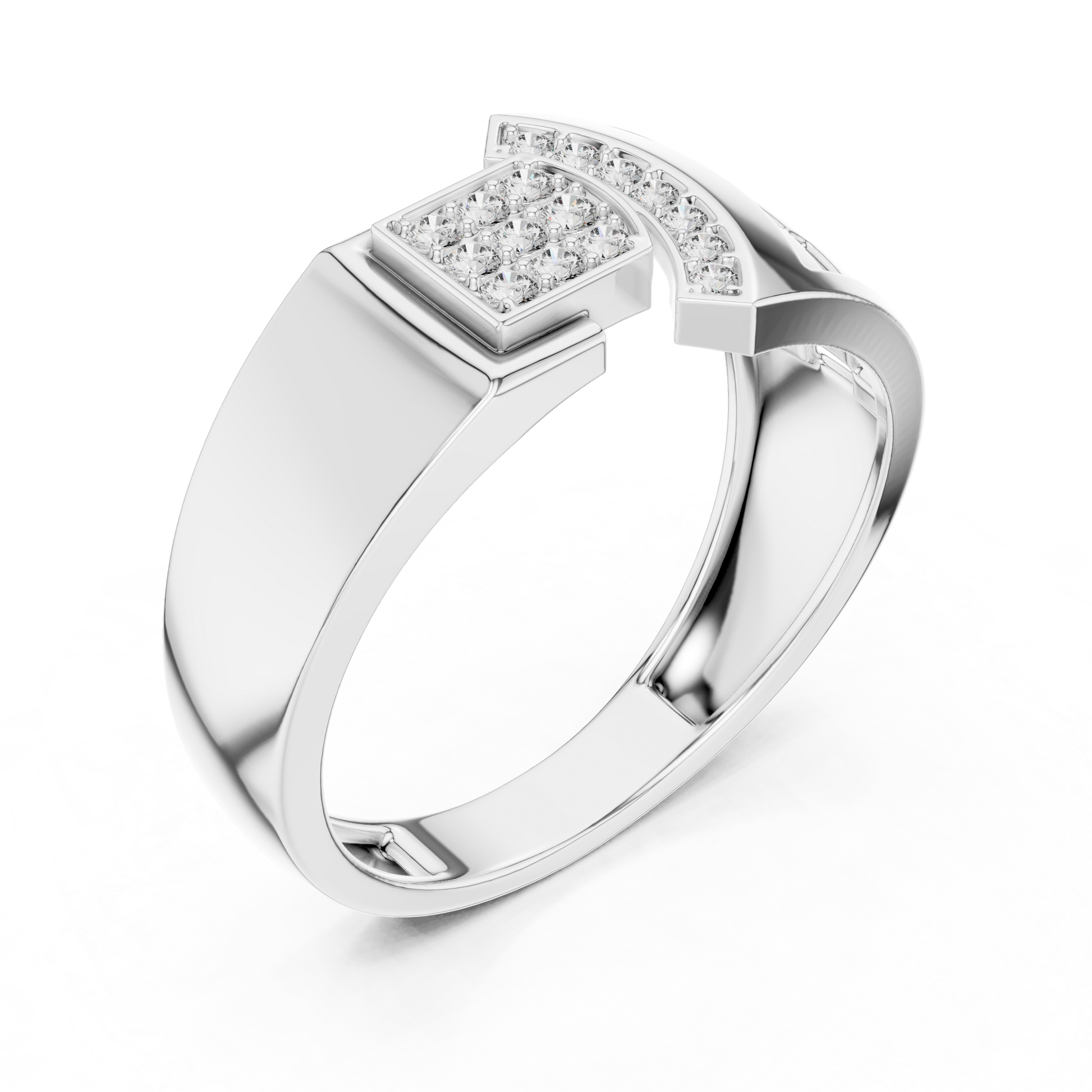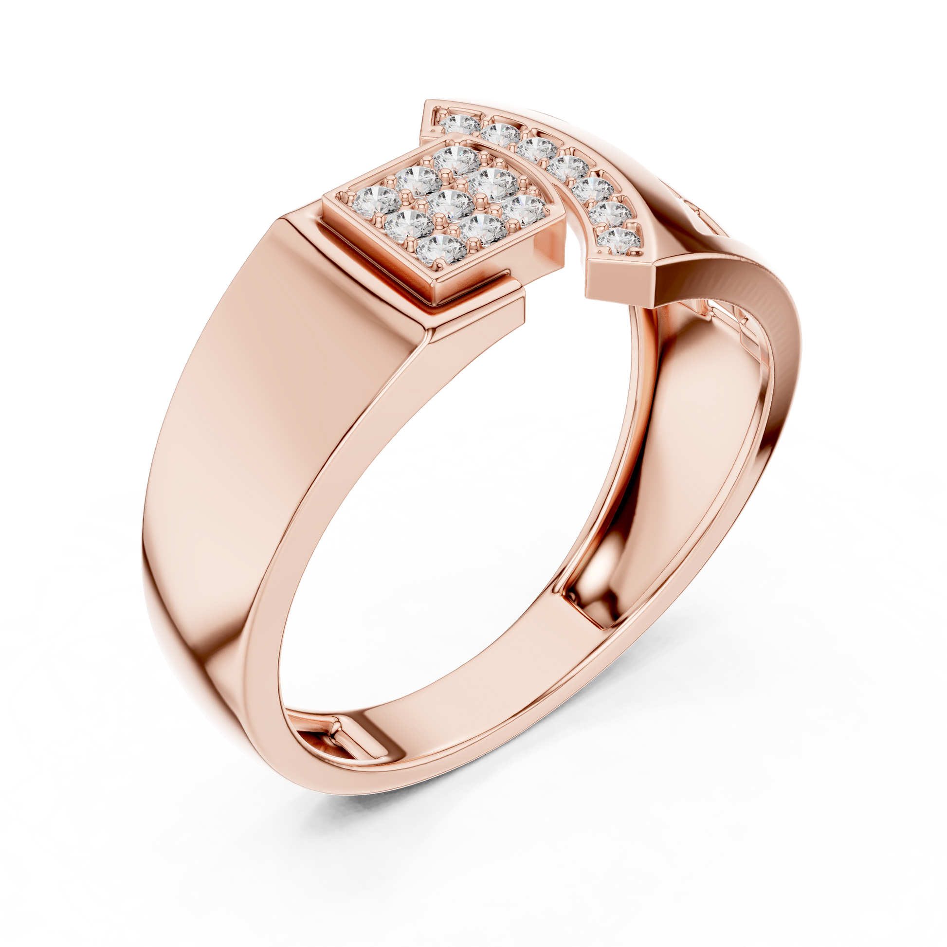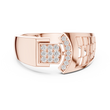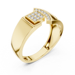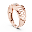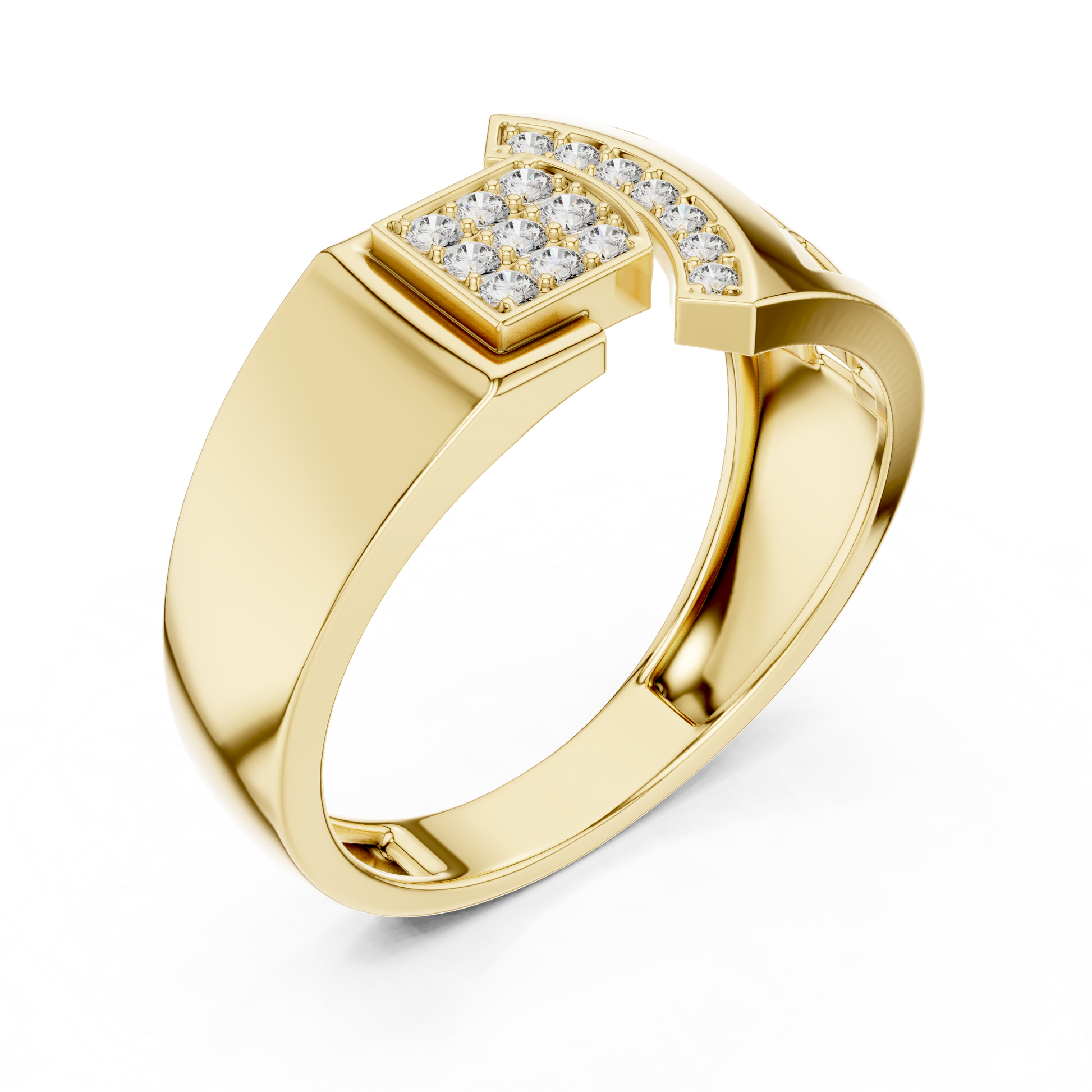Crafted with precision, this statement ring from Ivevar Luxury showcases a bold architectural design that blends modern geometry with timeless elegance. The polished gold band features an intricate open-grid side pattern, creating depth, airflow, and a powerful visual presence. At the top, a square pave of round diamond setting paired with a curved diamond studded bar delivers exceptional brilliance and symmetry.