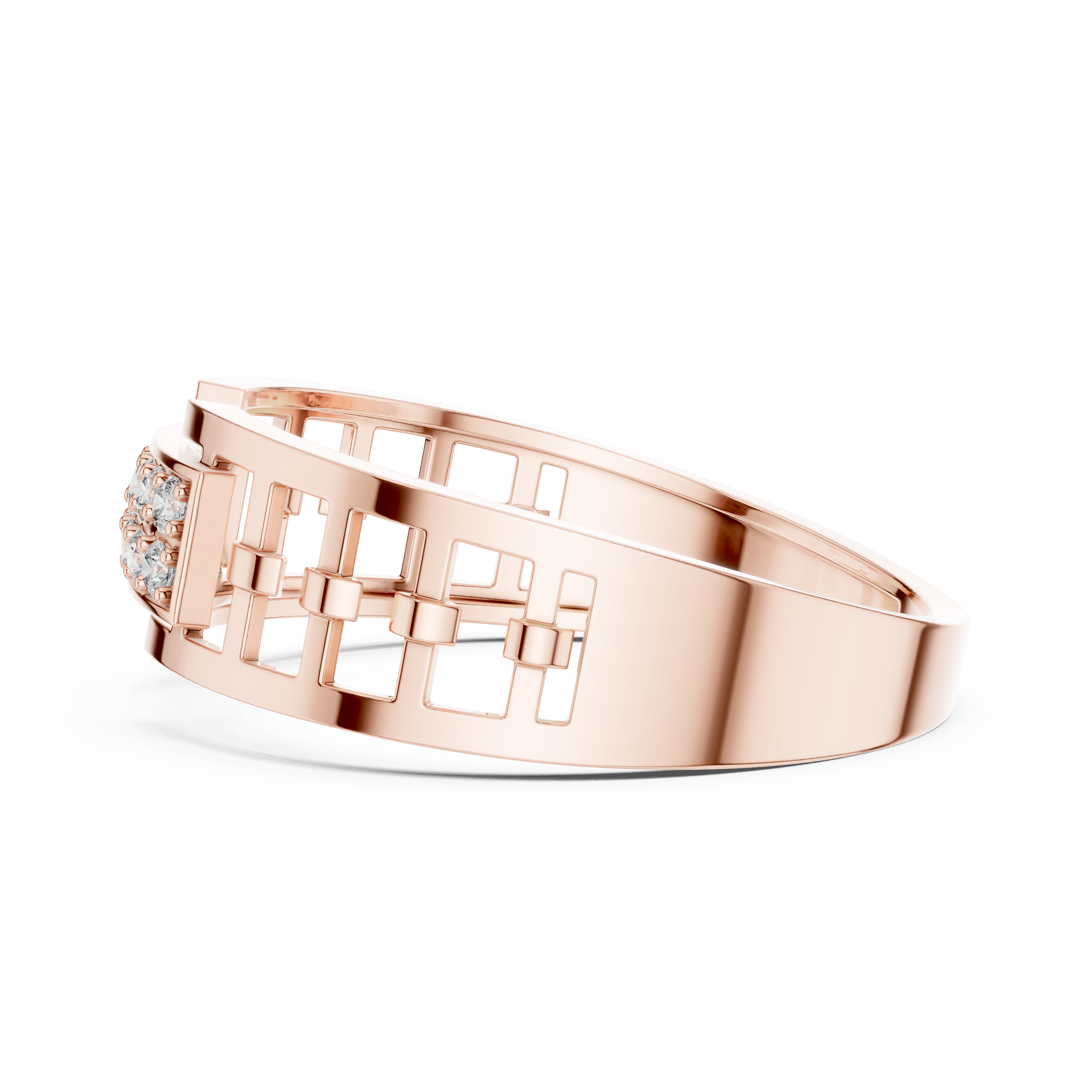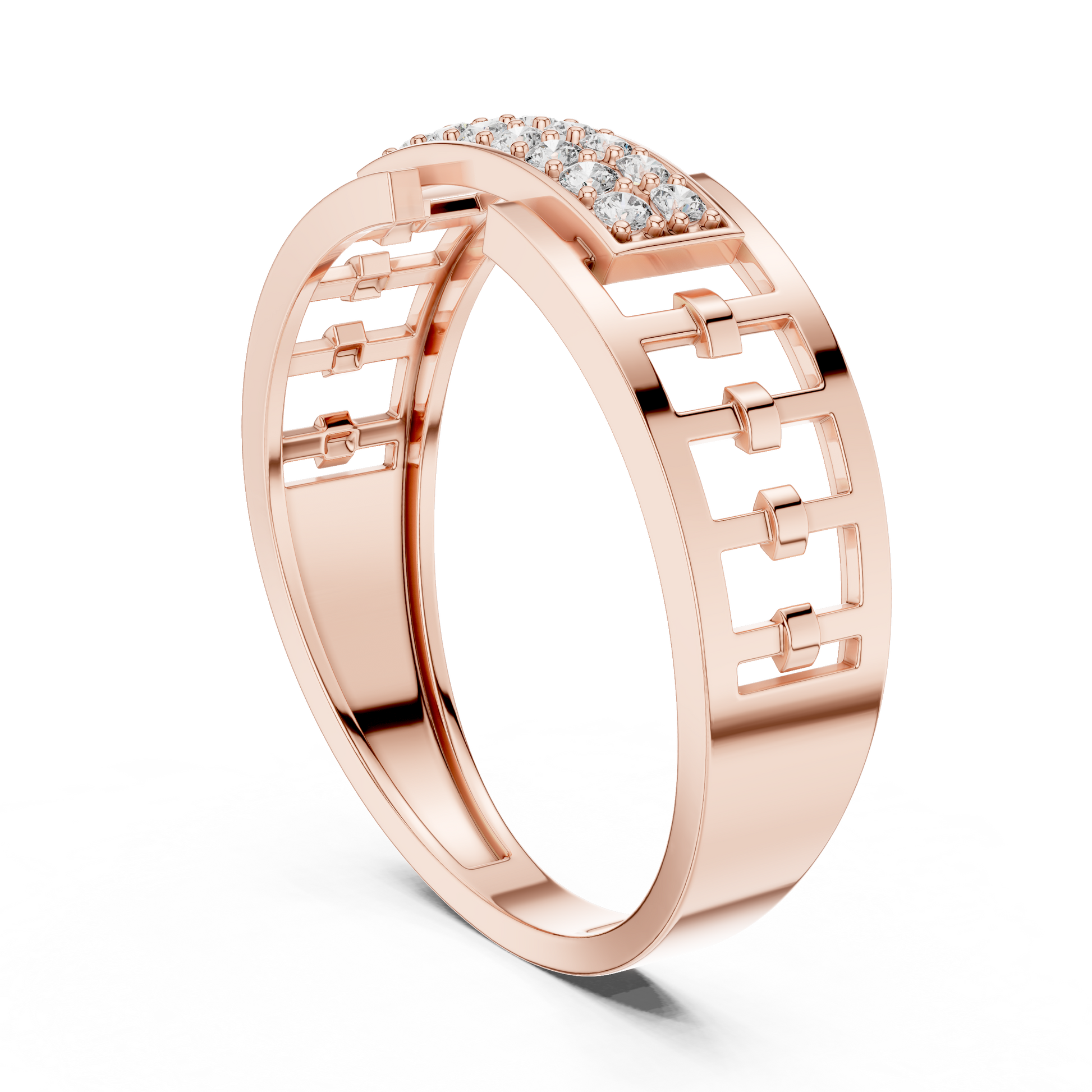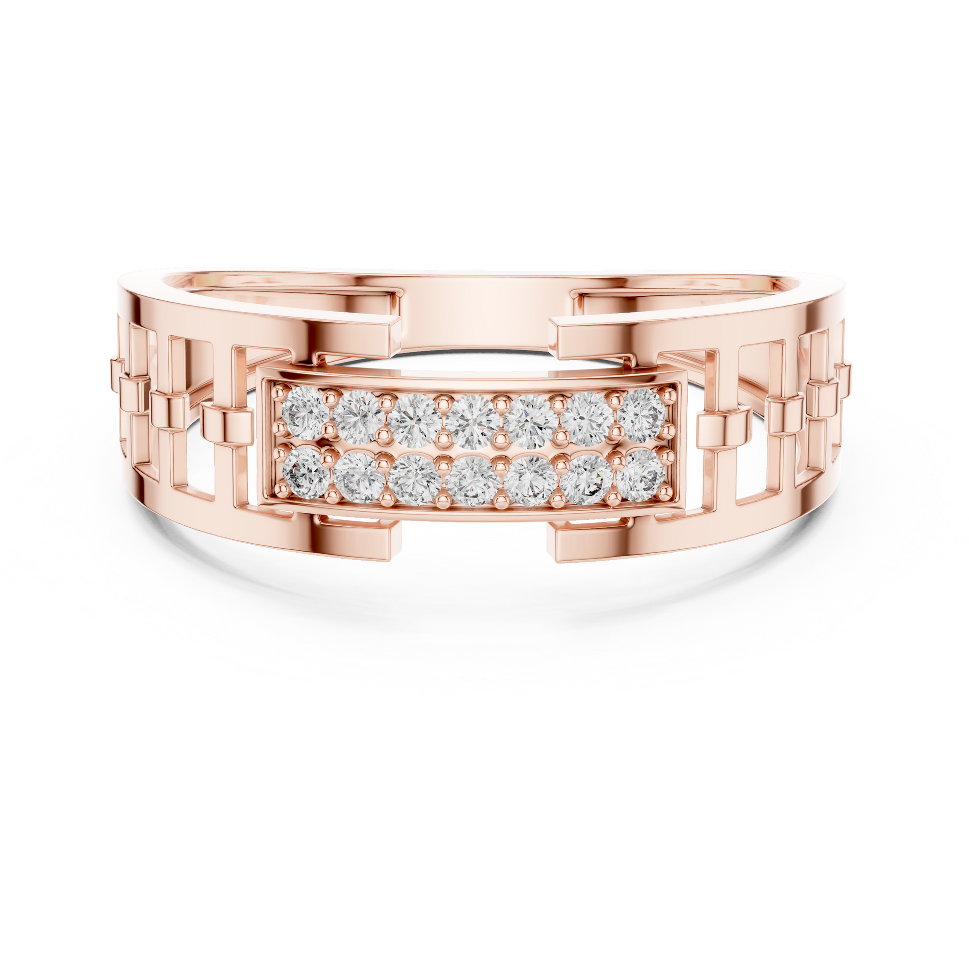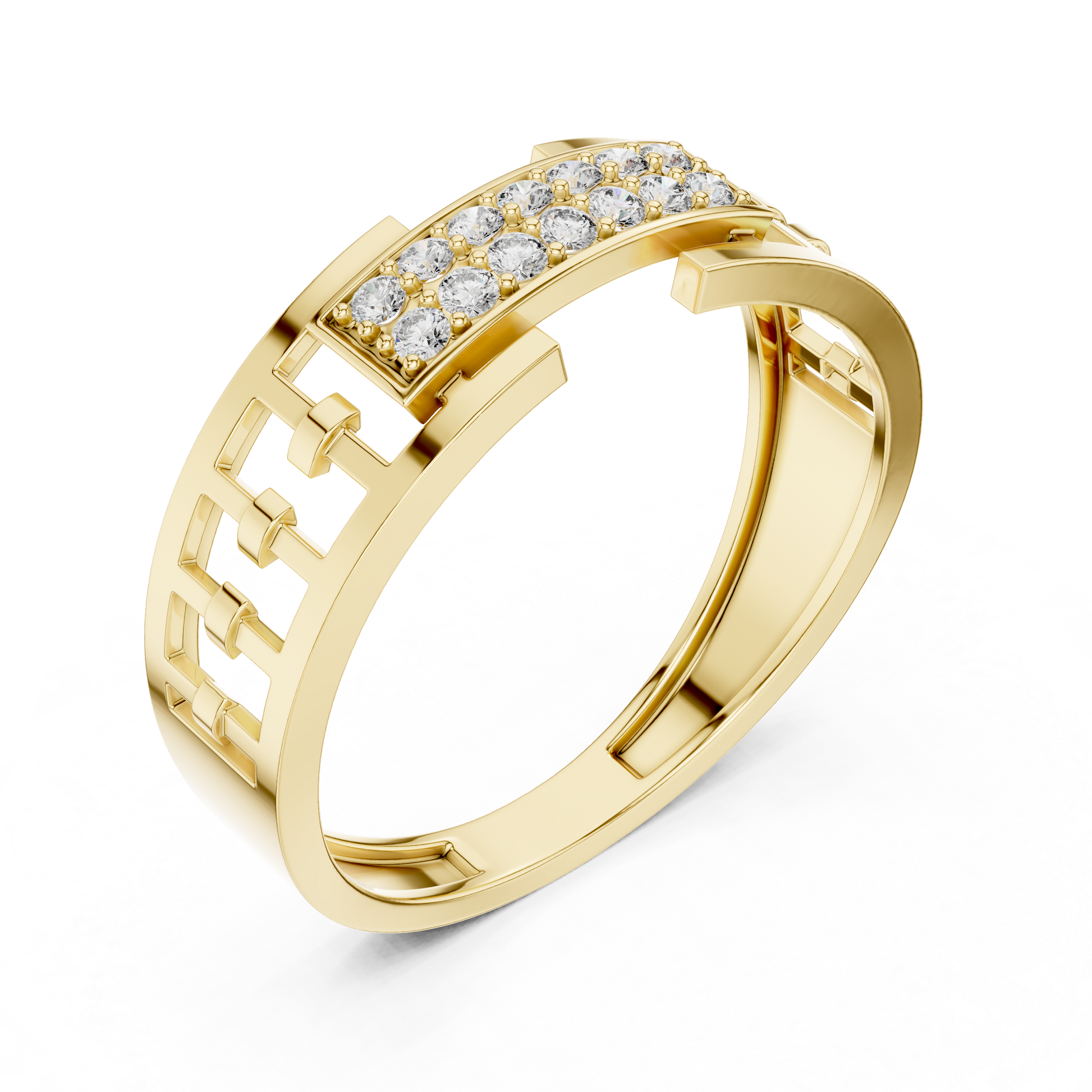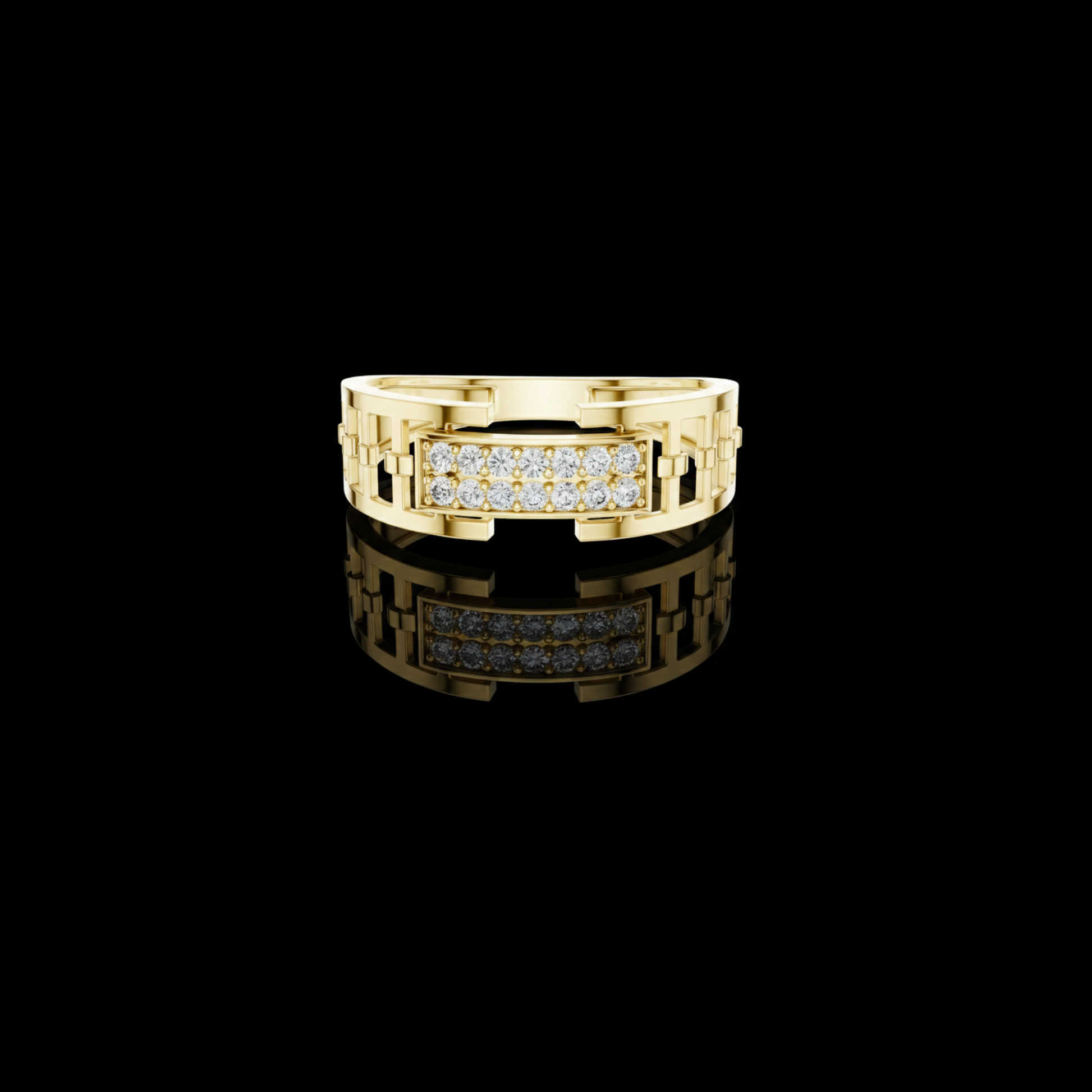 Crafted with precision and elegance, this stunning ring by Ivevar Luxury showcases a bold geometric link design in radiant gold, highlighted by a brilliant pave-set diamond centerpiece. The openwork band structure adds a modern architectural feel while maintaining a refined and luxurious presence. Designed to reflect light from every angle, the diamond panel delivers exceptional sparkle and sophistication.
