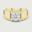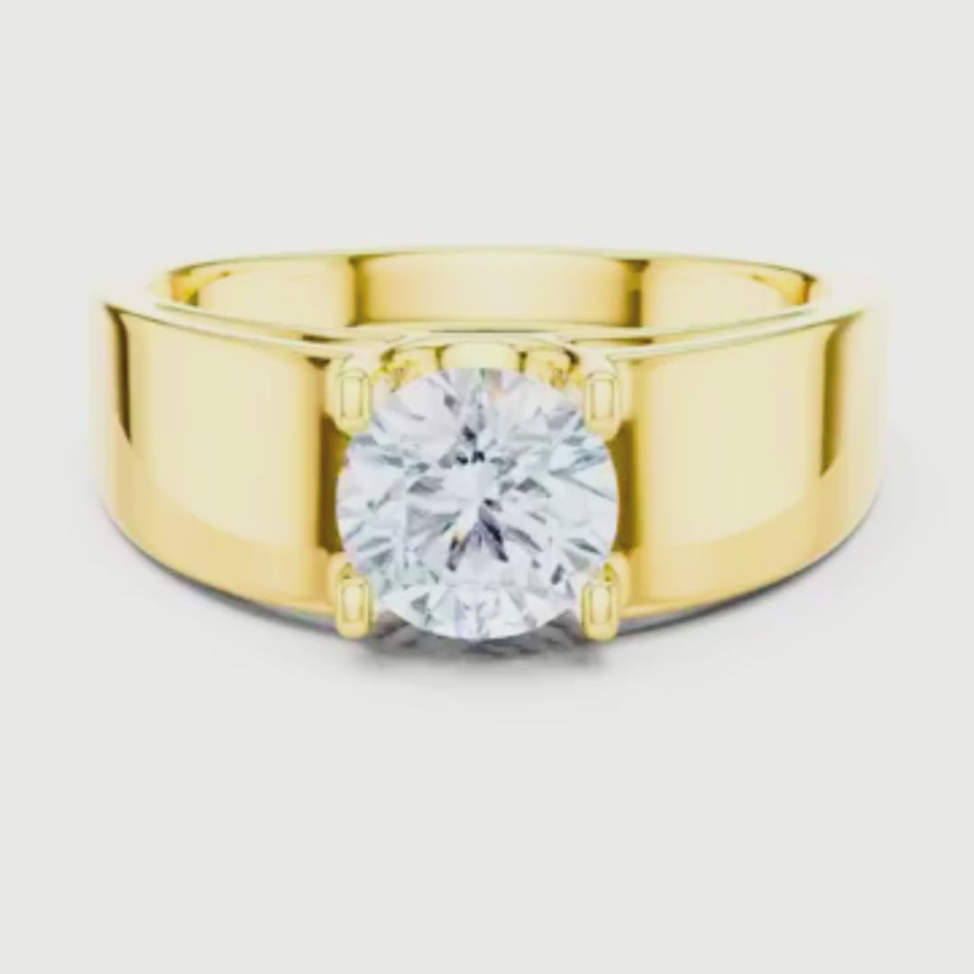 Celebrate moments that last forever with this exquisite solitaire ring, a symbol of refined luxury and enduring commitment. Crafted with a band, the design showcases a stunning round-cut diamond held securely in a classic prong setting, allowing maximum light, fire, and brilliance from every angle.The smooth, wide gold band offers a bold yet elegant presence, perfectly balancing modern sophistication with timeless charm.