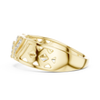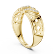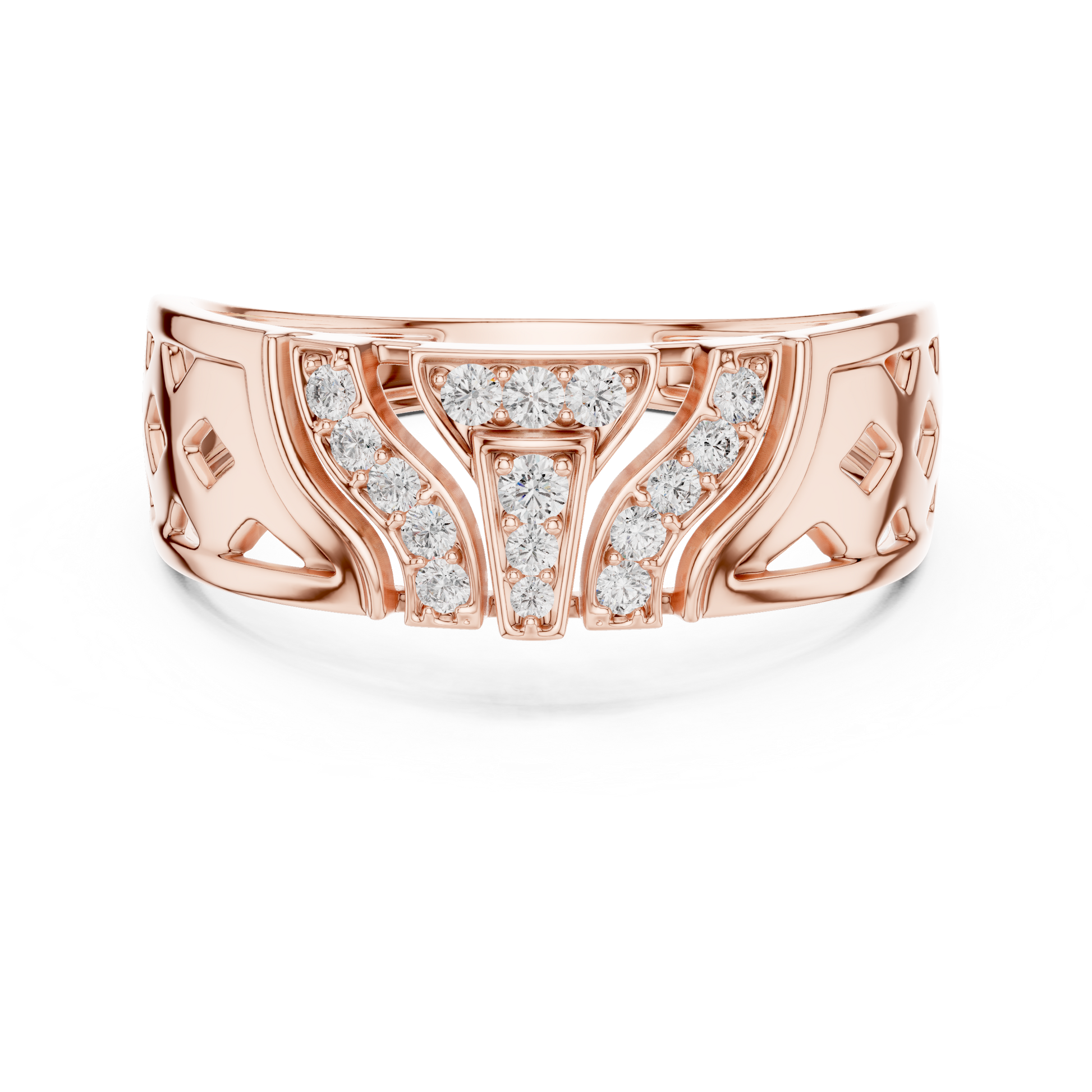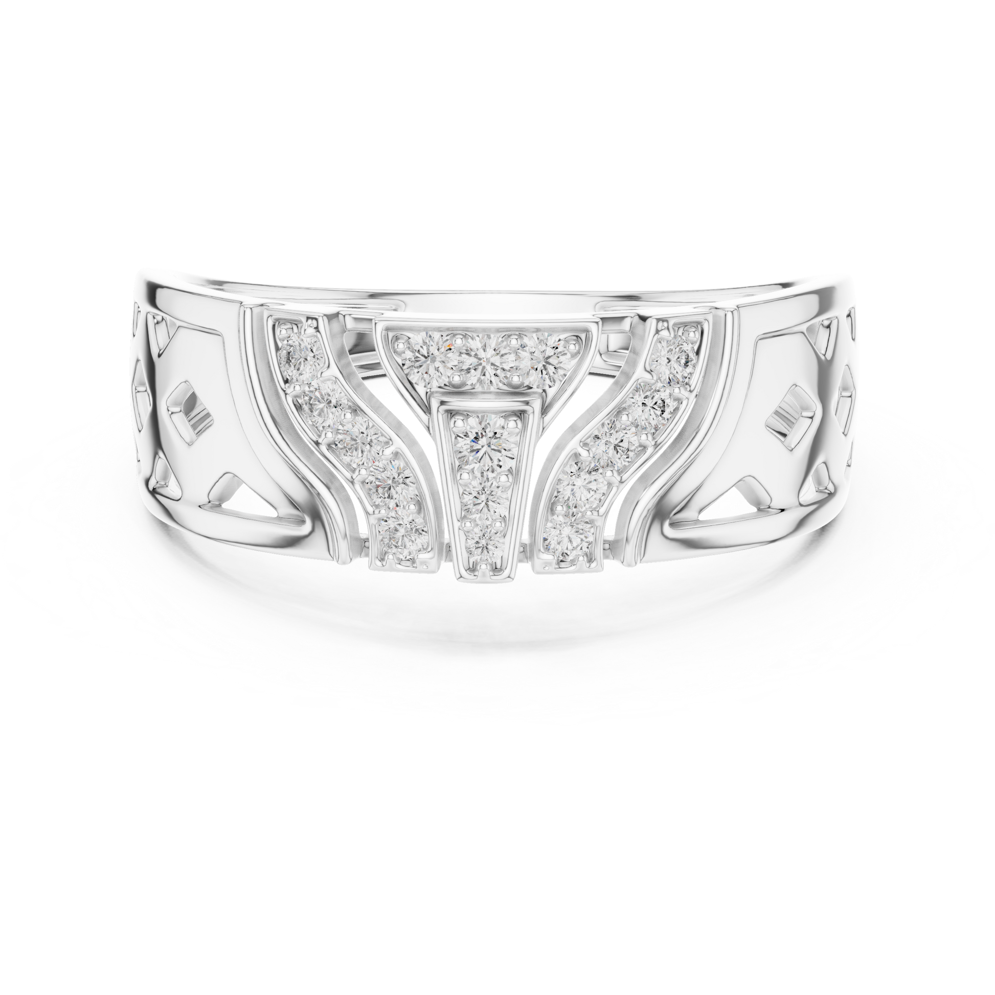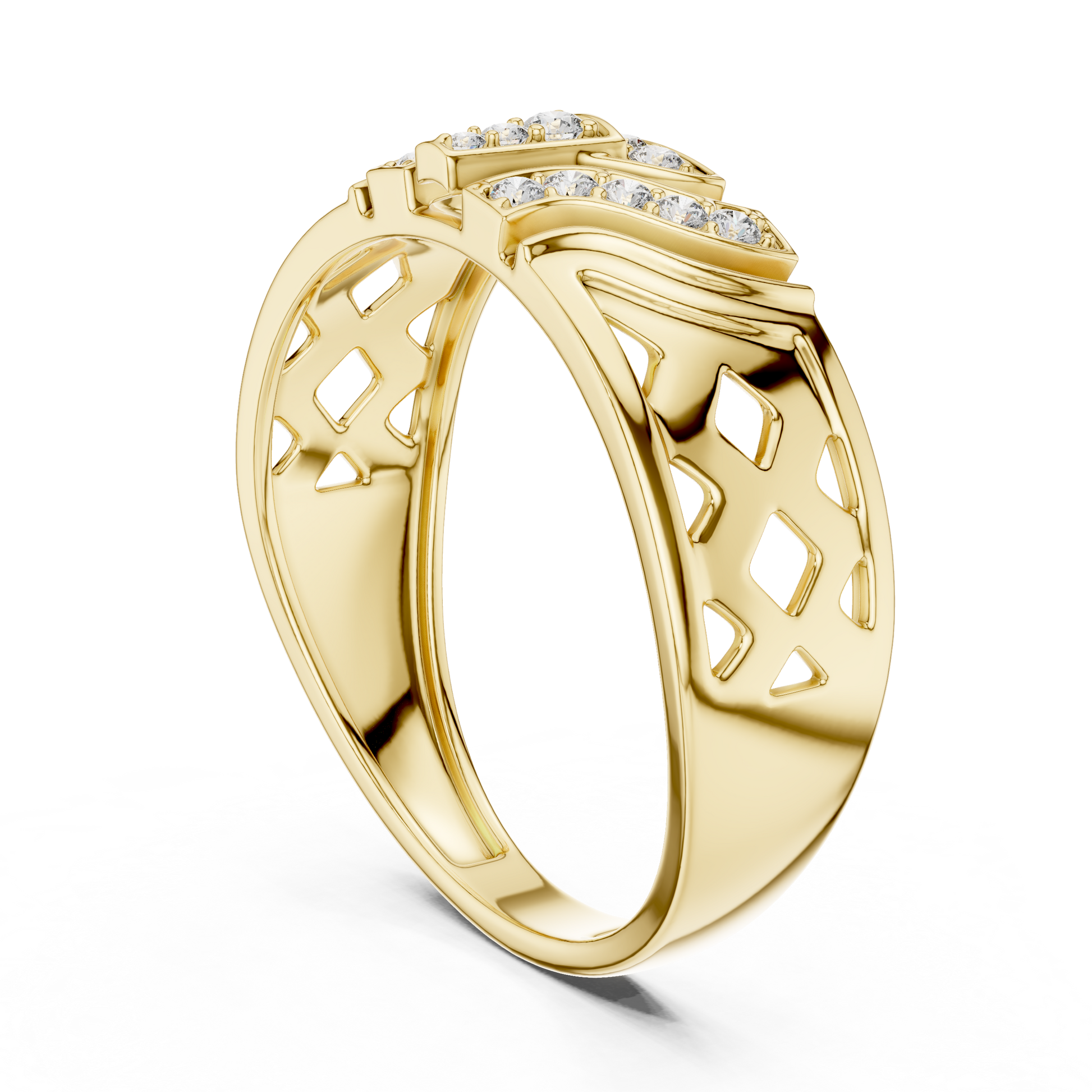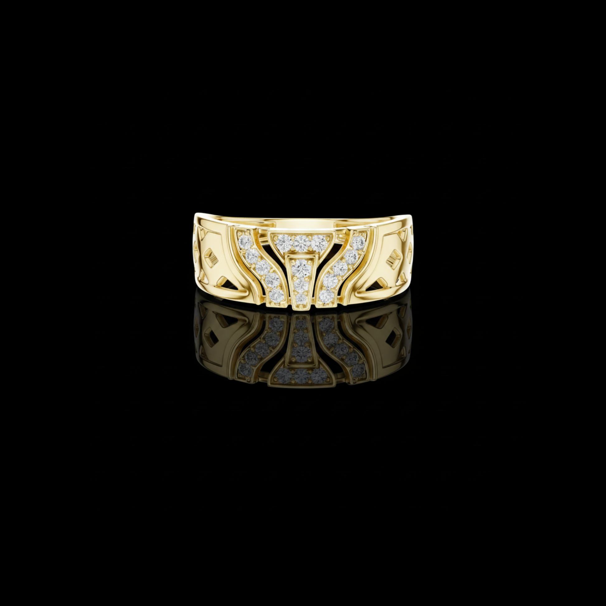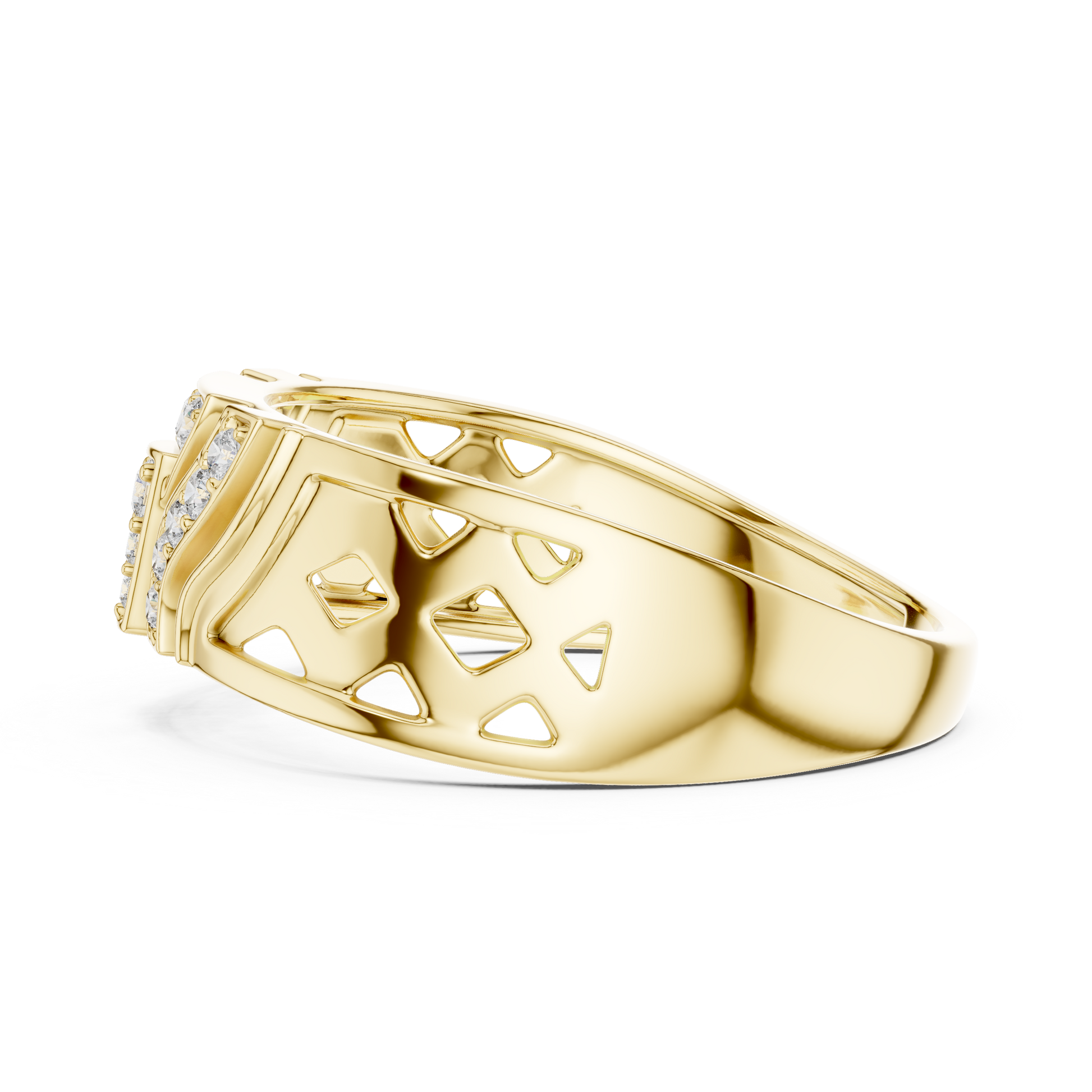 This exquisite gold diamond ring is crafted for those who appreciate elegance and architectural design. Featuring a striking geometric centerpiece adorned with brilliant-cut diamonds, this ring blends modern structure with timeless luxury. The polished gold band showcases intricate openwork cutouts along the sides, creating depth, comfort, and a distinctive visual appeal. Designed to reflect confidence and refinement, this statement ring is perfect for men who value premium craftsmanship, and lasting brilliance.