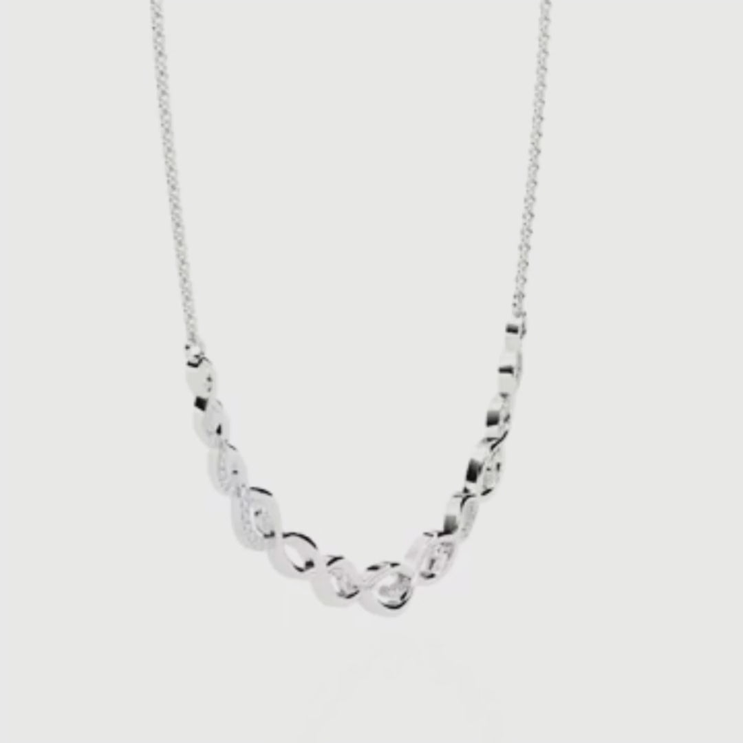 This elegant necklace features an intricate design of intertwined gold waves, gracefully accented with Sparkling Round Cut Stones that create a striking balance of luxury and sophistication. The flowing pattern symbolizes unity and eternity, while the high-polish finish enhances its radiant allure. Suspended on a delicate gold chain, this piece beautifully combines modern artistry with timeless elegance—perfect for elevating both formal and everyday looks.