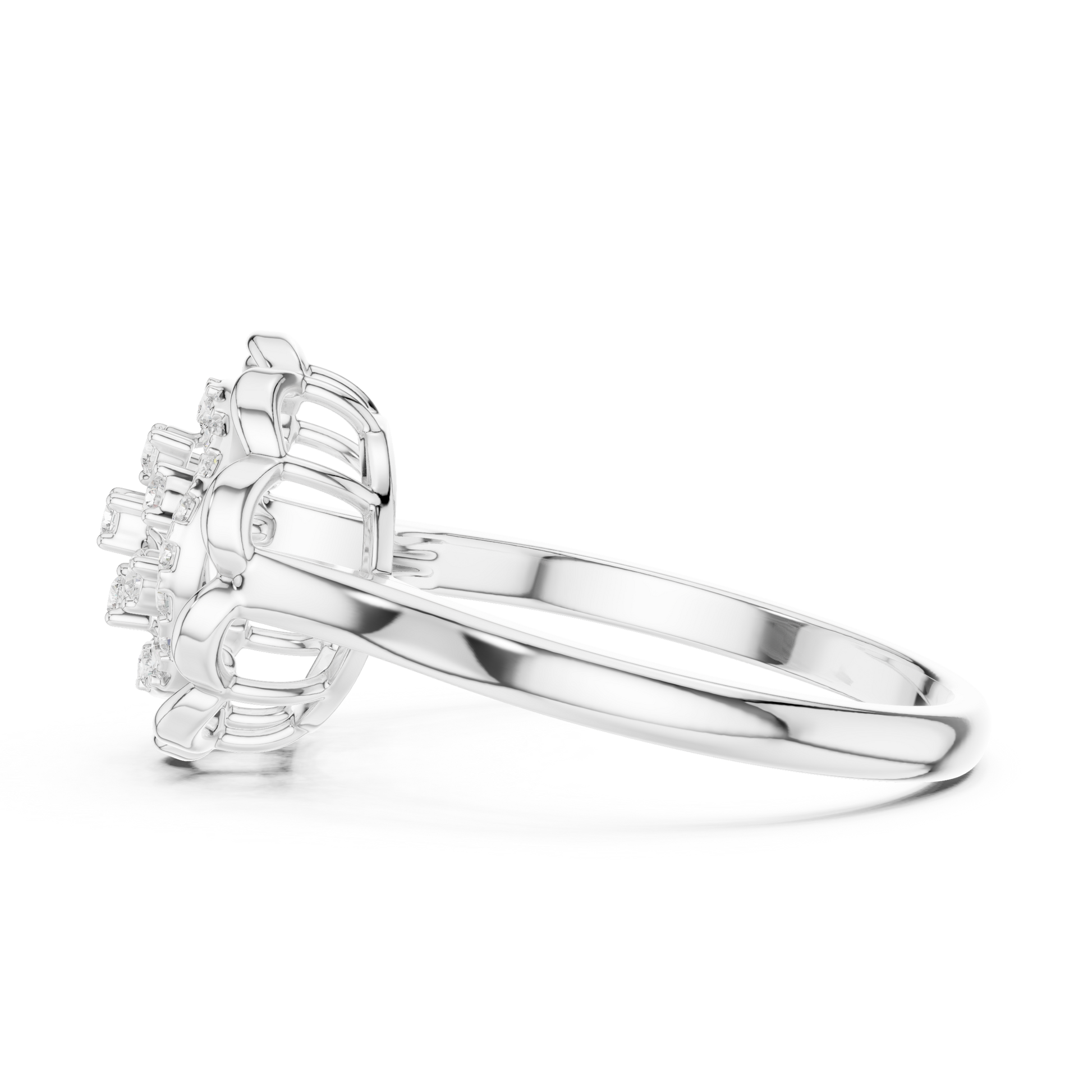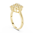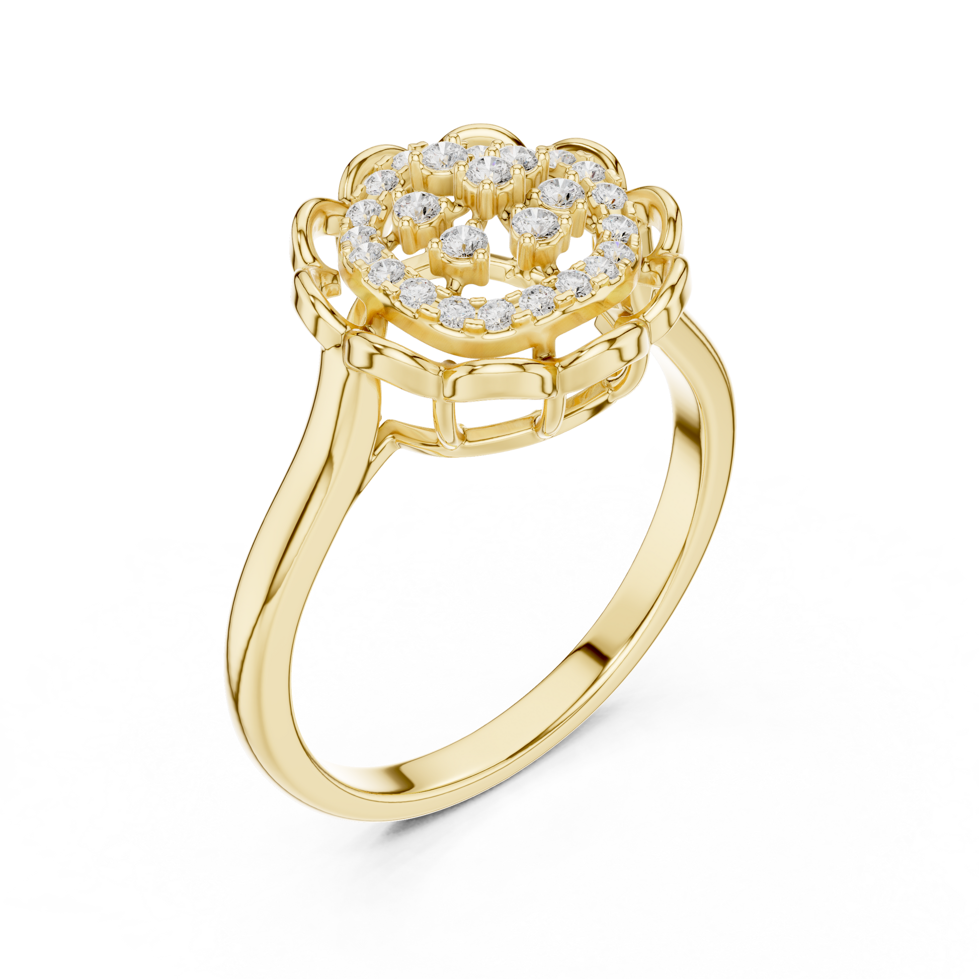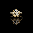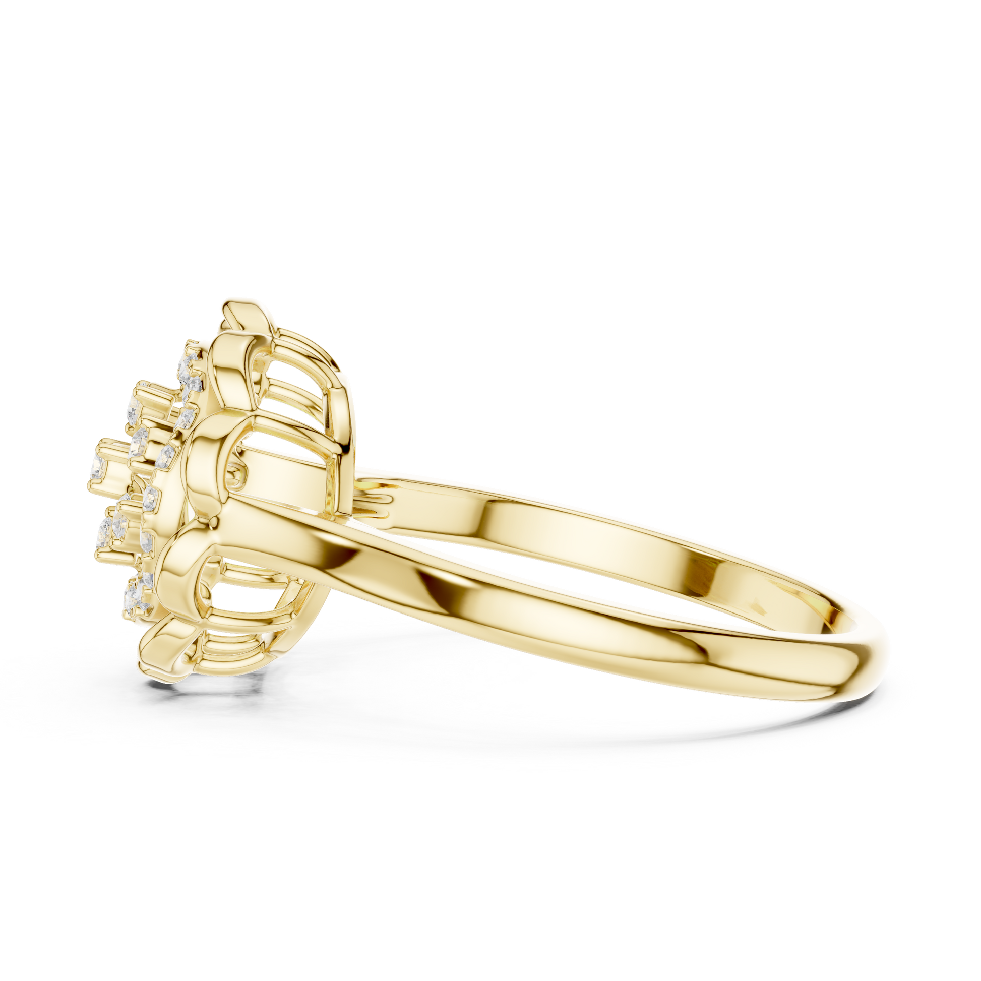 This stunning ring showcases a radiant floral medallion design, crafted with intricate petal-like detailing that surrounds a brilliant diamond cluster center. Each sparkling stone is meticulously set to create a harmonious blend of symmetry, elegance, and shimmering depth. The smooth gold band adds a warm, refined finish that elevates the piece’s overall charm.