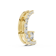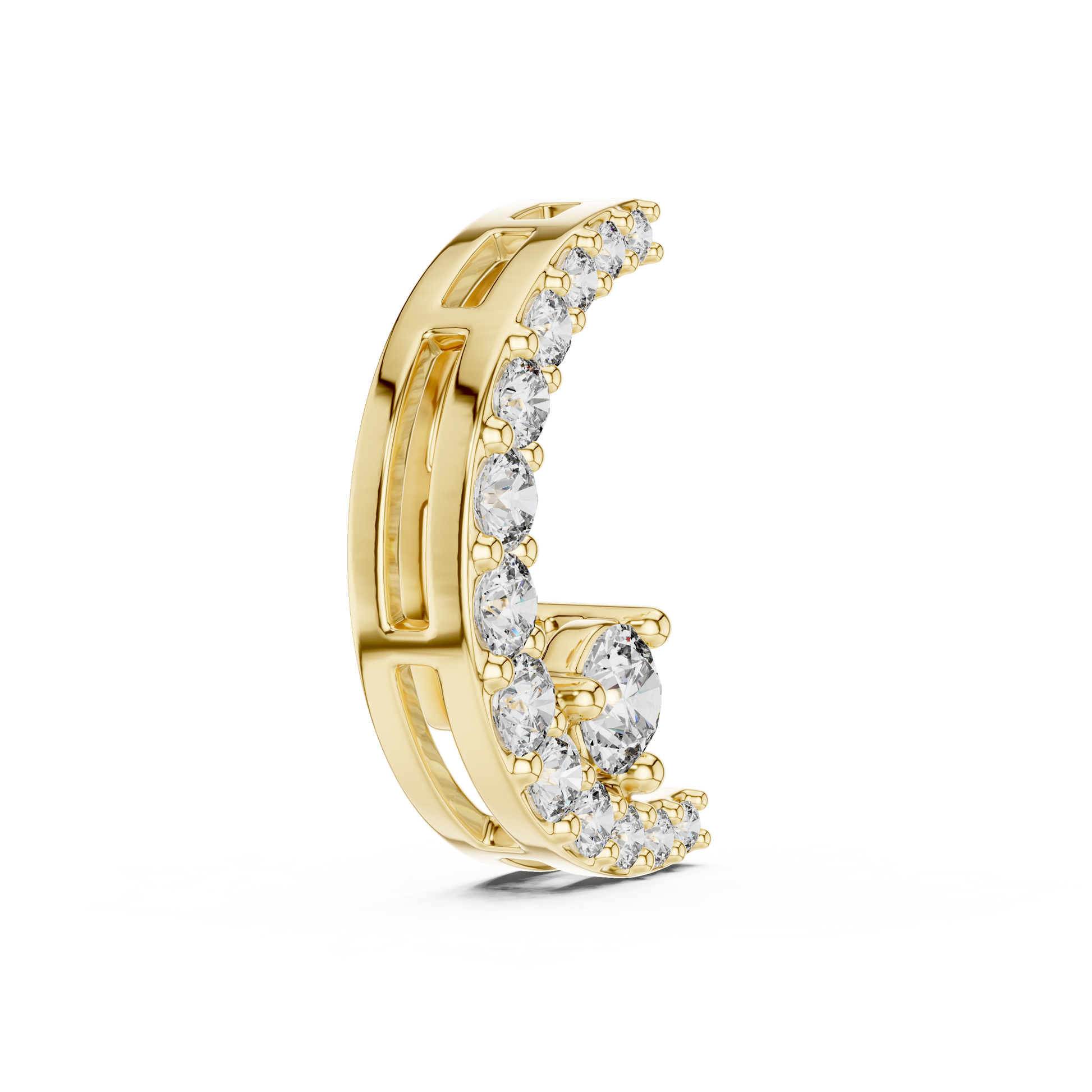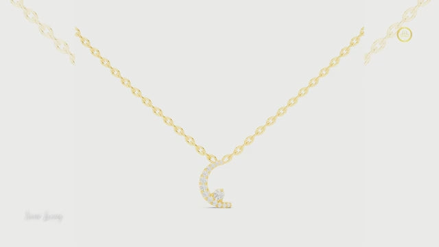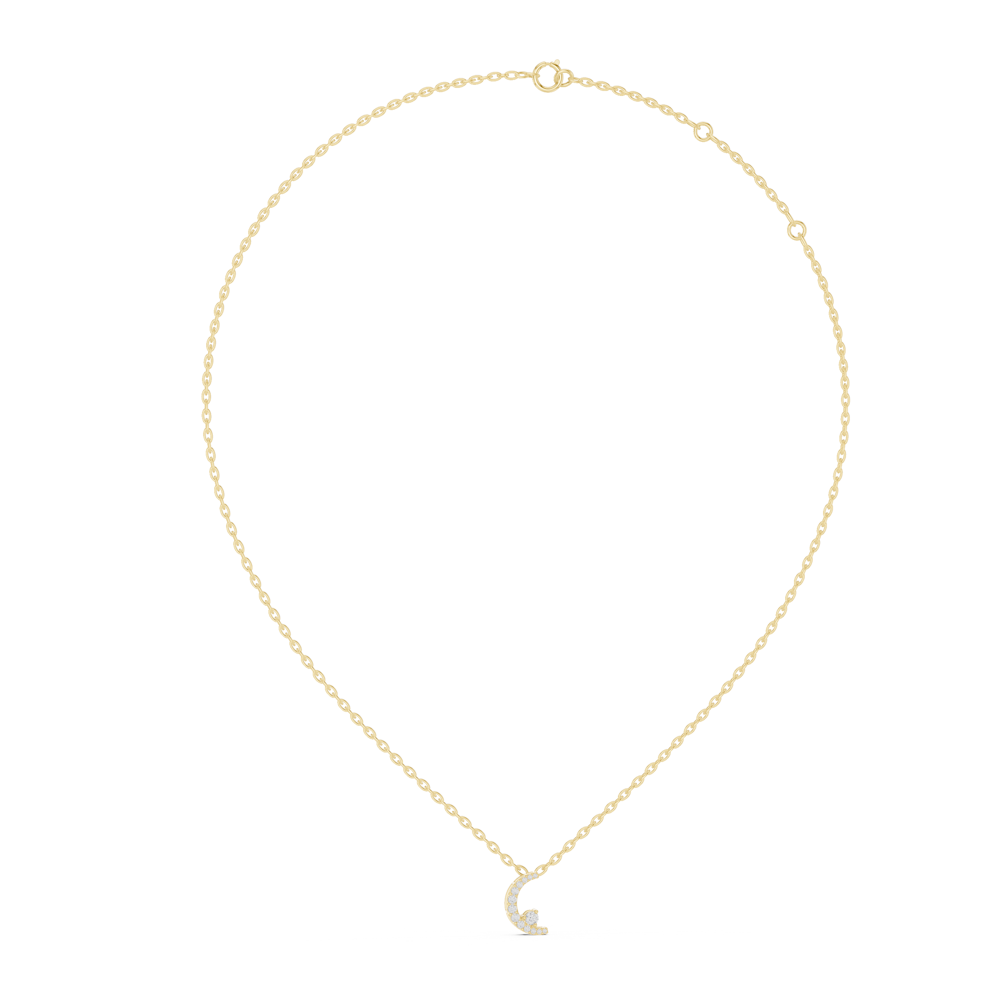 This graceful pendant is inspired by the beauty of a crescent moon, crafted in luminous gold and adorned with sparkling pave set round cut diamonds. A larger round diamond accent near the base adds depth and brilliance, enhancing the flowing curved silhouette. The celestial design blends modern elegance with timeless symbolism, making this pendant a meaningful and stylish piece for everyday wear or special moments. Perfect for those who love refined sparkle with a touch of cosmic charm.