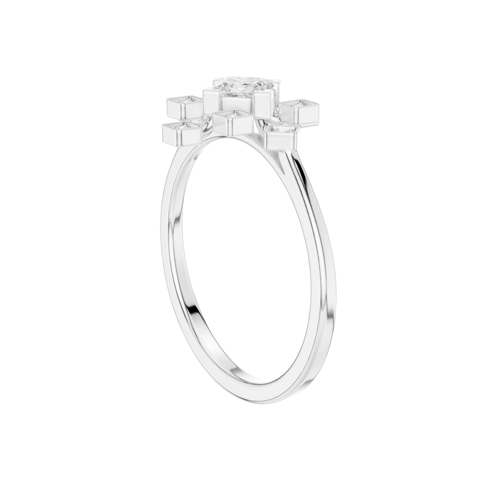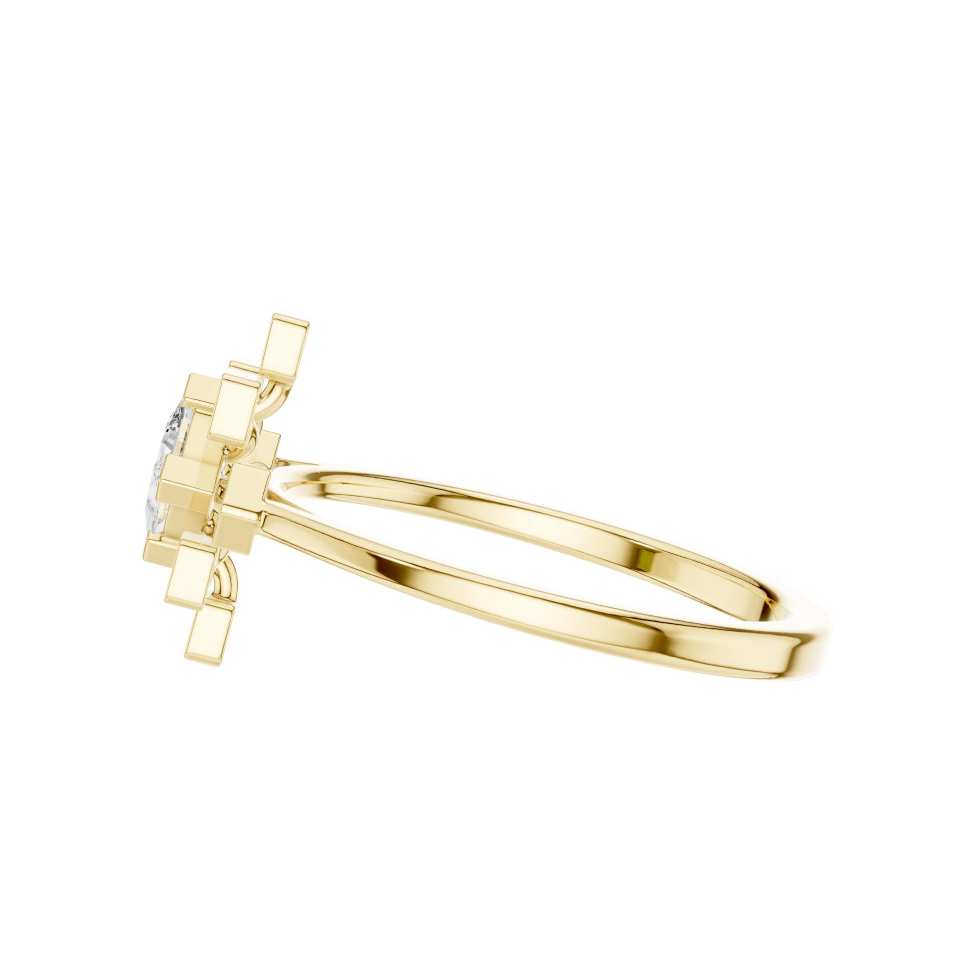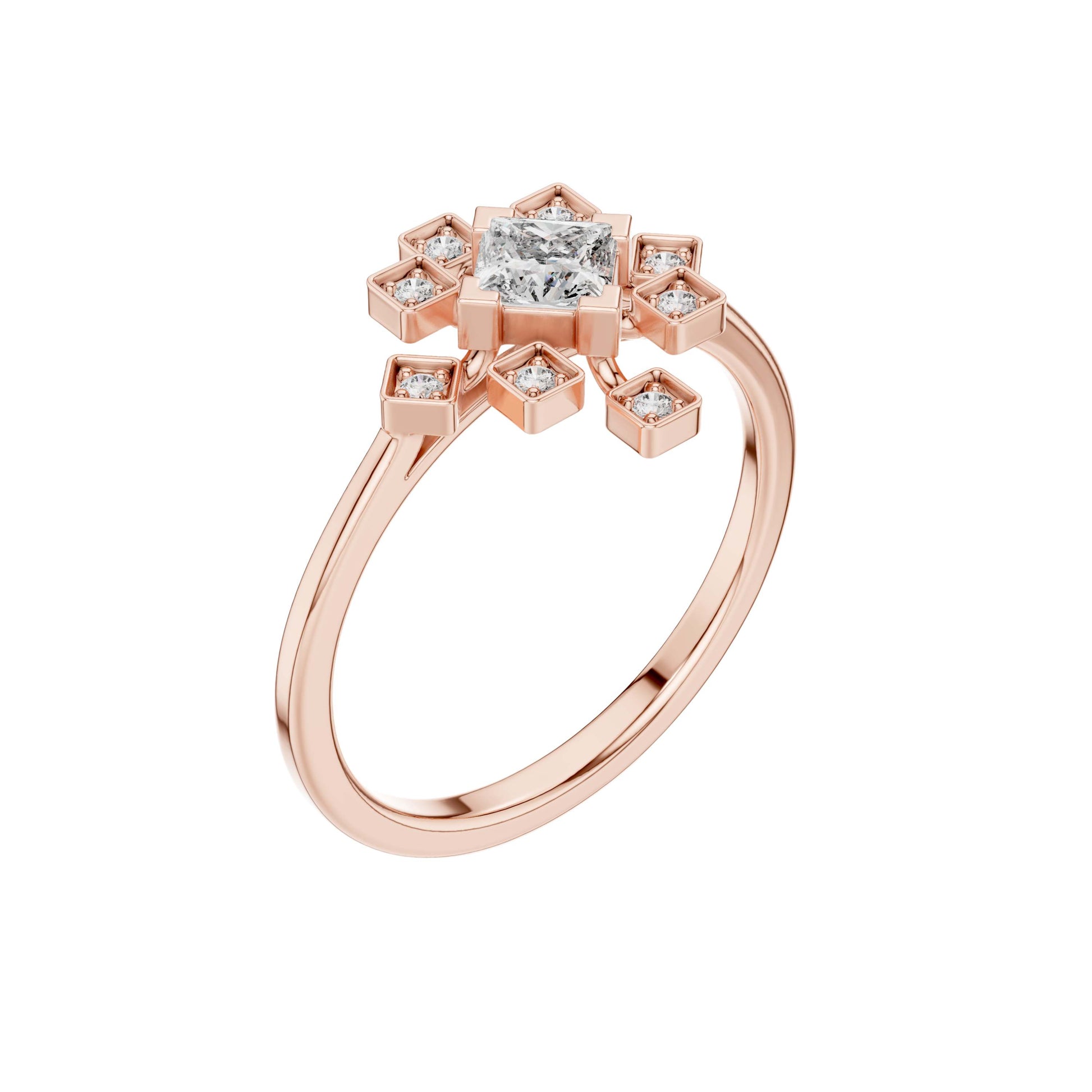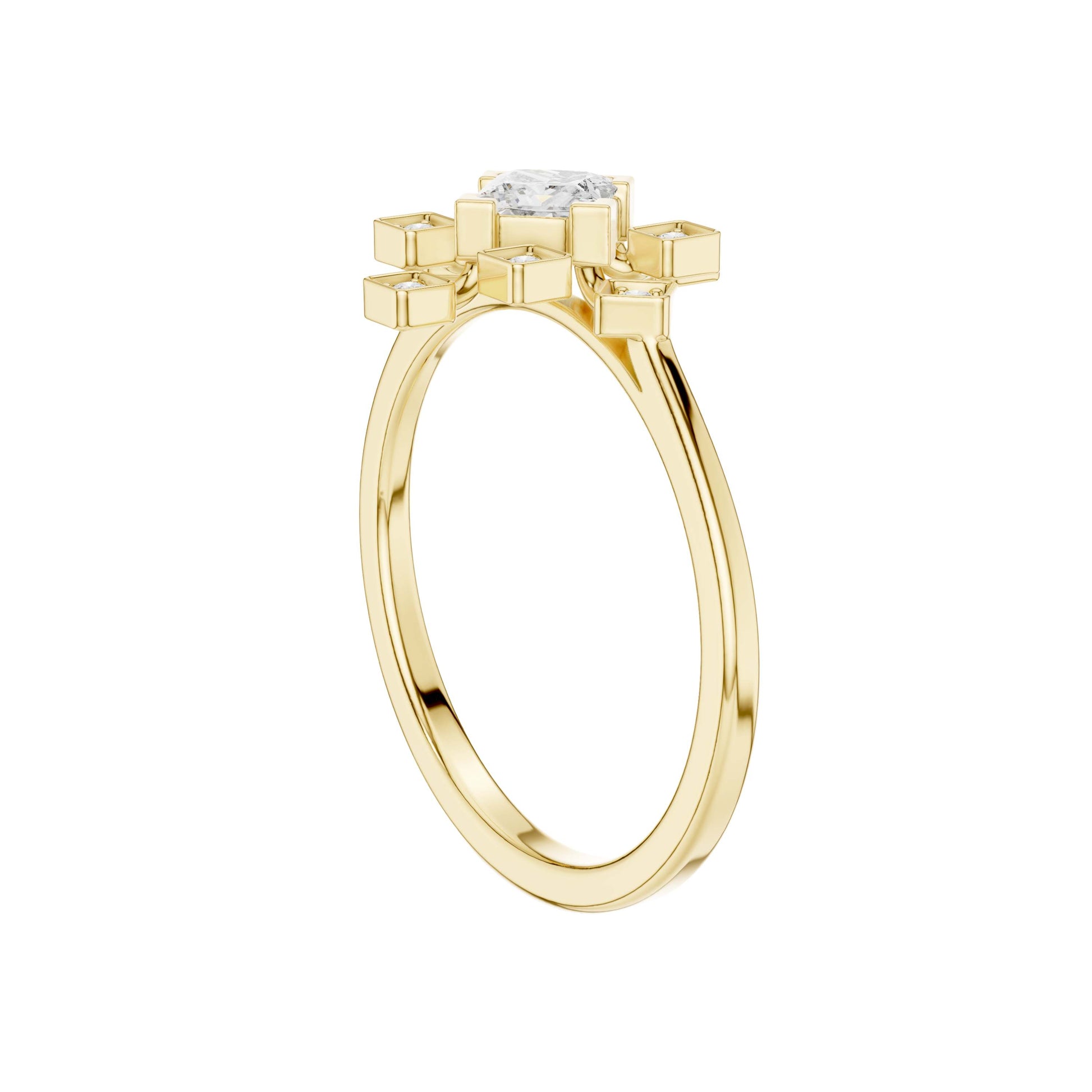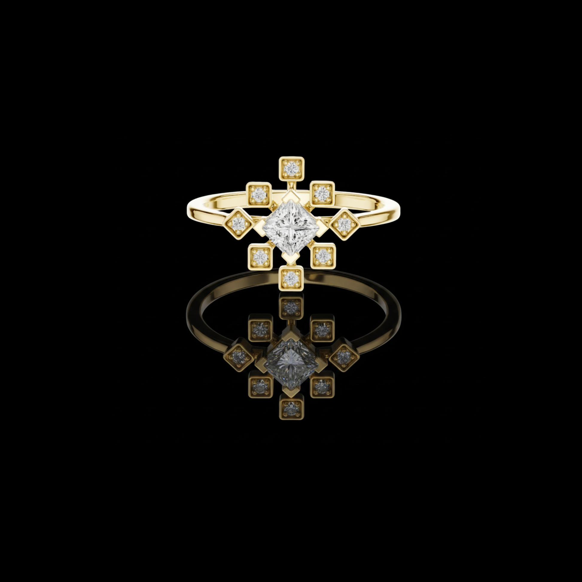 This elegant gold ring showcases a striking princess-cut center diamond framed by a radiant starburst of bezel-set accent diamonds, creating a perfect balance of modern geometry and timeless luxury. The polished gold band provides a warm, refined backdrop, while the symmetrical square motifs add depth, brilliance, and architectural charm. Designed to sparkle from every angle, this ring is a captivating statement piece—ideal for an engagement, anniversary, or a meaningful celebration of love and individuality.