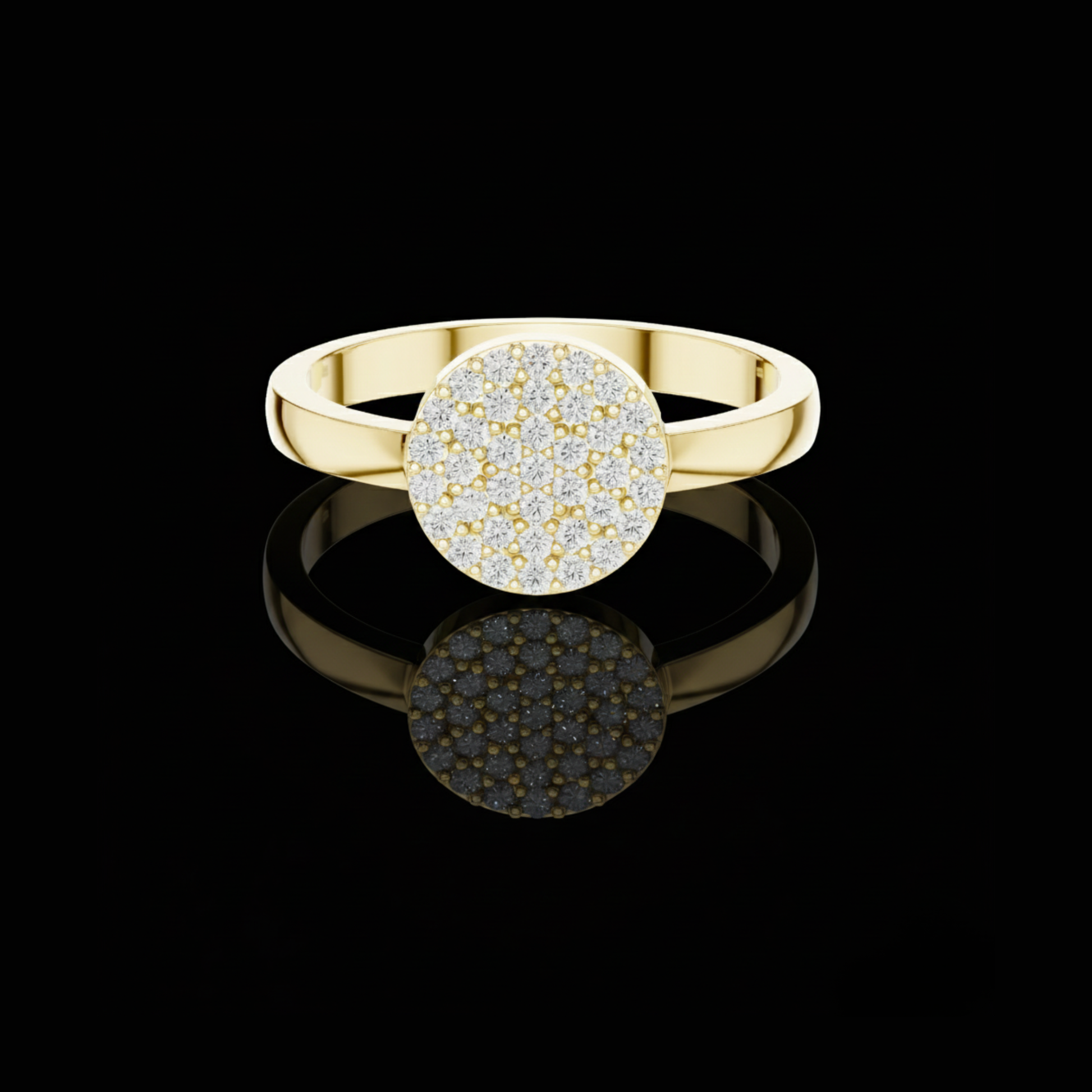 Introducing this stunning creation from Ivevar Luxury, a ring designed to capture elegance through pure simplicity. This masterpiece features a perfectly round diamond-cluster top, artistically arranged with brilliant pave-set stones that create a seamless, radiant sparkle. The ring is crafted in luxurious polished gold, giving it a smooth, modern, and timeless appeal. With its sleek band, refined structure, and full pave shimmer, this piece is ideal for gifting, celebrations, or adding everyday sophistication to any jewelry collection.