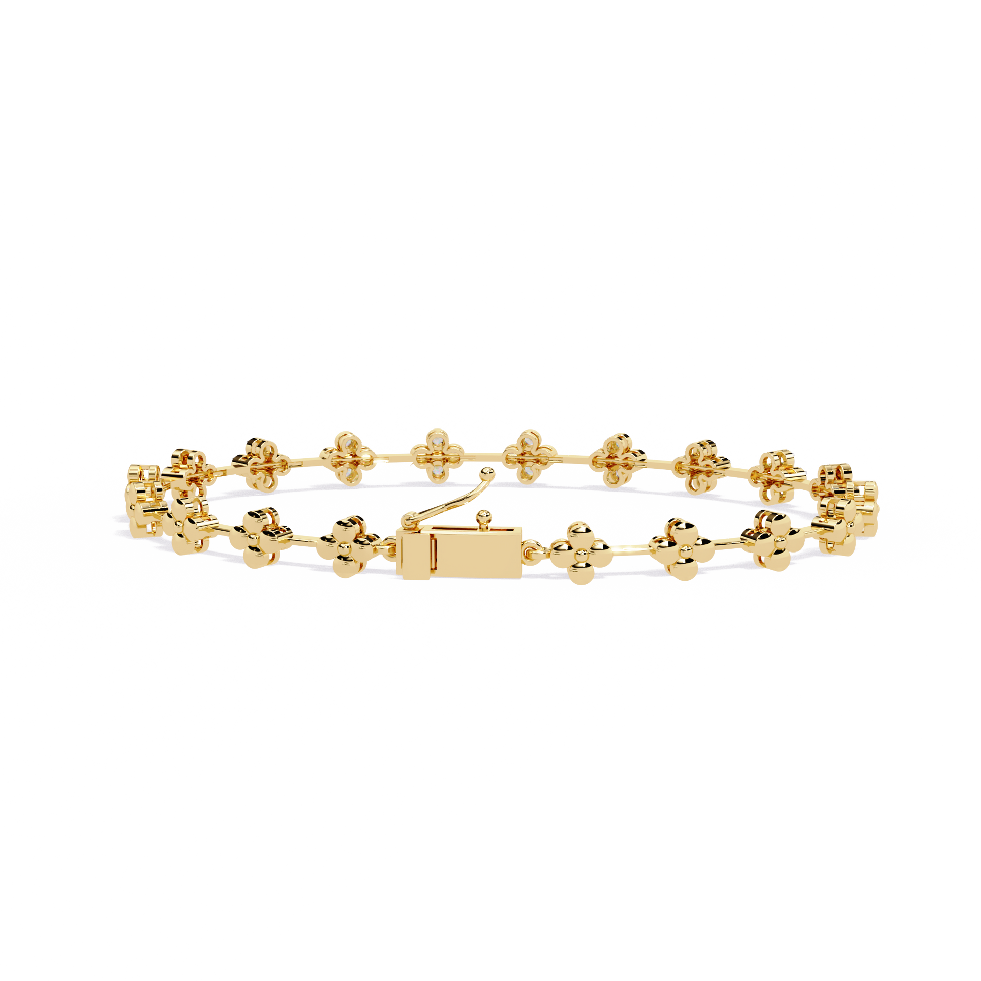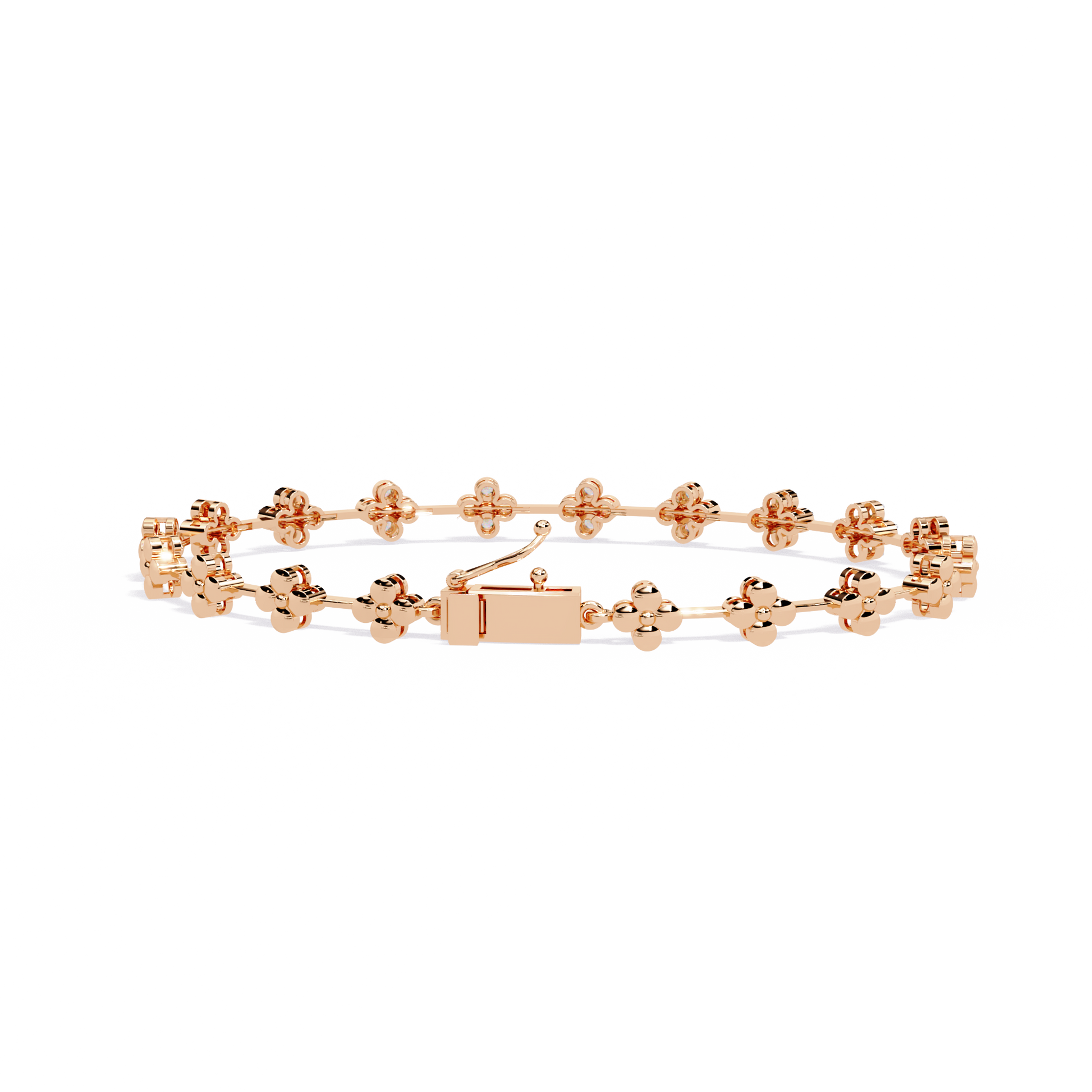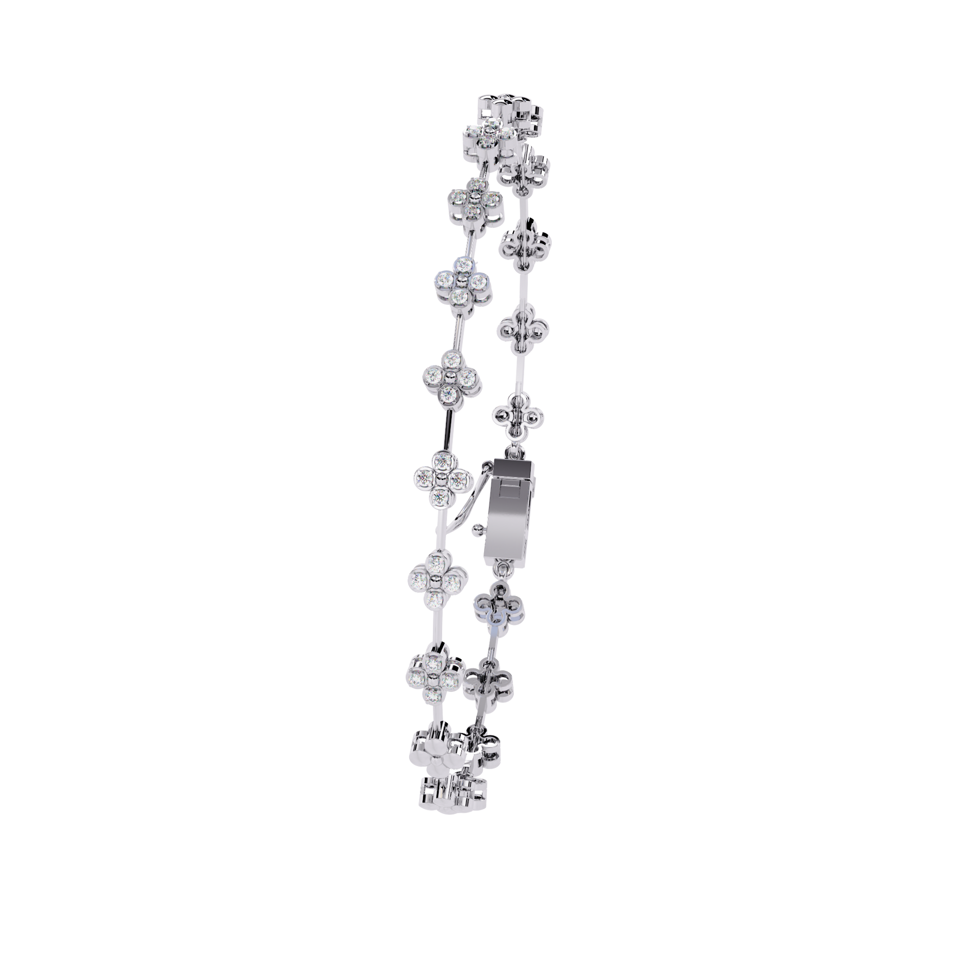 This luxurious bracelet is crafted from and showcases a series of delicate floral motifs adorned with brilliant-cut diamonds. Each flower-shaped link sparkles with precision, creating a harmonious blend of elegance and sophistication. The bracelet features a secure box clasp with a safety latch, ensuring both comfort and confidence in wear. Perfect for special occasions or as a statement of refined taste, this piece exemplifies timeless beauty and exceptional craftsmanship.