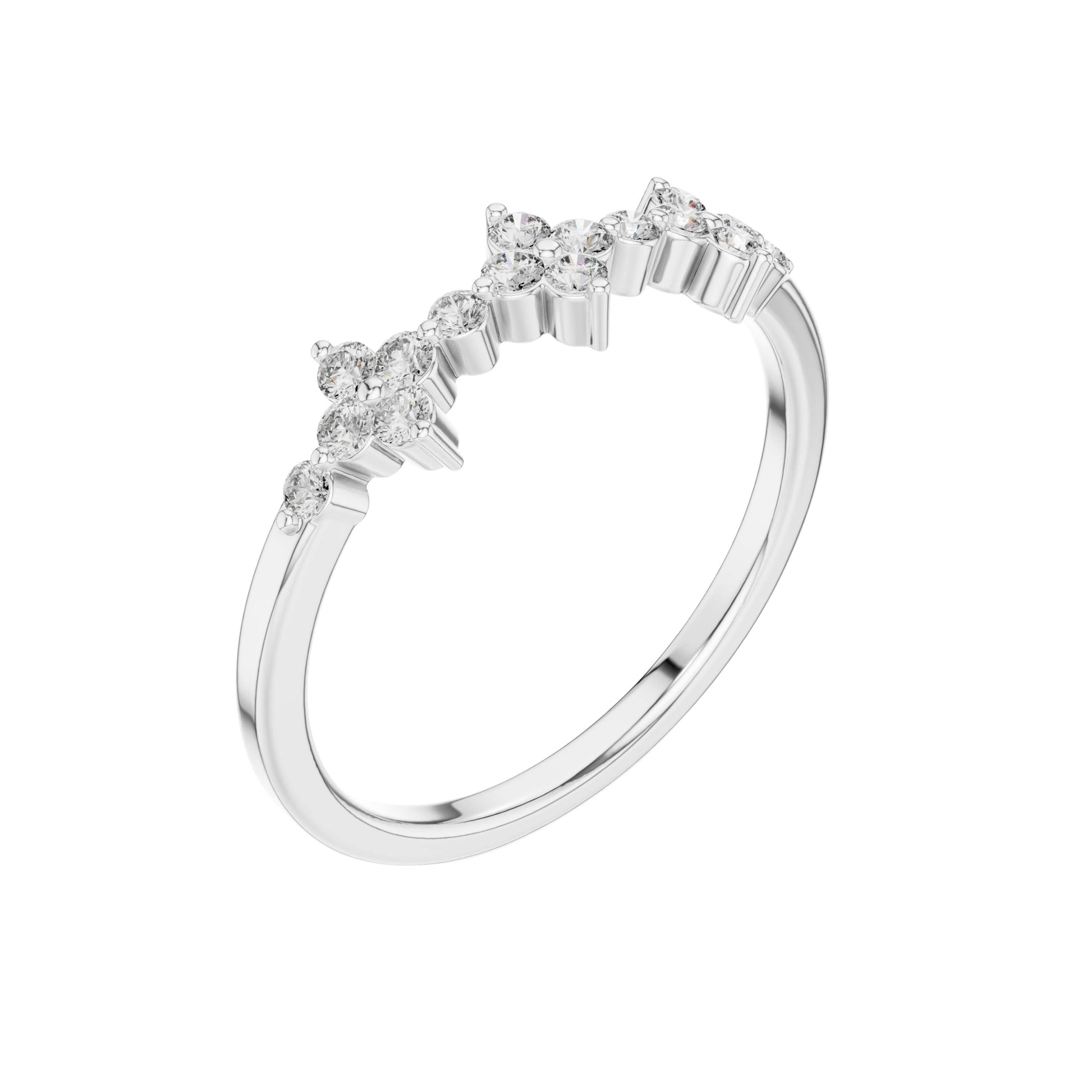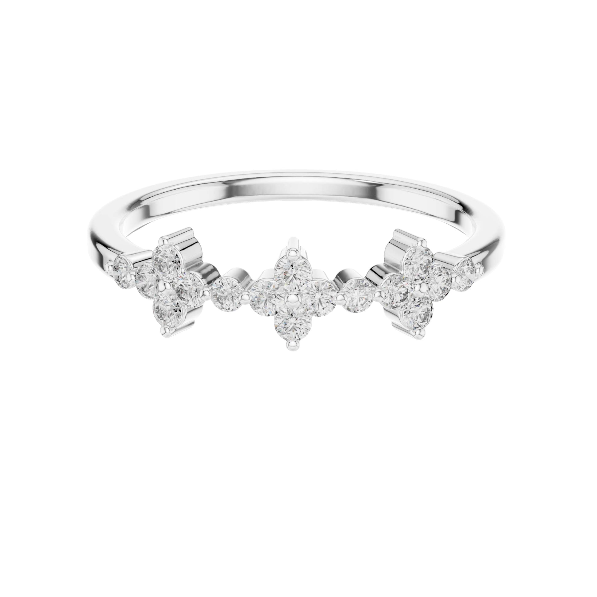 This charming gold diamond band features a delicate floral-inspired design, with clusters of round brilliant diamonds arranged in graceful motifs across the top of the ring. The polished gold band provides a warm, luminous backdrop, while the intricate prong settings enhance sparkle and dimension from every angle. Elegant yet whimsical, this ring is perfect as a stacking band, wedding band alternative, or everyday statement piece that blends vintage romance with modern craftsmanship.