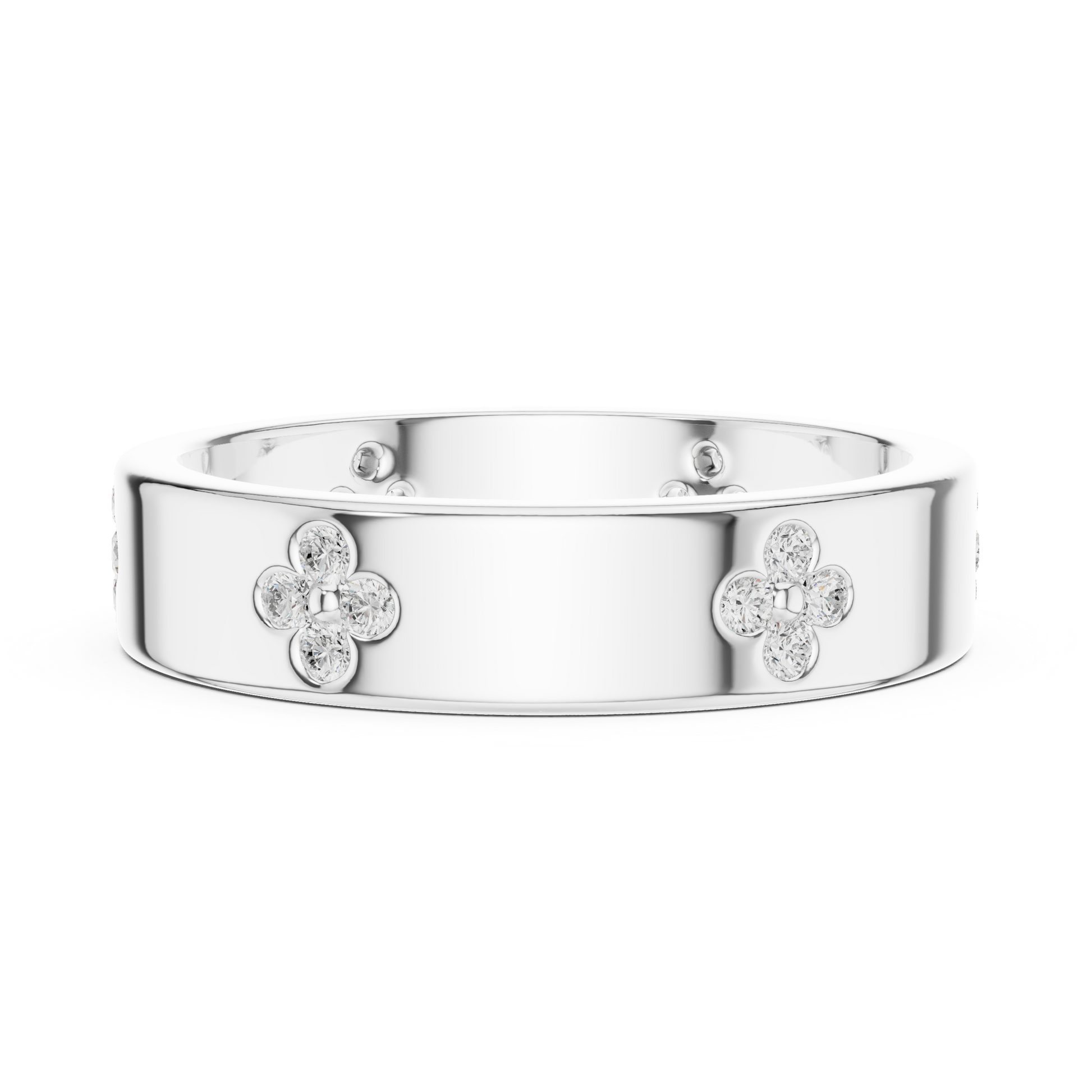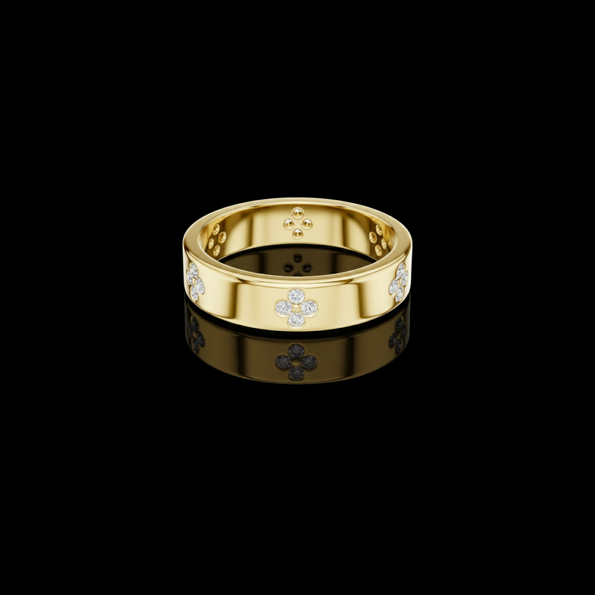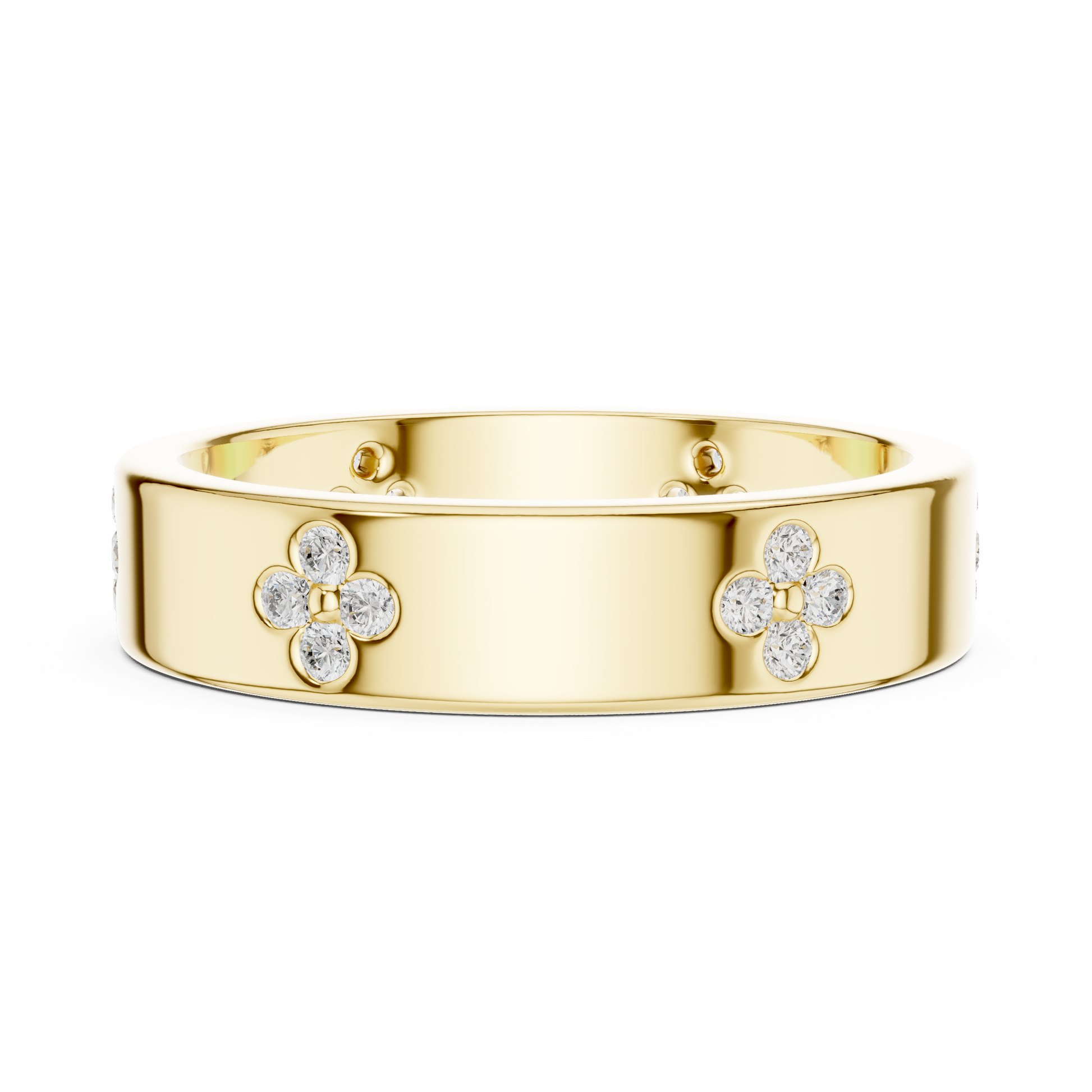 this exquisite ring from IVEVAR LUXURY showcases a polished gold band adorned with delicate floral diamond clusters that radiate refined brilliance. The smooth, wide-band design offers a bold yet graceful presence, enhanced by meticulously set round diamonds that catch the light from every angle. Designed for comfort and durability, the inner band features subtle detailing that reflects expert craftsmanship and long-lasting wear.