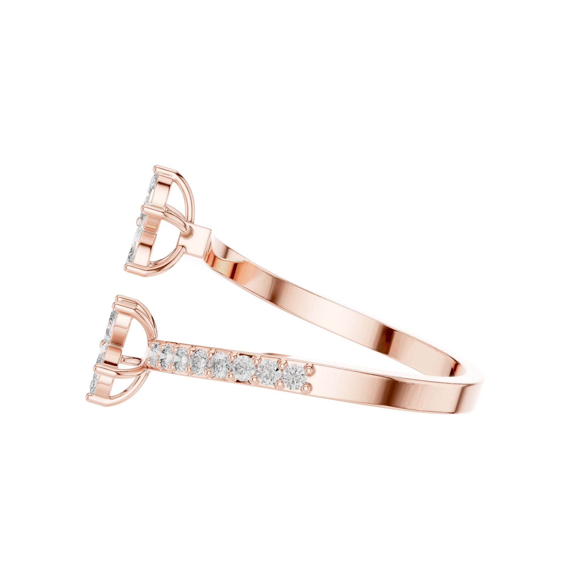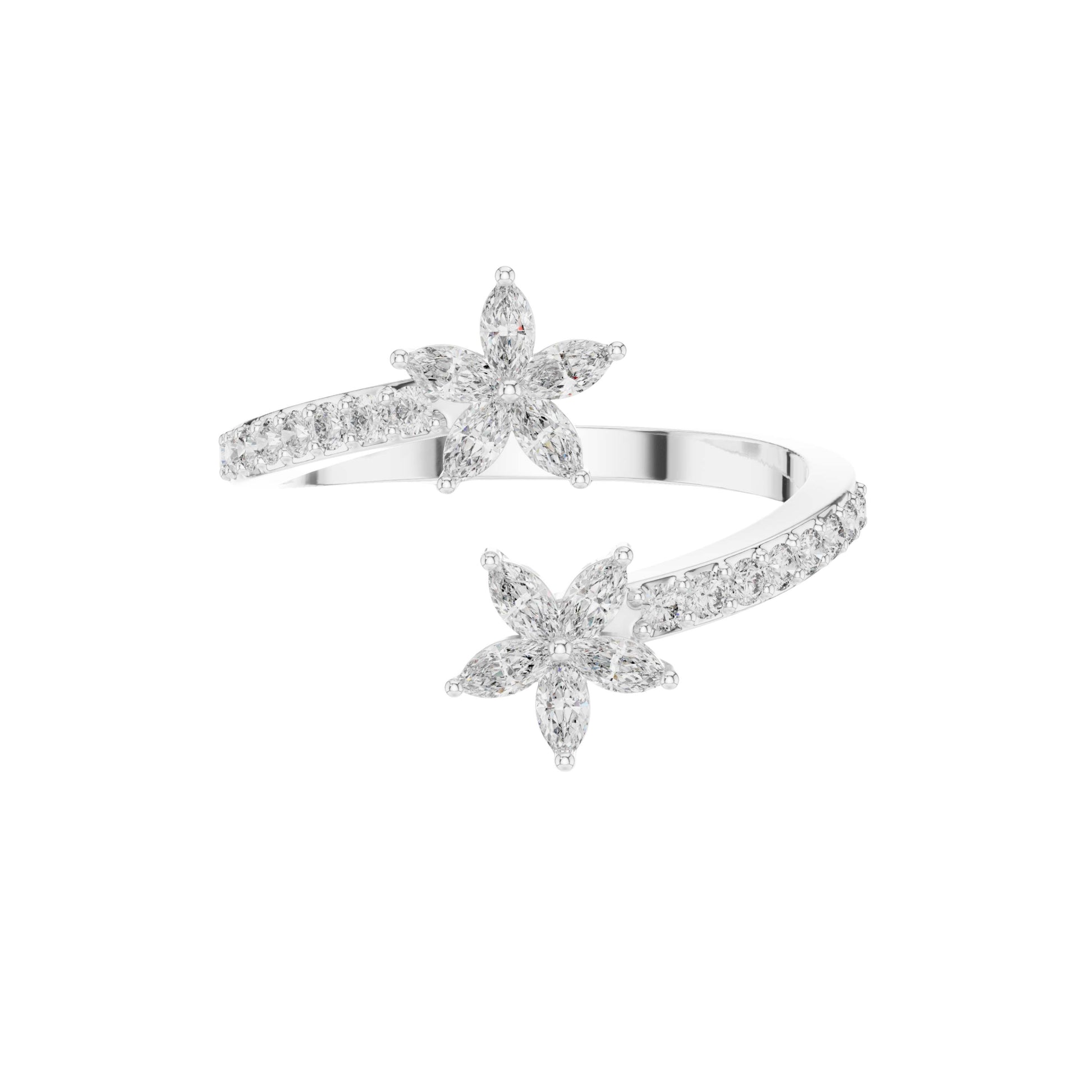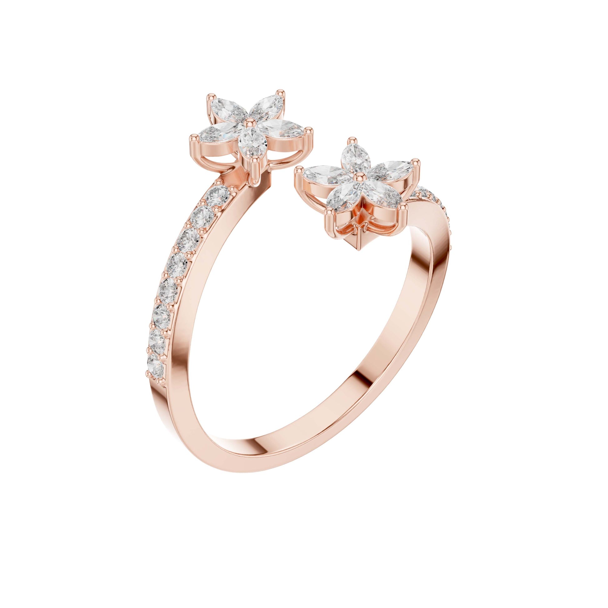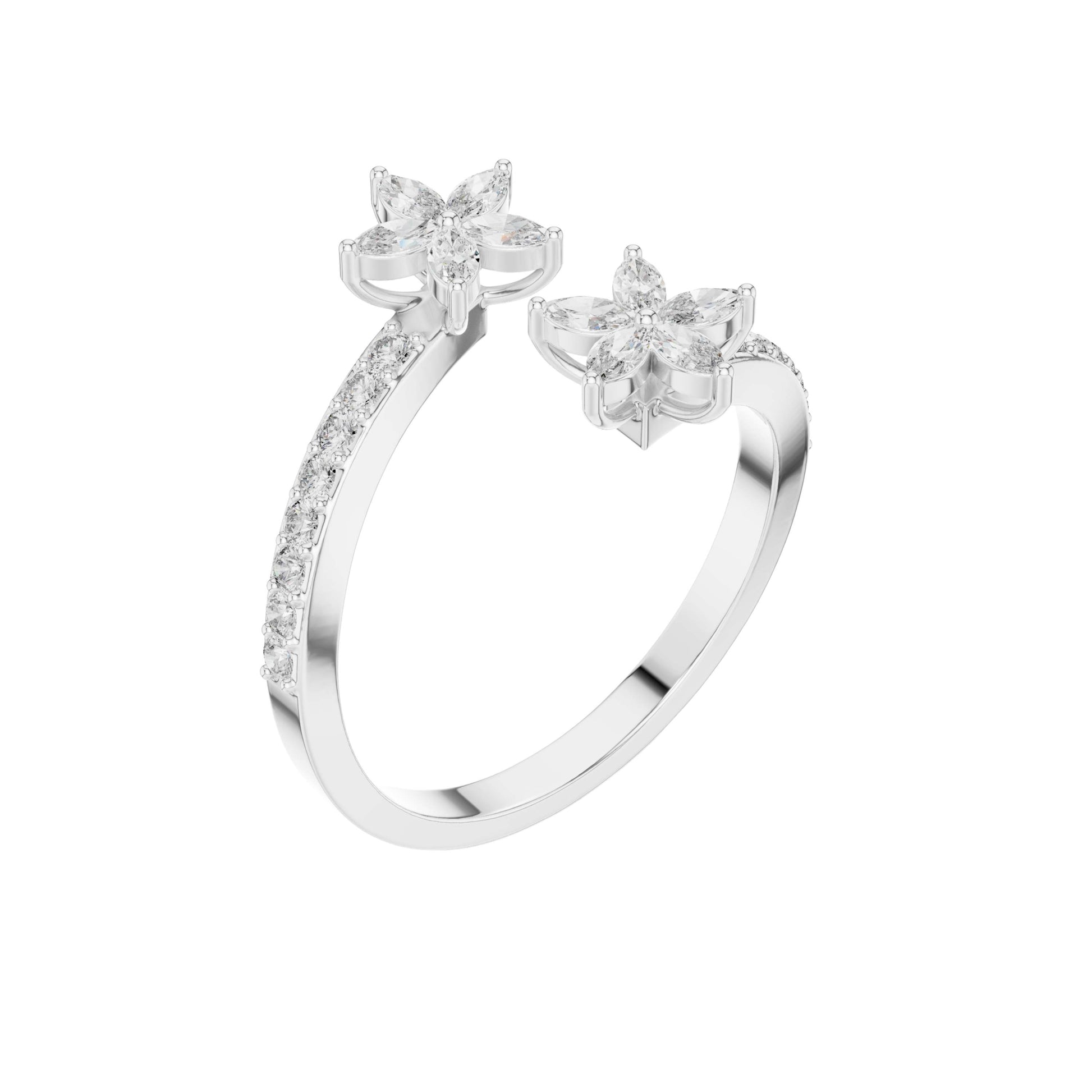 This elegant open ring is crafted in radiant gold and features two delicate floral motifs formed by sparkling marquise-cut diamonds, creating a graceful, nature-inspired design. Each flower is complemented by a slim pave-set diamond band that adds brilliance and refined detail from every angle. The open silhouette offers a modern, adjustable-style look while maintaining timeless sophistication, making this ring a beautiful statement piece for everyday elegance or a unique addition to a fine jewelry collection by Ivevar.