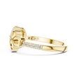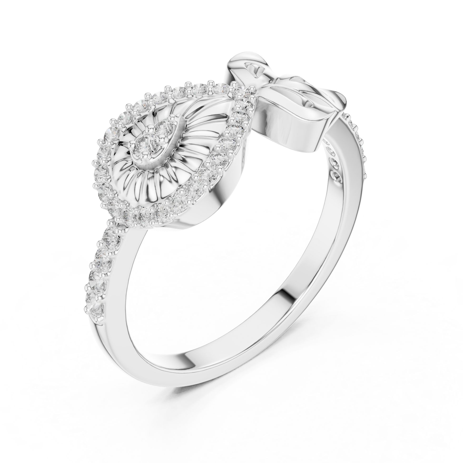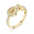 Discover the beauty of symbolism and craftsmanship with this captivating diamond ring, designed around a striking sculpted eye motif that represents protection, intuition, and inner strength. The eye is framed with brilliant pavé-set diamonds, creating a radiant halo that enhances its mesmerizing presence.Flowing gold contours extend gracefully into a fluid, ribbon-like band, adding movement and modern elegance to the design.