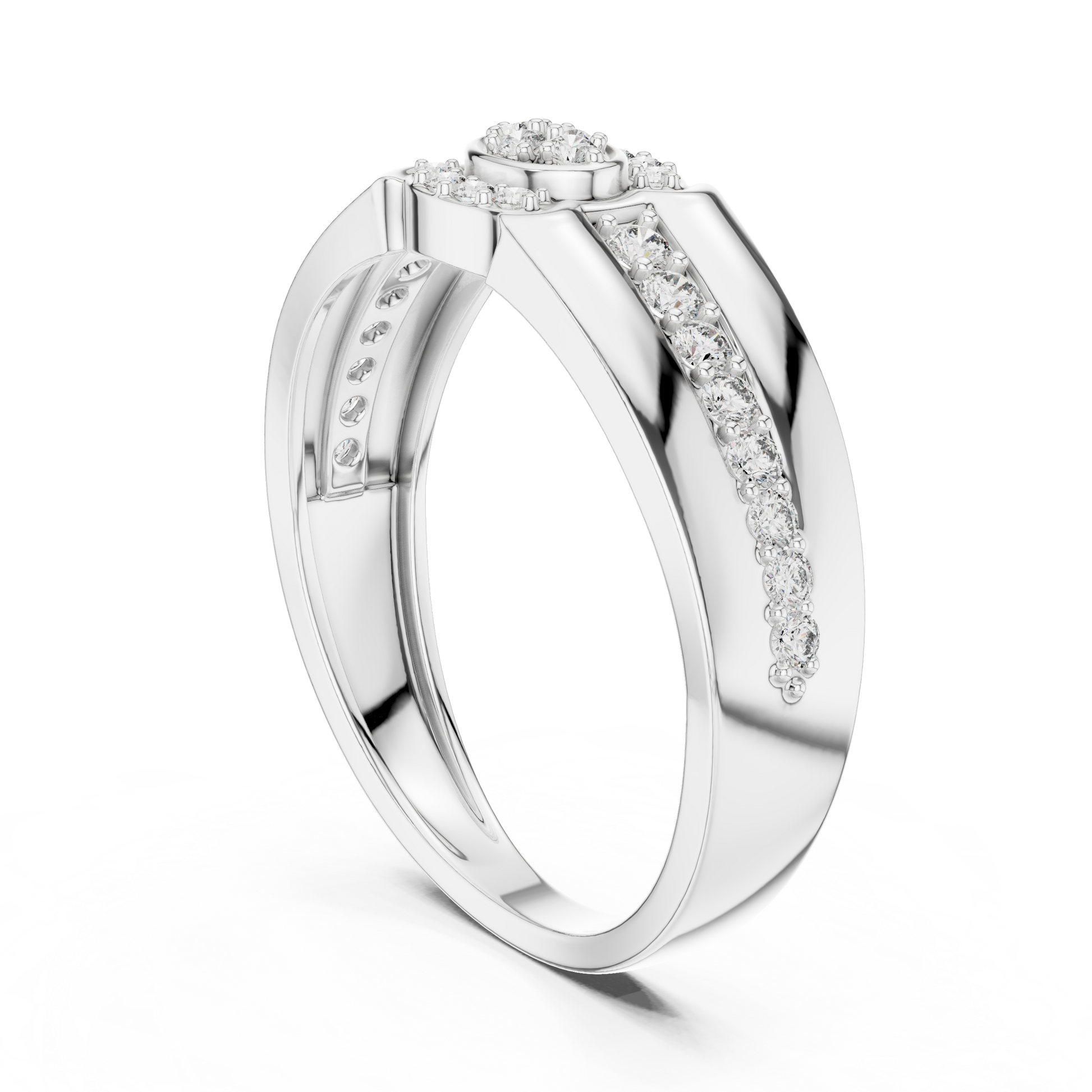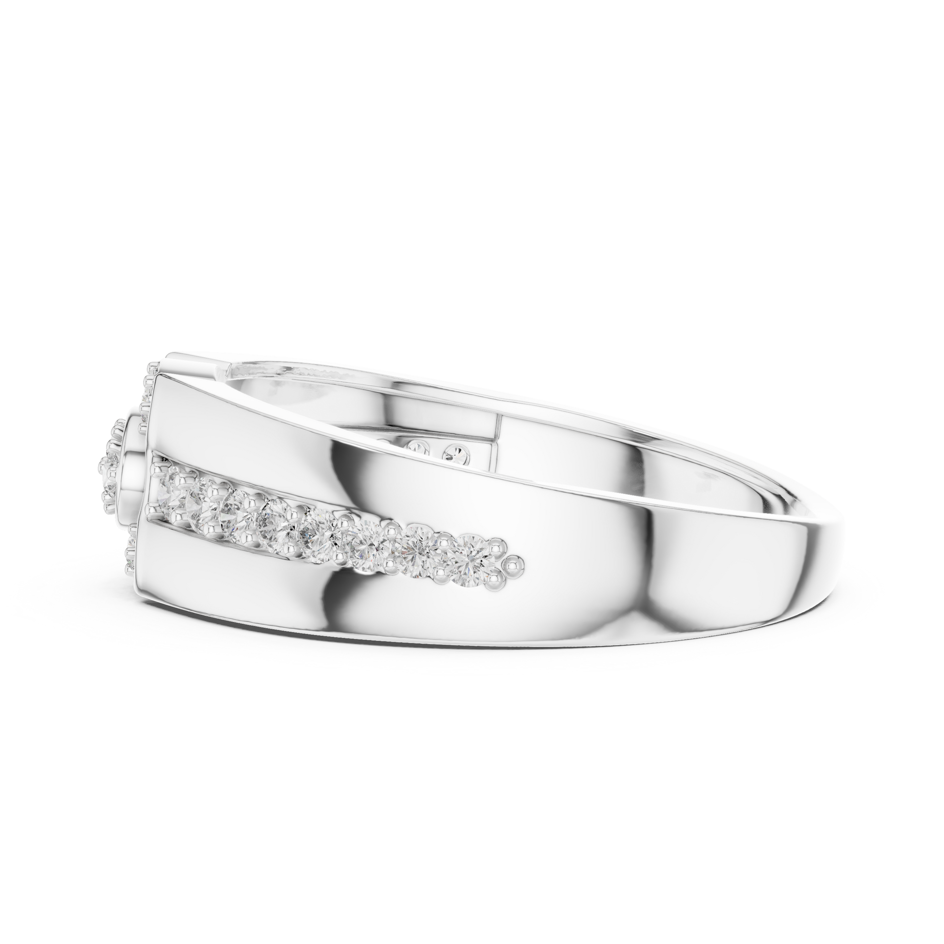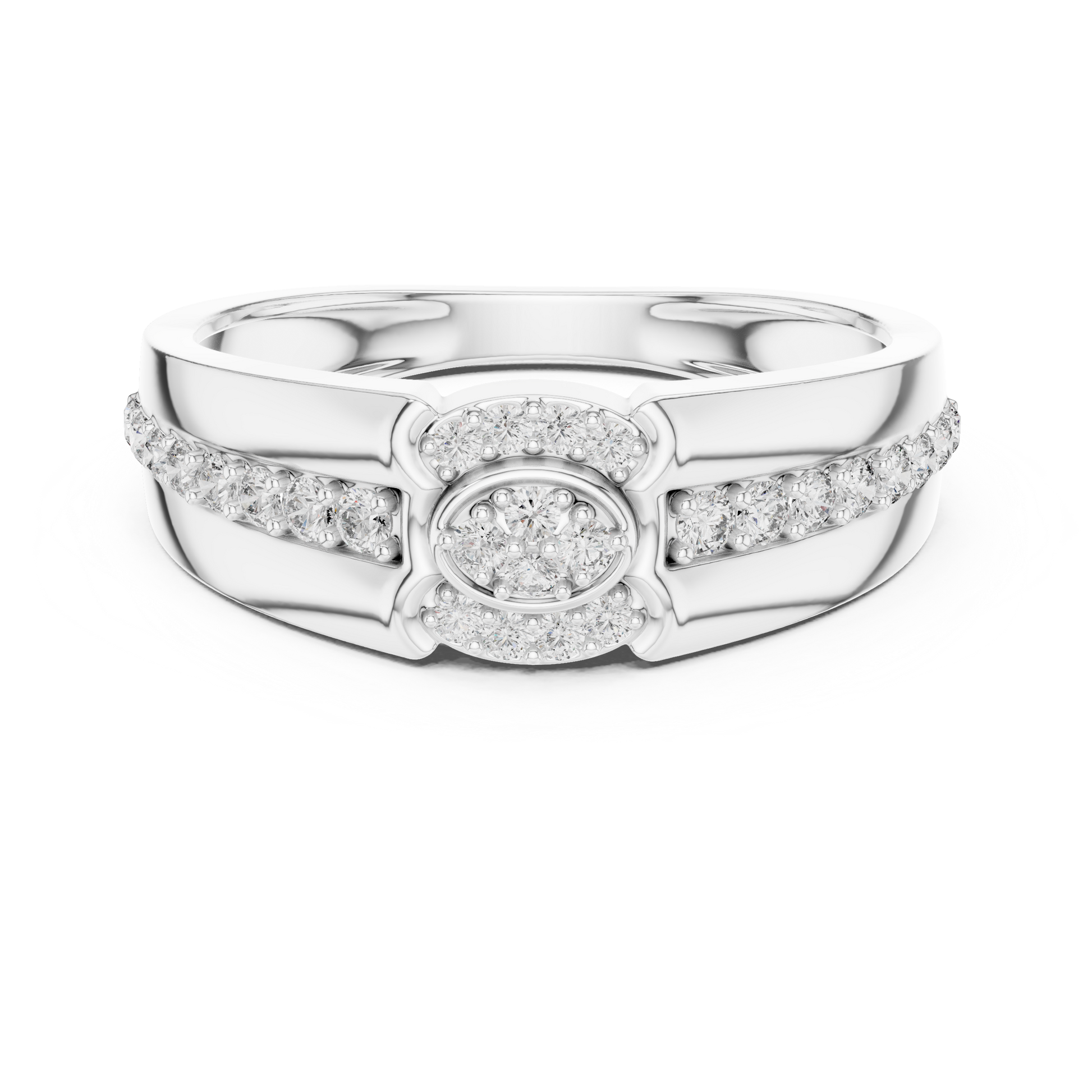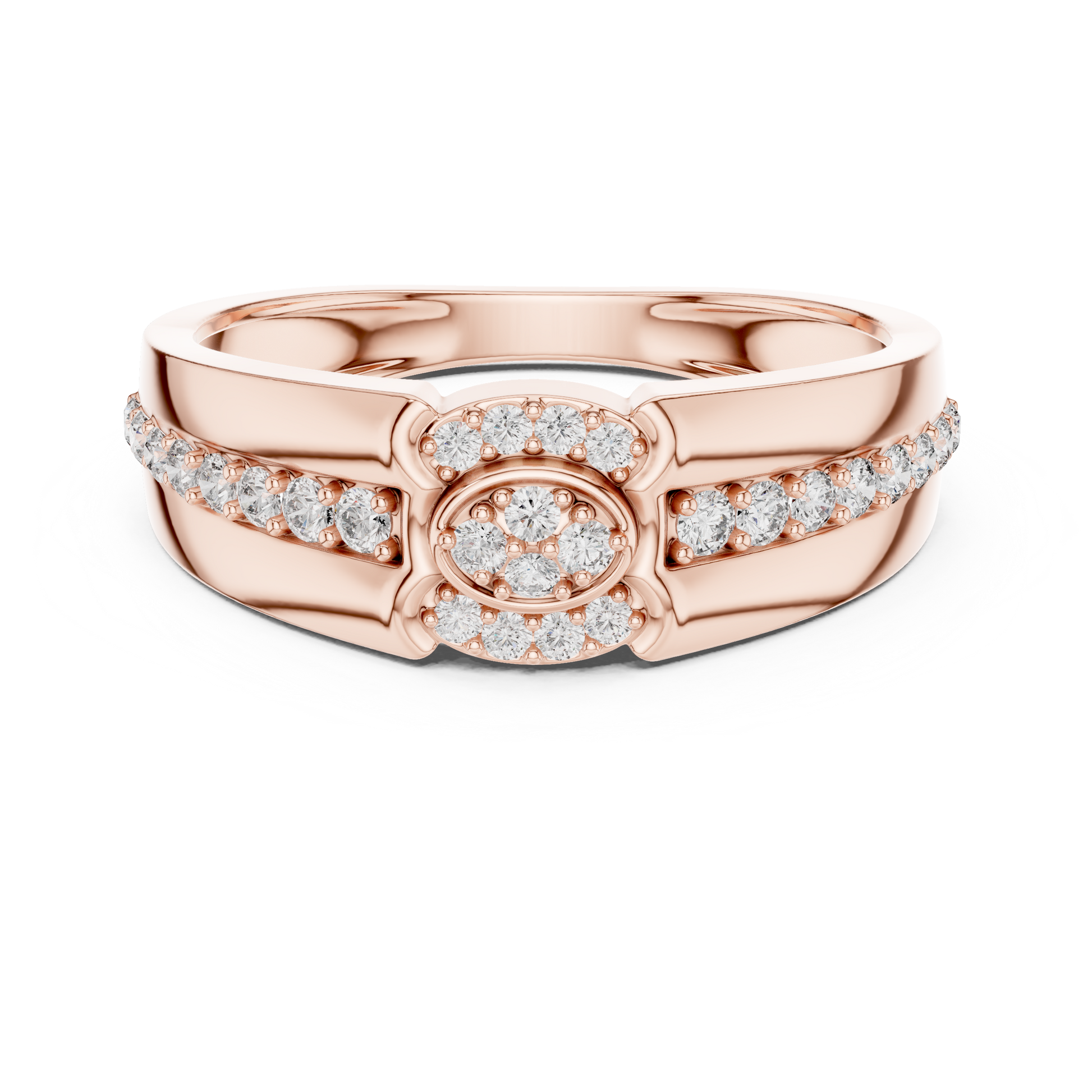 This exquisite ring from IVEVAR LUXURY showcases a powerful inspired silhouette crafted in rich gold. The design features a raised round diamond cluster at the center, framed by pave-set diamonds that flow gracefully along the shoulders of the band. With its wide structure, high-polish finish, and antique-inspired detailing, this ring delivers a timeless yet bold presence.