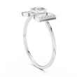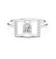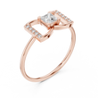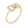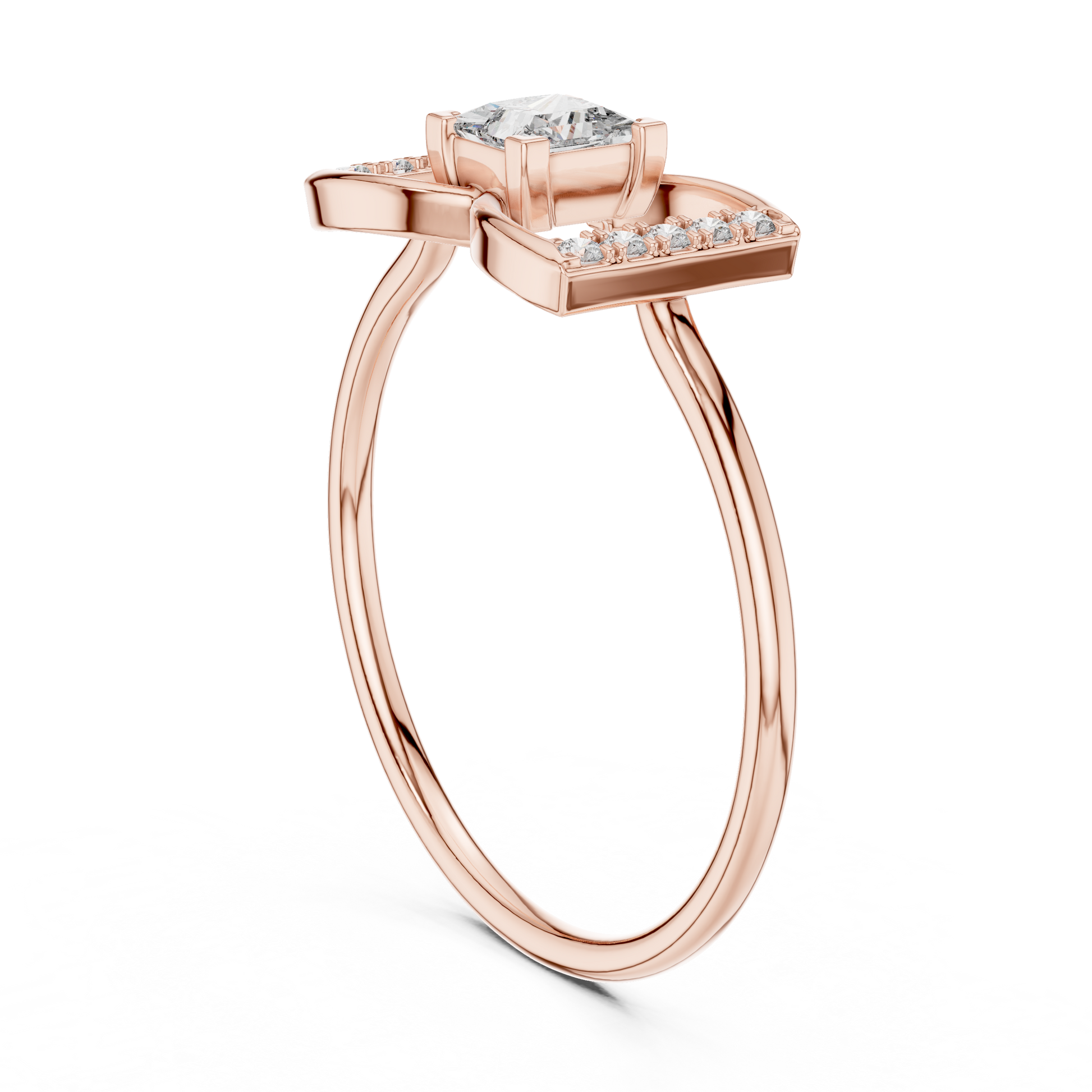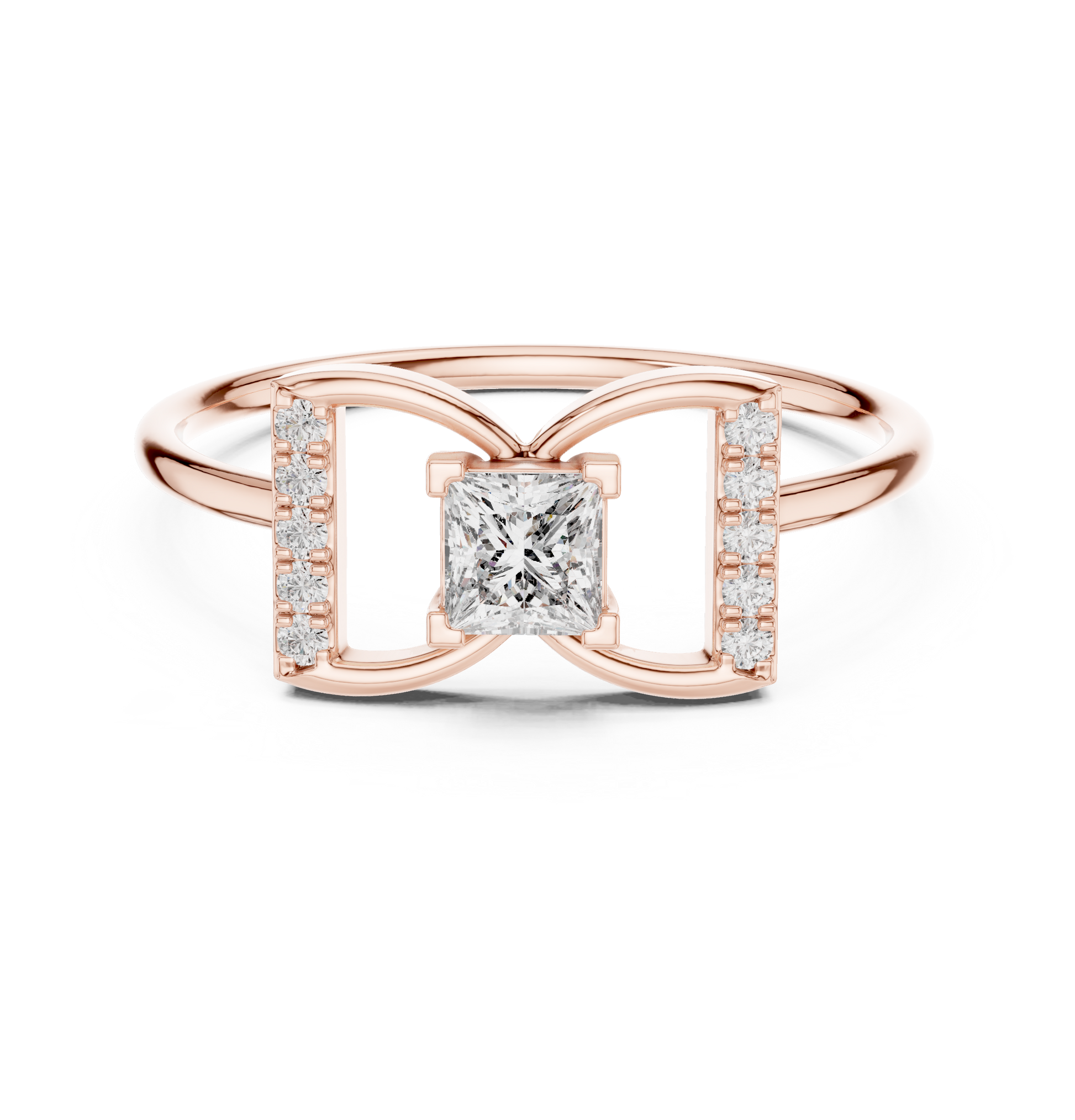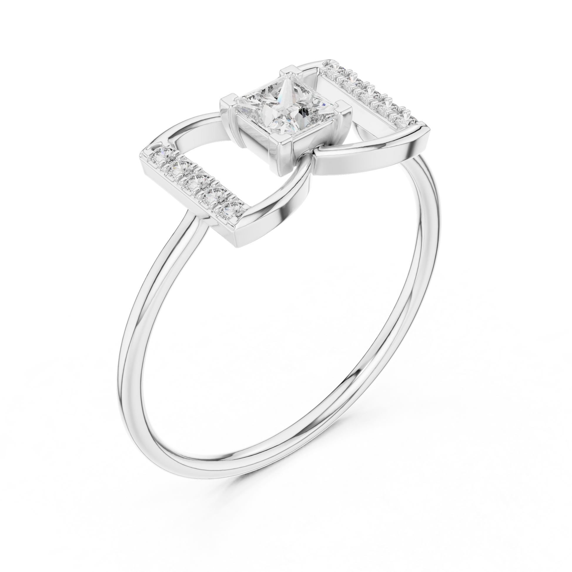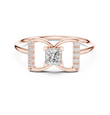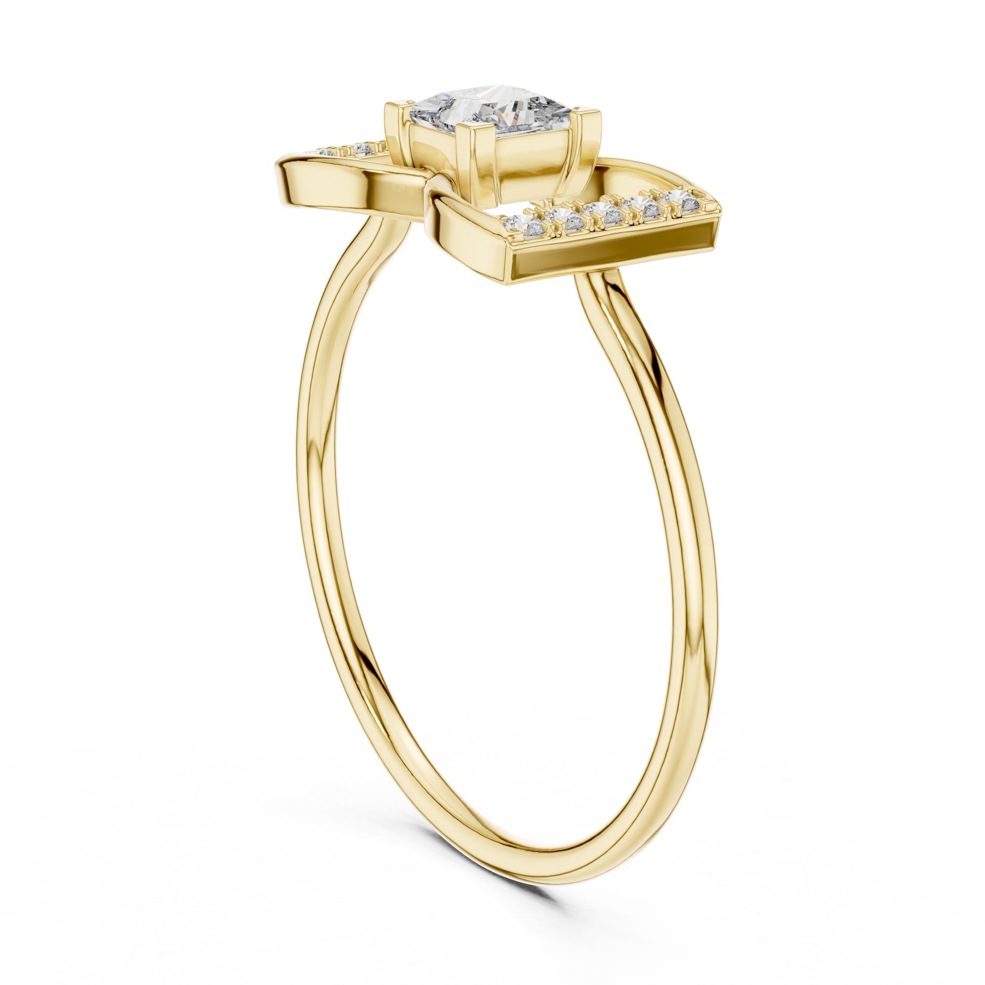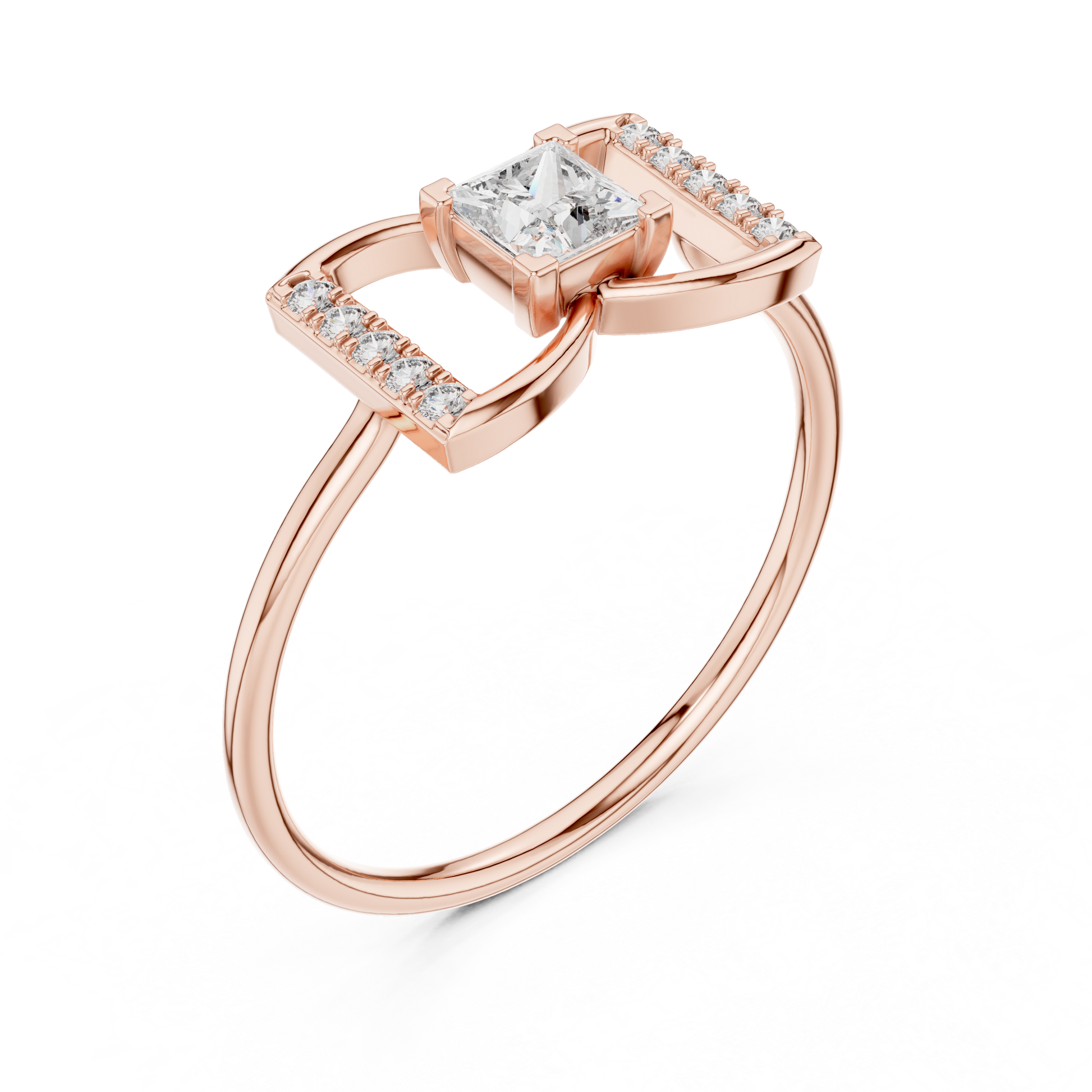This contemporary gold ring features a radiant princess-cut diamond suspended within a bold open geometric frame. Pavé-set round diamonds accent each side, adding brilliance while enhancing the architectural symmetry of the design. The open structure creates depth and light, allowing the center stone to shine with striking clarity. Finished with a smooth, polished band, this ring is perfect for those who appreciate modern luxury, clean lines, and distinctive bridal or statement jewelry.
