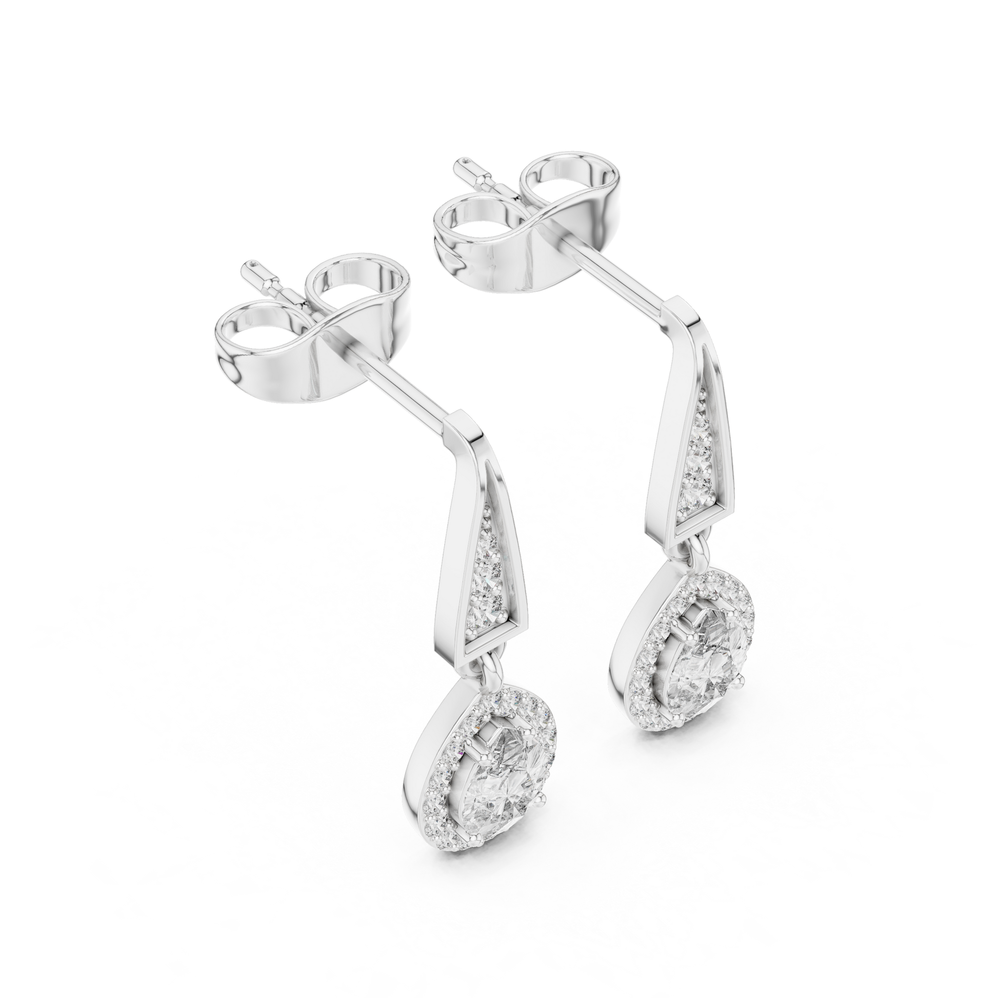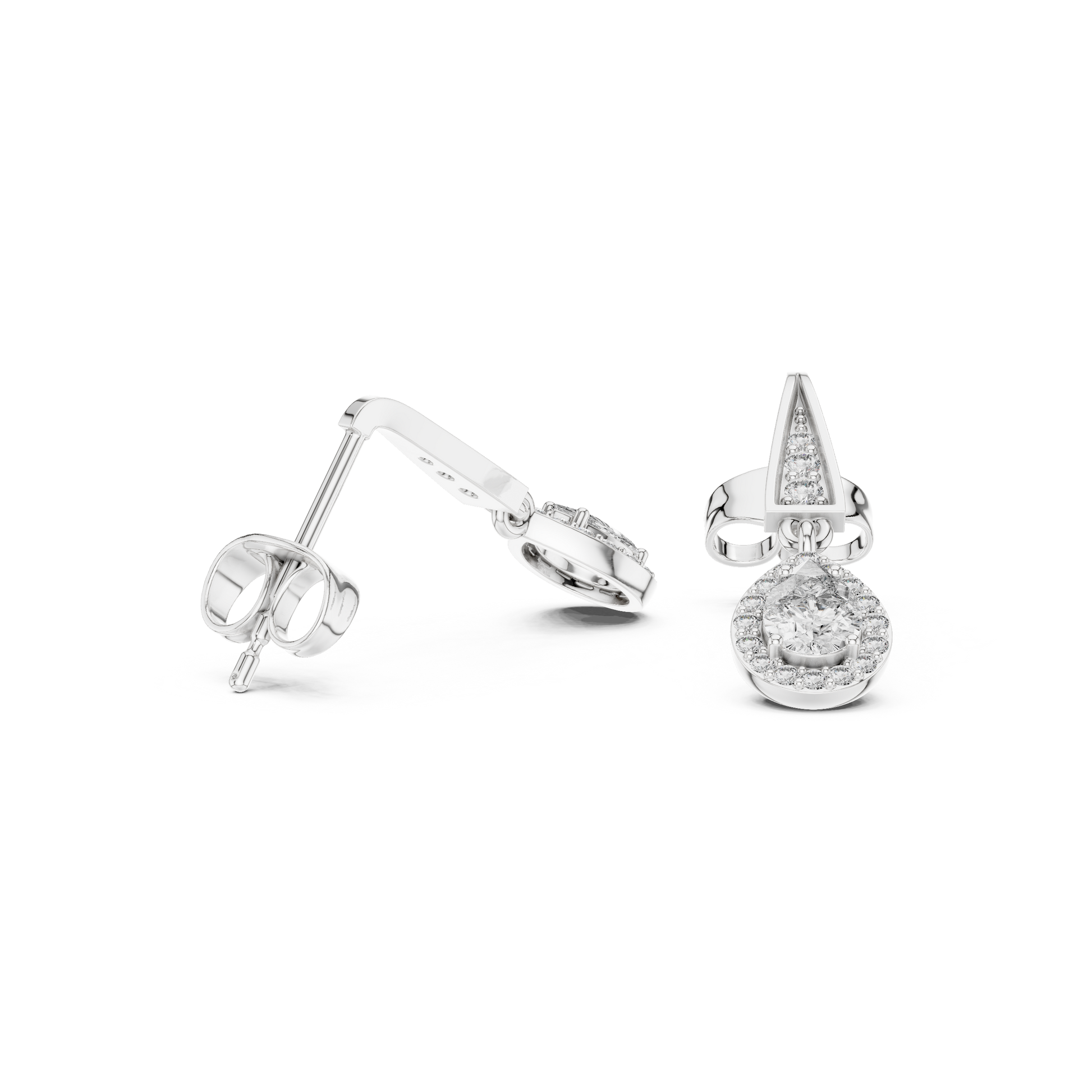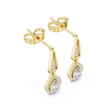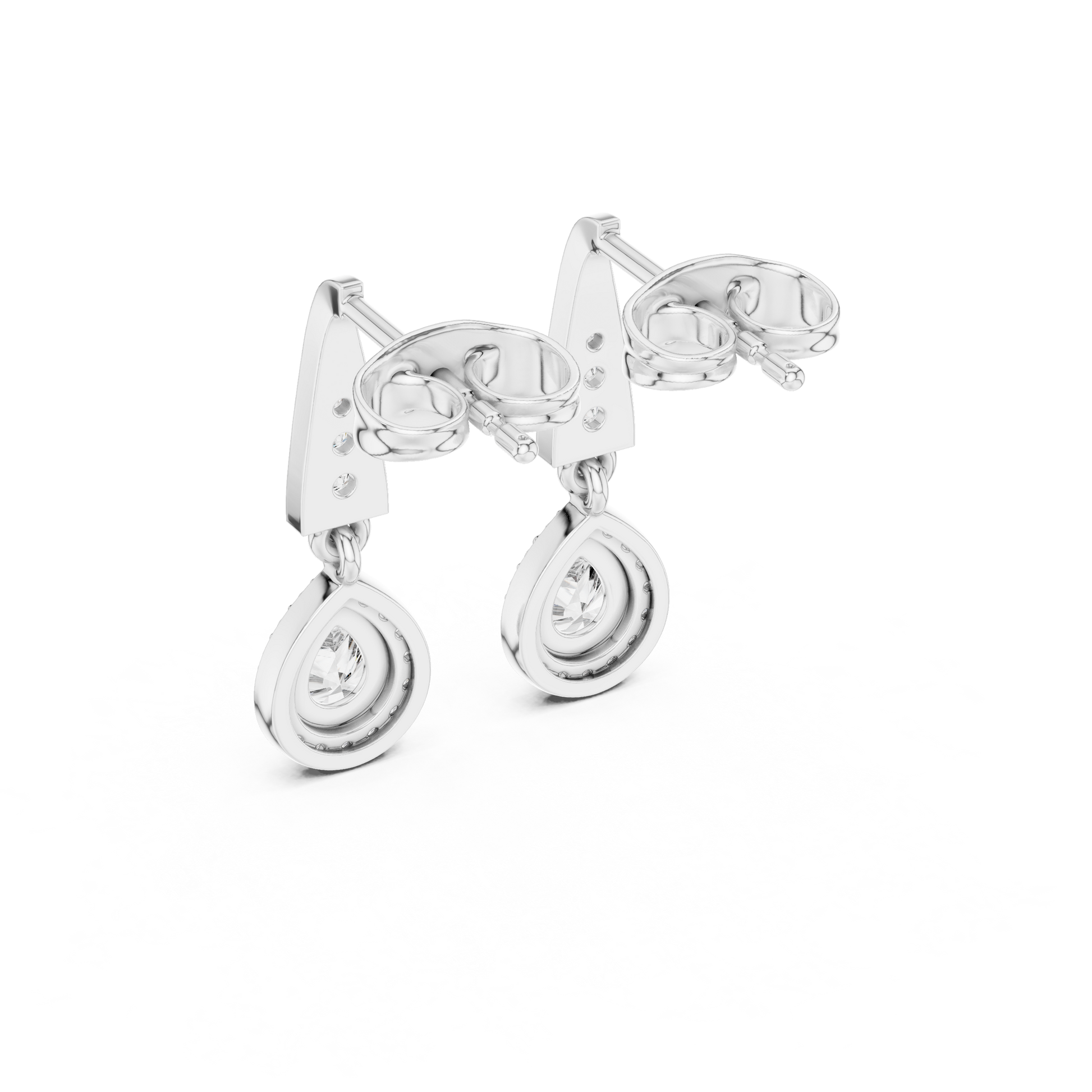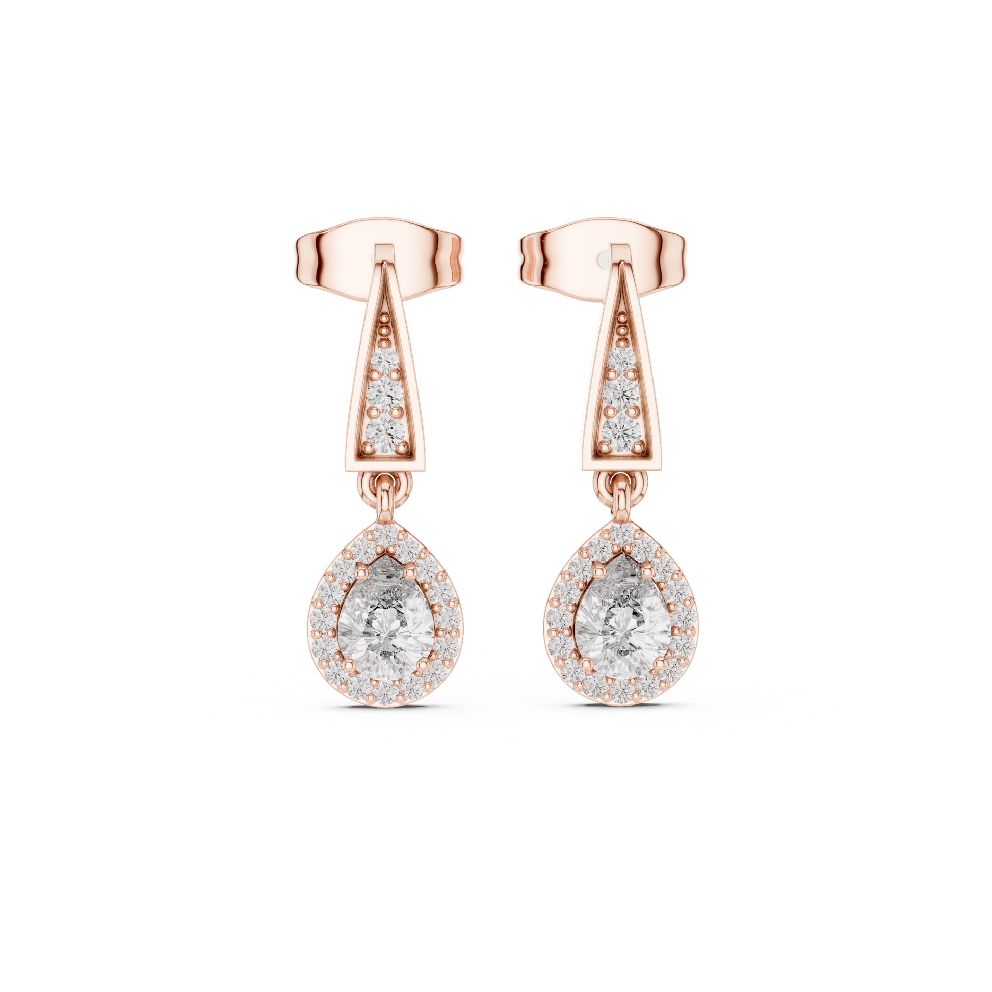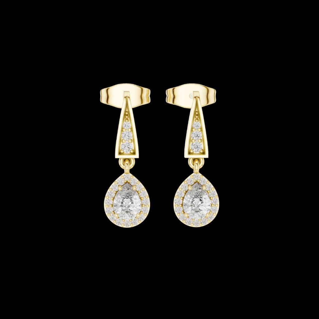 Gracefully refined and irresistibly radiant, these pear-shaped halo drop earrings are crafted in polished gold for a timeless yet contemporary appeal. Each earring features a luminous pear-cut centerpiece encircled by a delicate pave halo, creating soft sparkle and elegant dimension. The tapered upper link, adorned with subtle pave accents, adds length and fluid movement while enhancing the overall silhouette. Perfect for weddings, festive occasions, or evening glamour, these earrings embody classic beauty with modern sophistication—designed to elevate every look with effortless luxury.