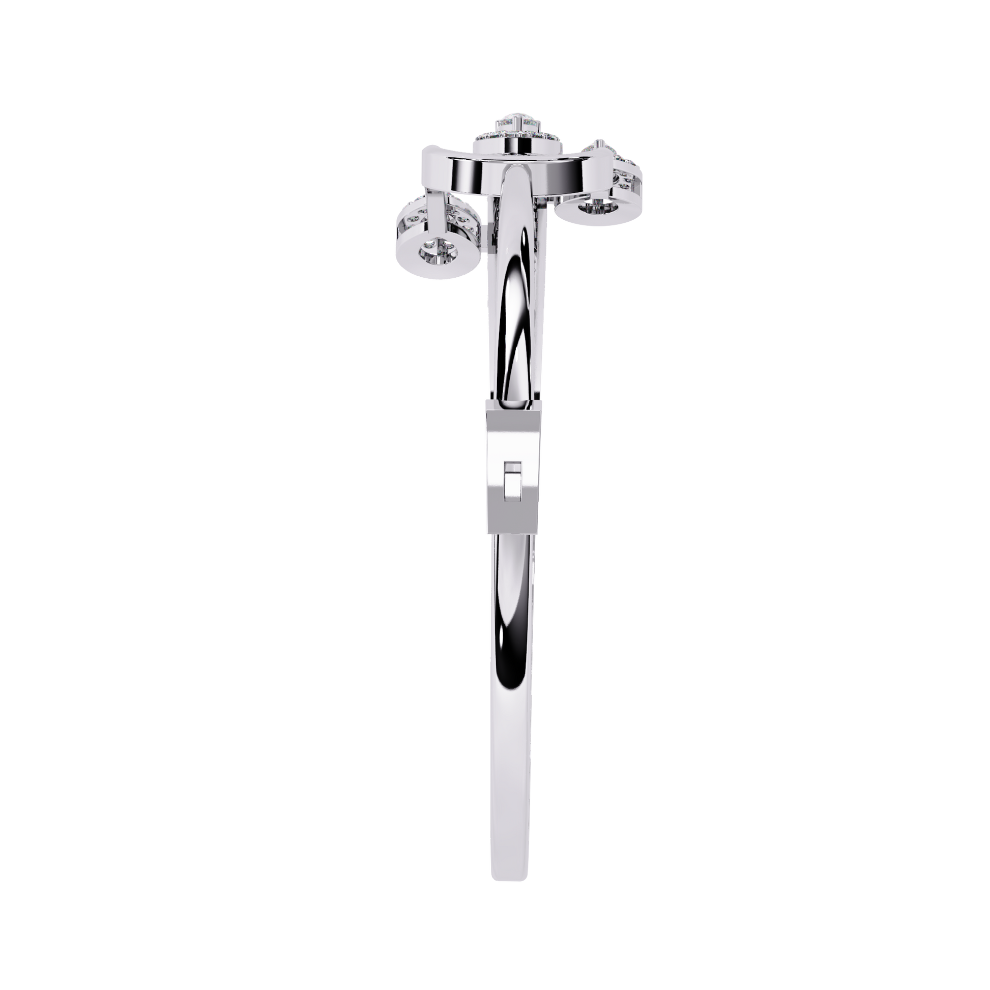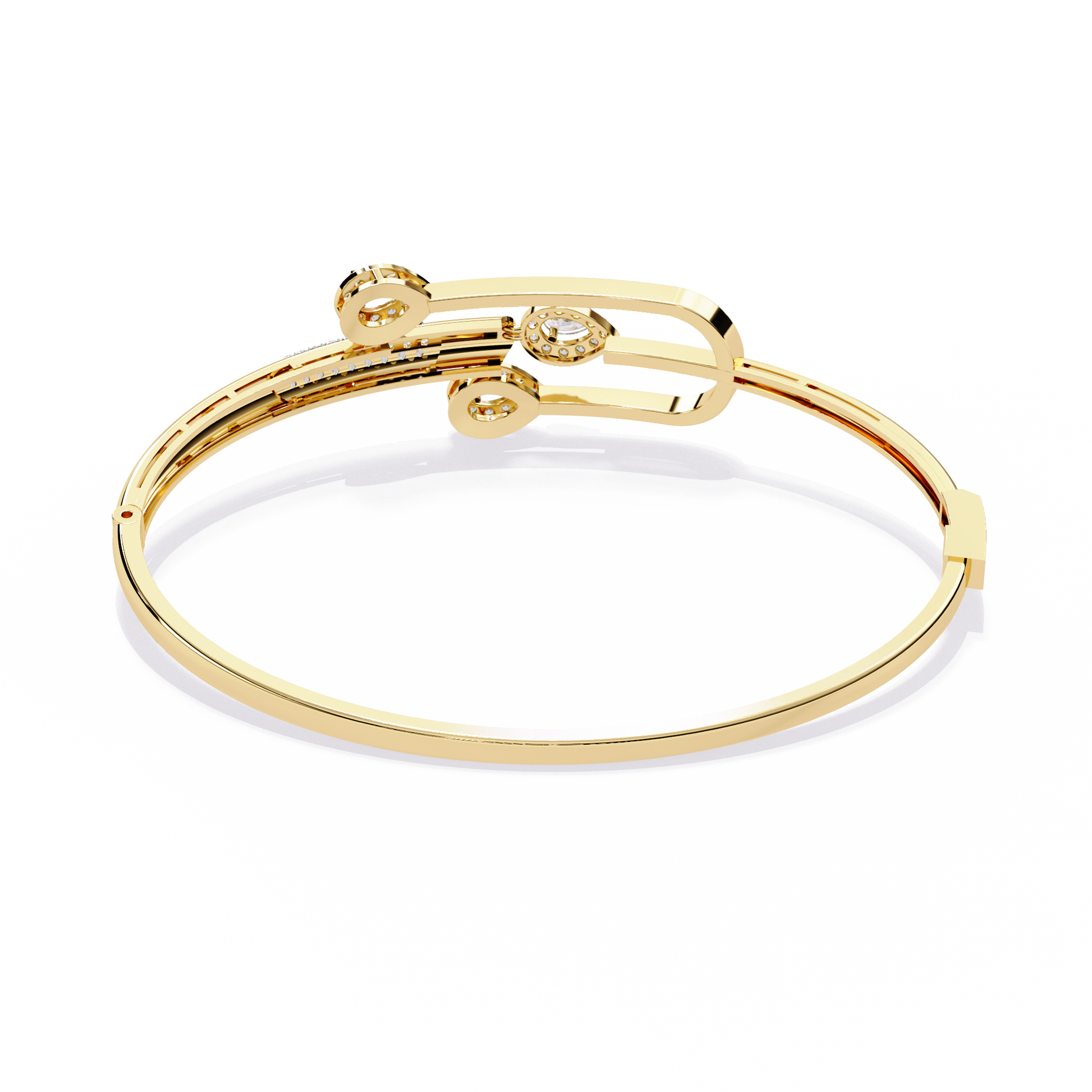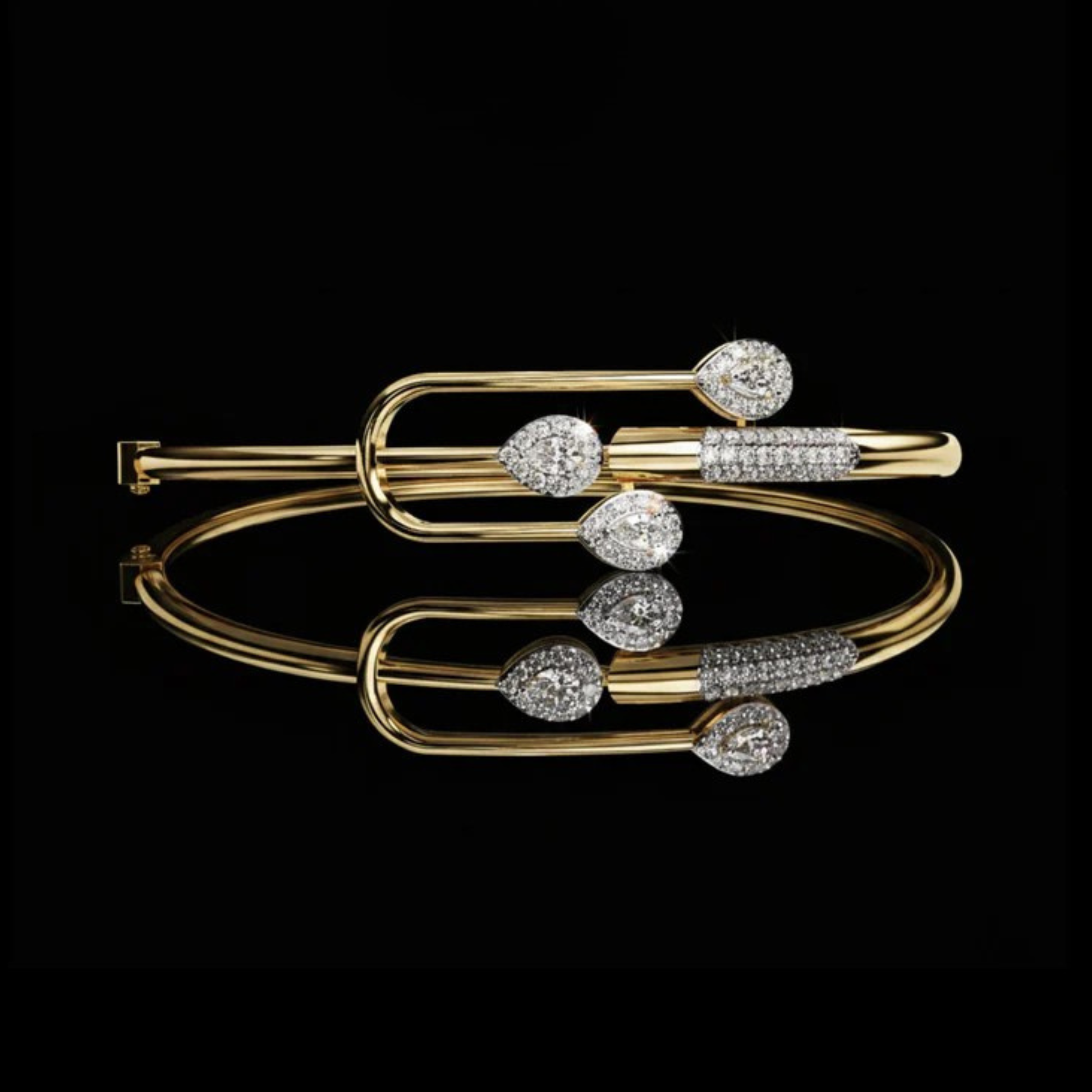 This stunning open bangle is a perfect fusion of modern design and timeless elegance. Adorned with pear-shaped diamonds encircled by brilliant halo, the bracelet radiates unmatched sparkle and sophistication. The sleek open structure adds a touch of contemporary flair, while the pave-set diamonds along the band enhance its luxurious appeal. Ideal for both special occasions and everyday glamour, this masterpiece embodies refinement and grace.