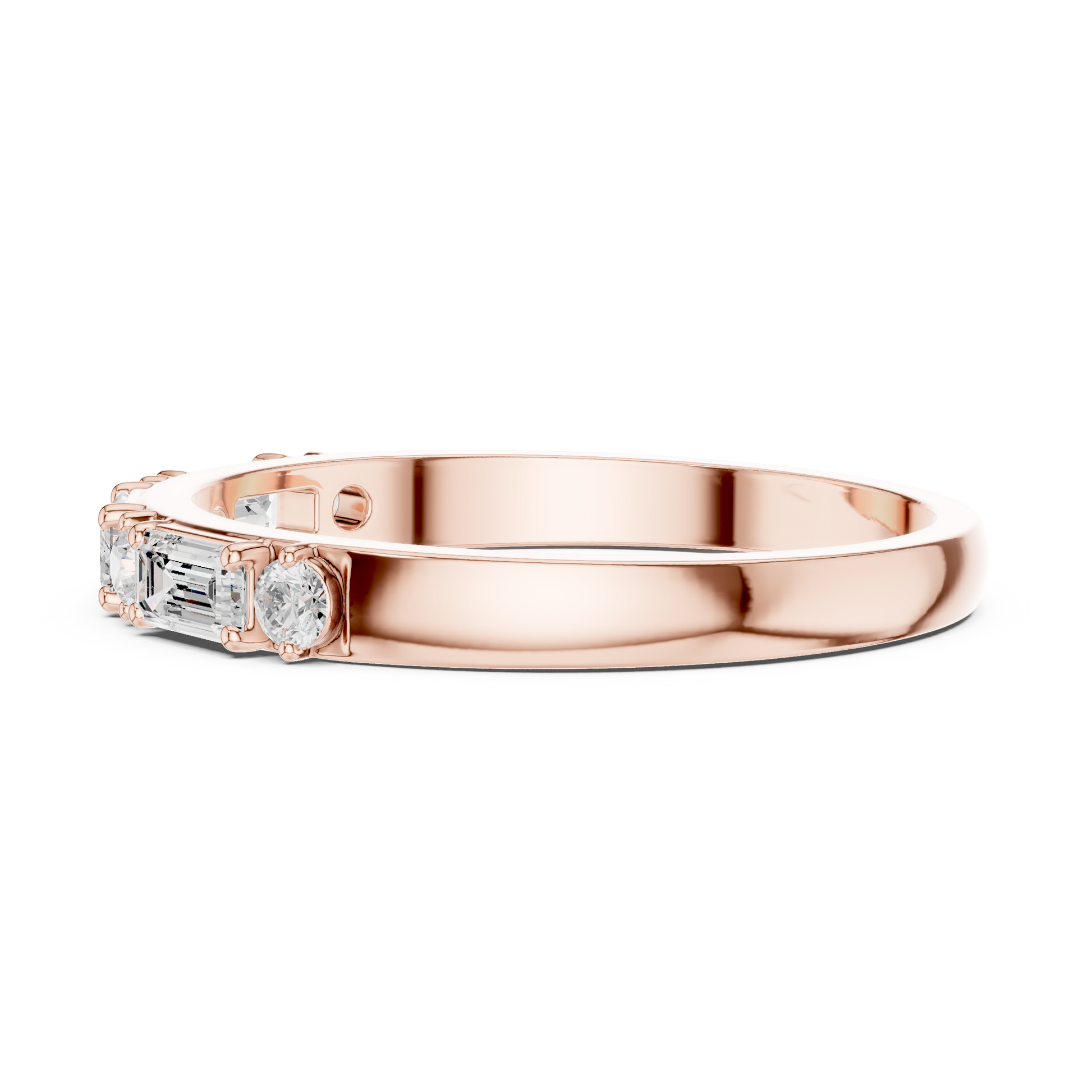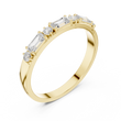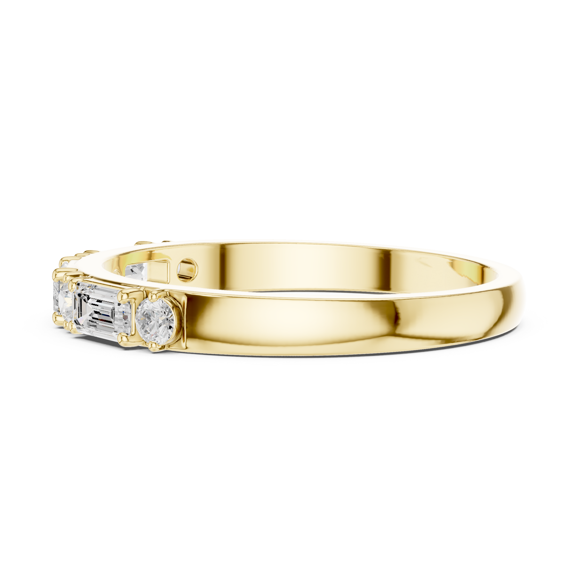 This refined gold band showcases a striking sequence of alternating baguette and round diamonds set in a sleek linear arrangement. The clean geometry of baguette cuts blends beautifully with the soft sparkle of round diamonds, creating a balanced and sophisticated design. Perfect for stacking, wedding wear, or modern luxury styling, this ring delivers timeless elegance with contemporary precision.